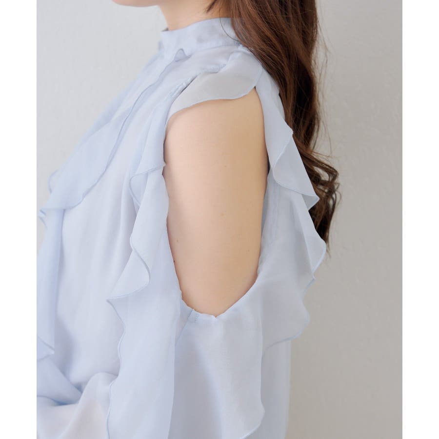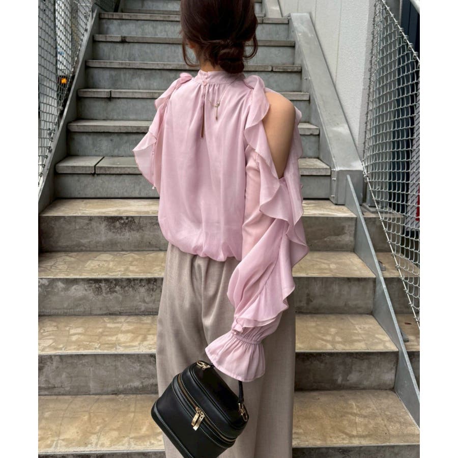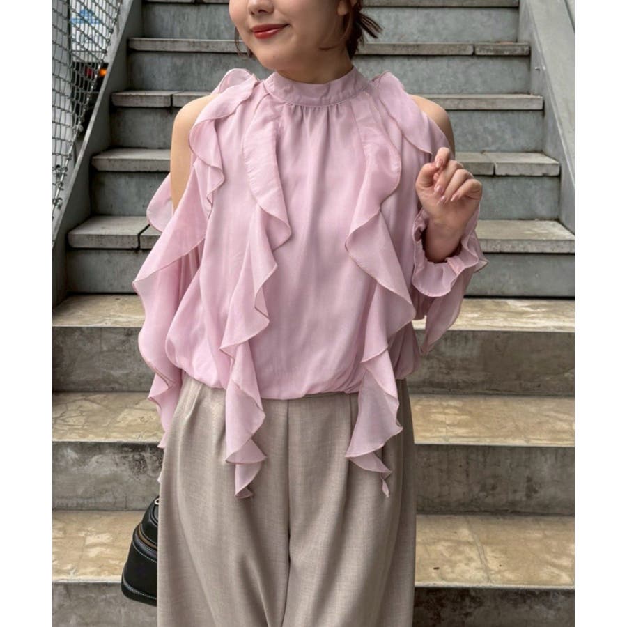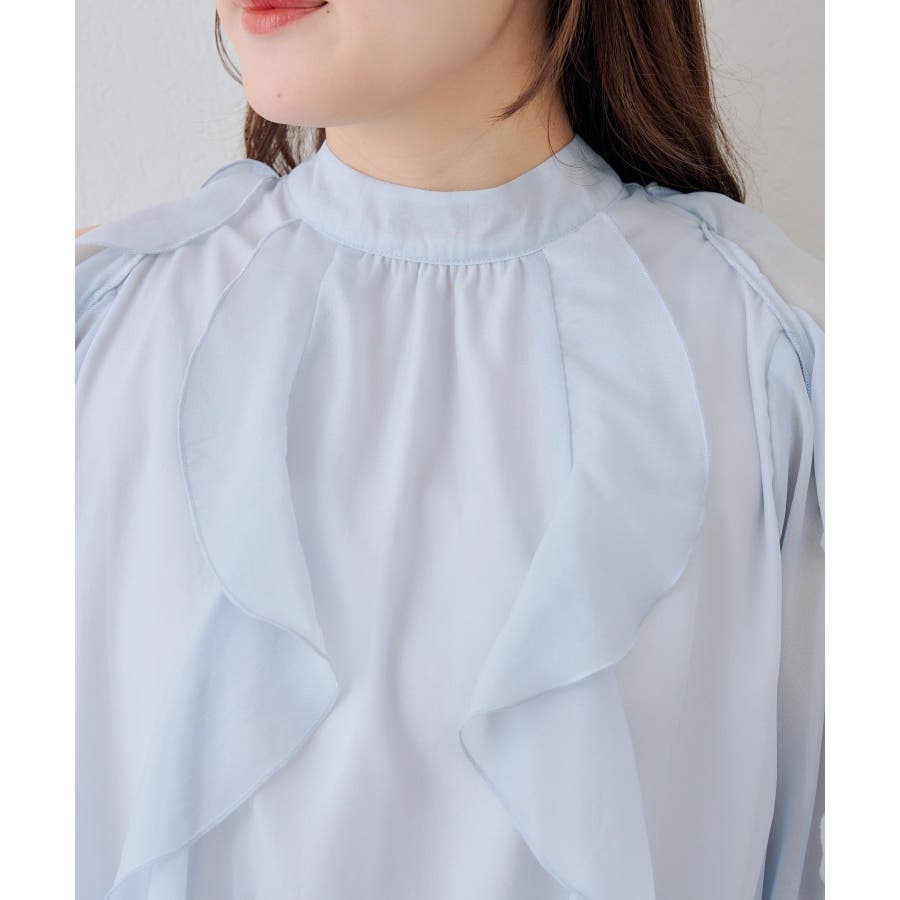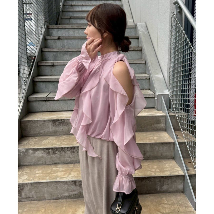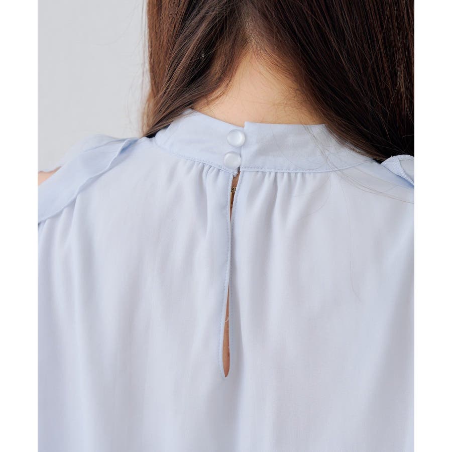 ・ショルダー部分のスリットとフリルデザインが女性らしい華やかな印象を添える1枚です。