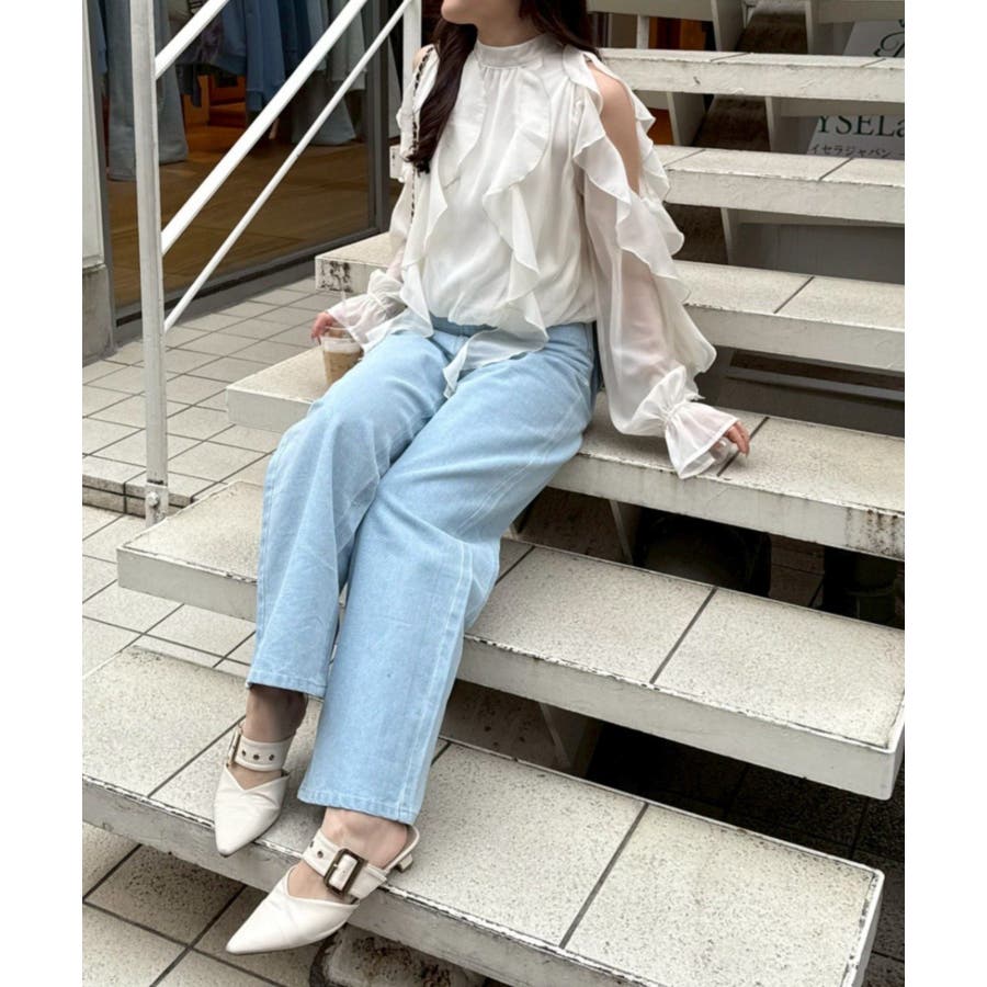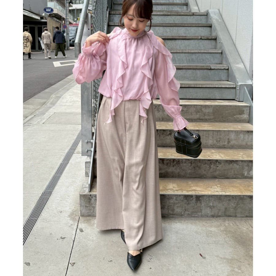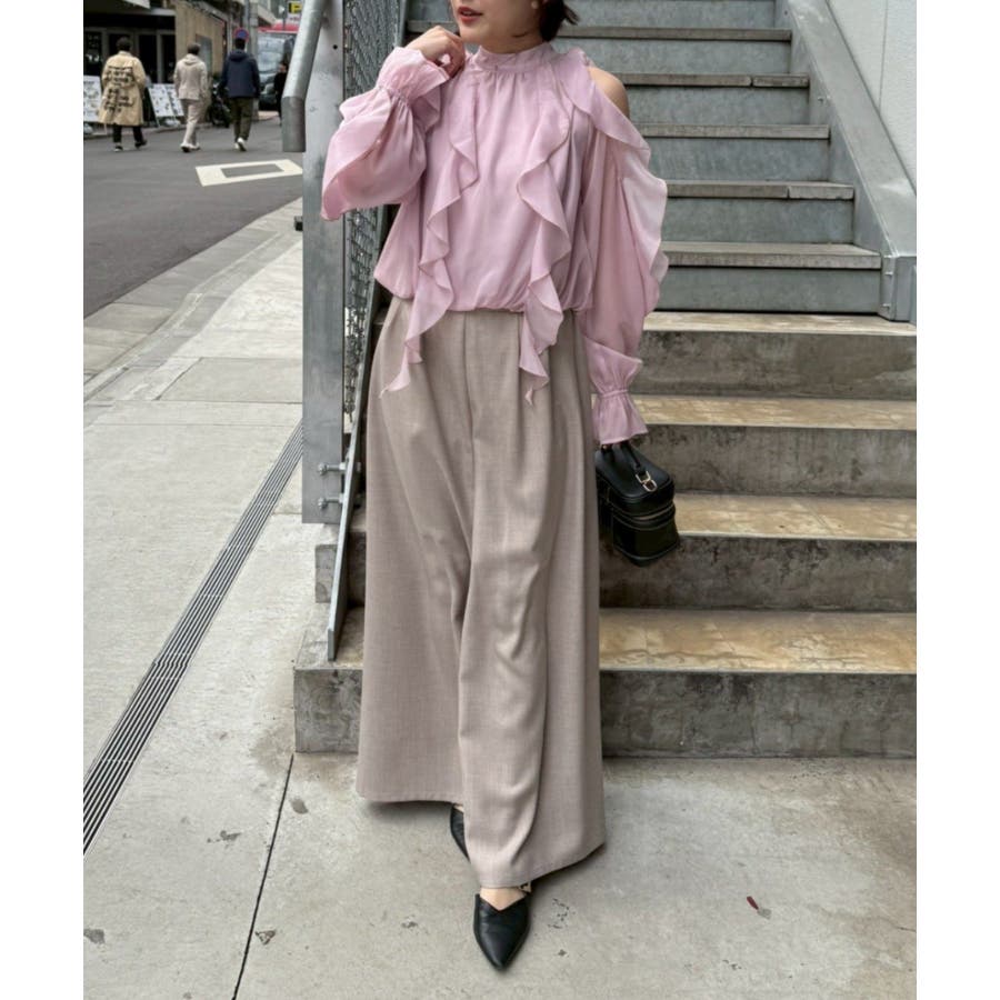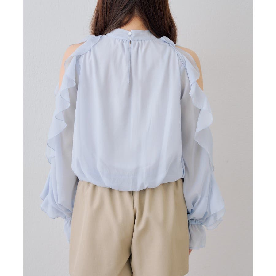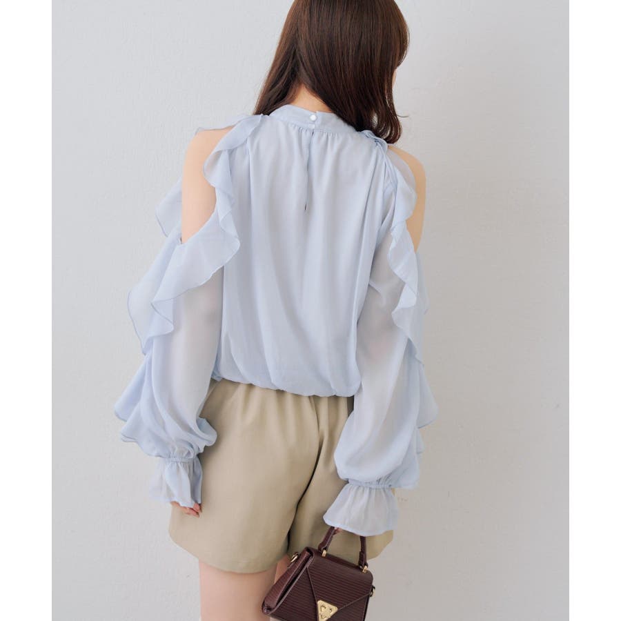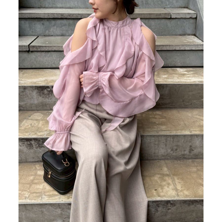 ・ショルダー部分のスリットとフリルデザインが女性らしい華やかな印象を添える1枚です。