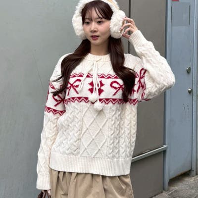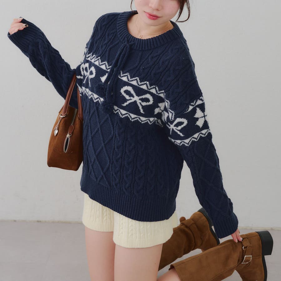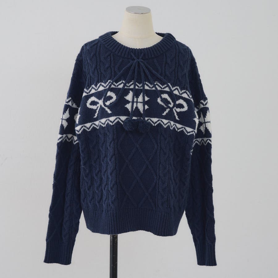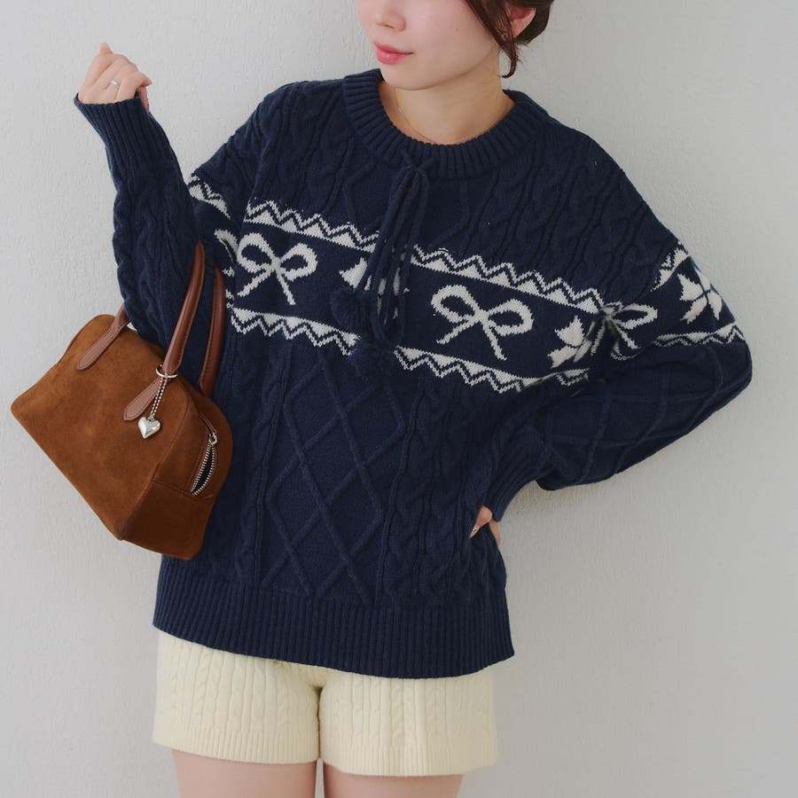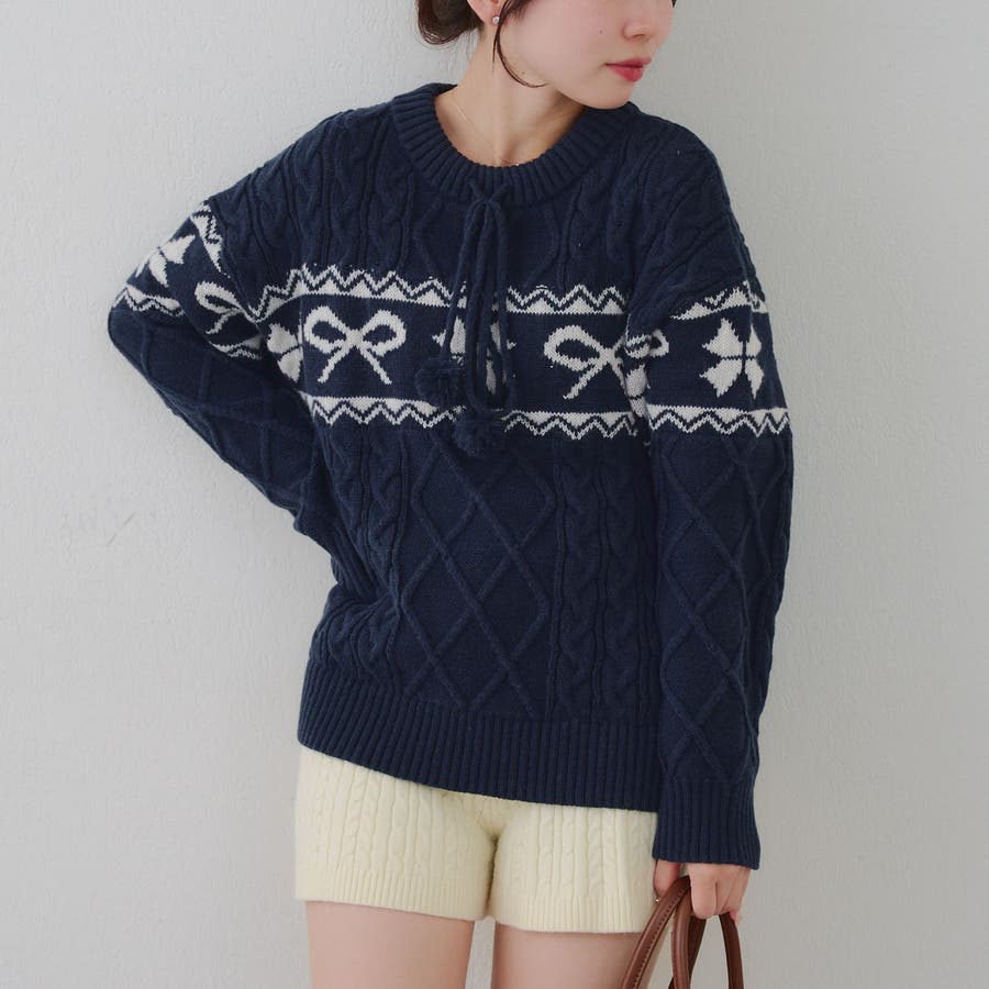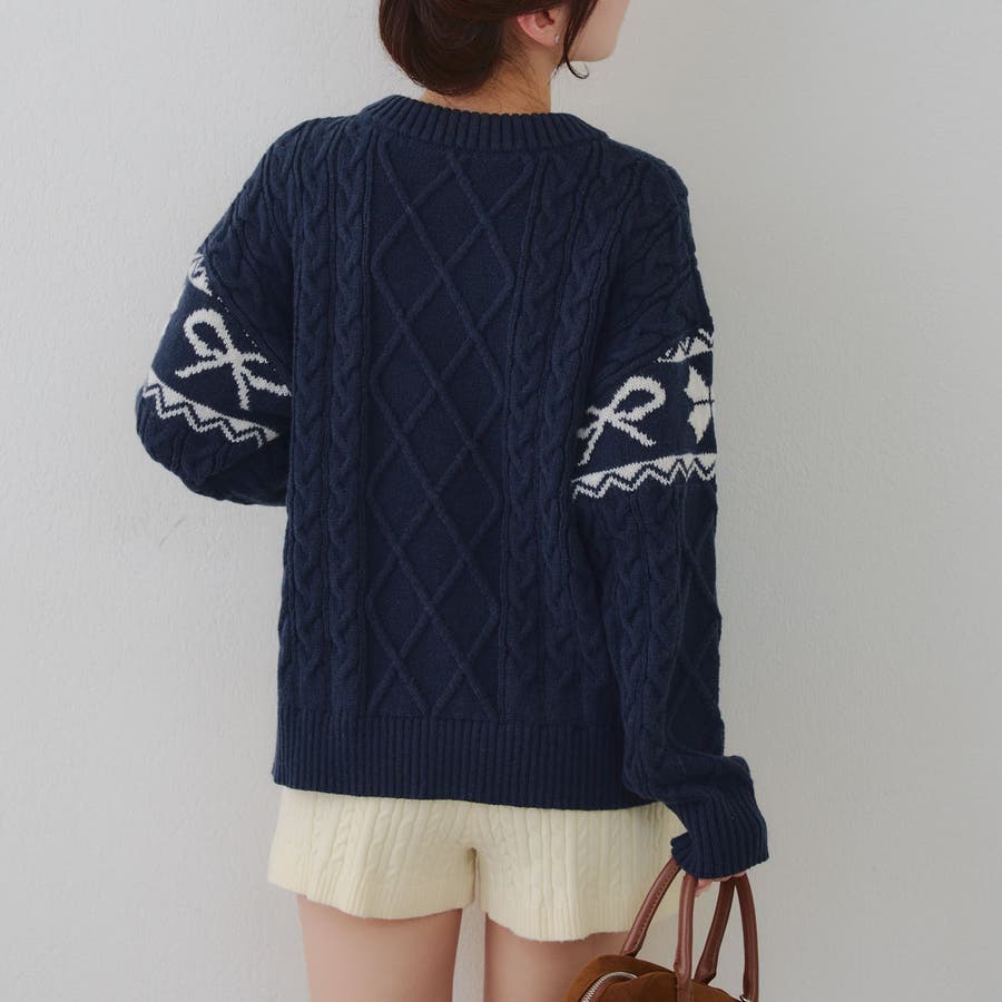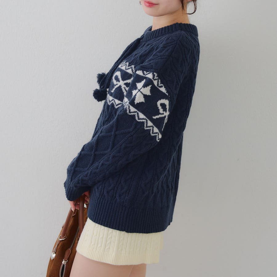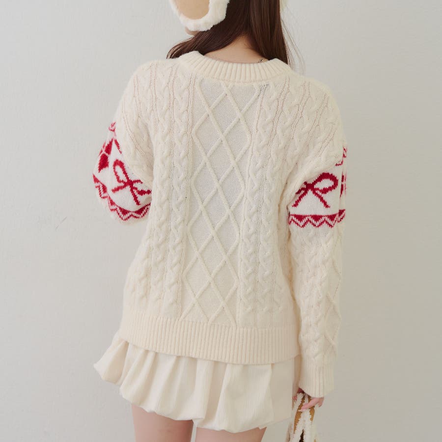 ・ケーブル編みとリボン柄が主役級のニットプルオーバー