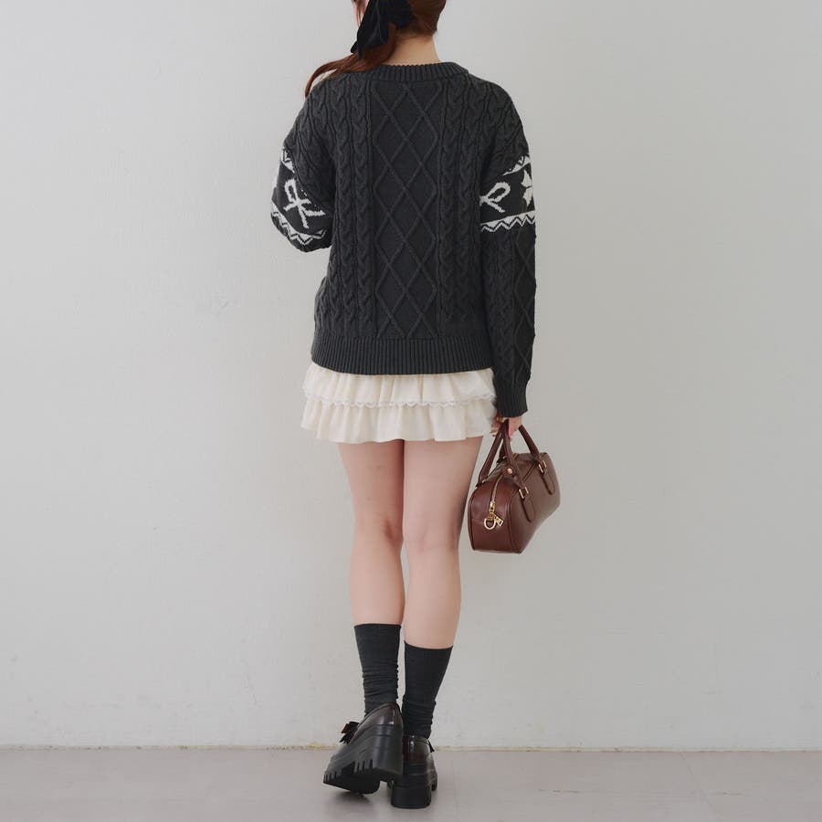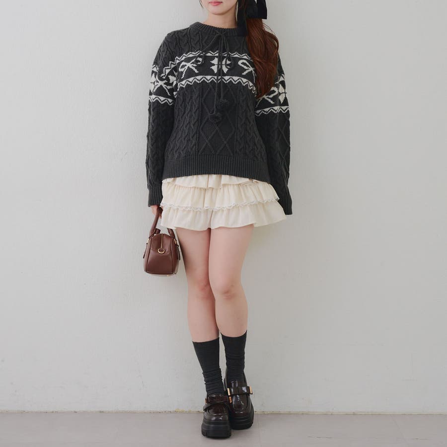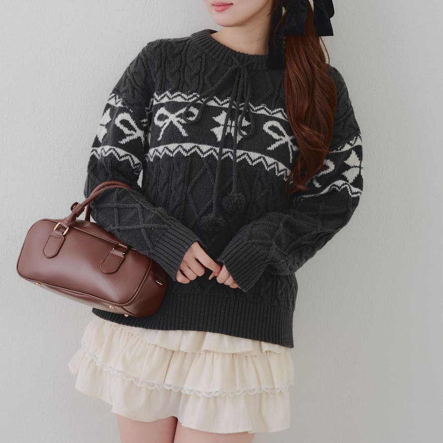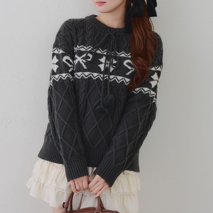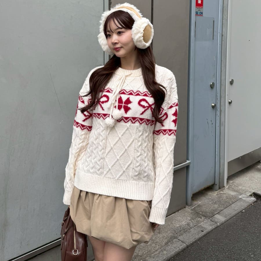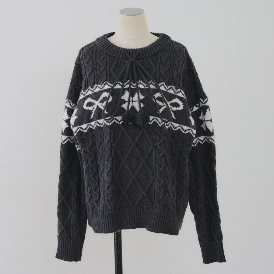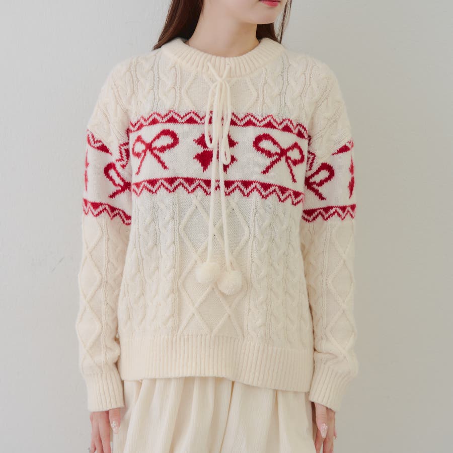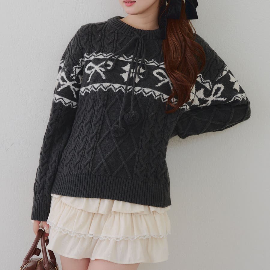 ・ケーブル編みとリボン柄が主役級のニットプルオーバー