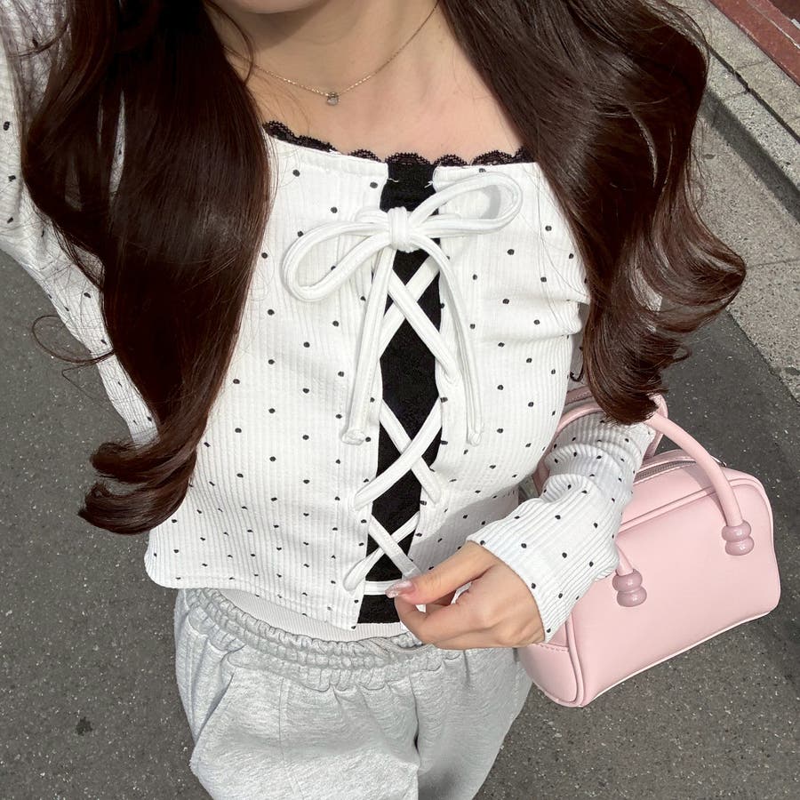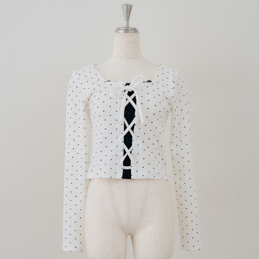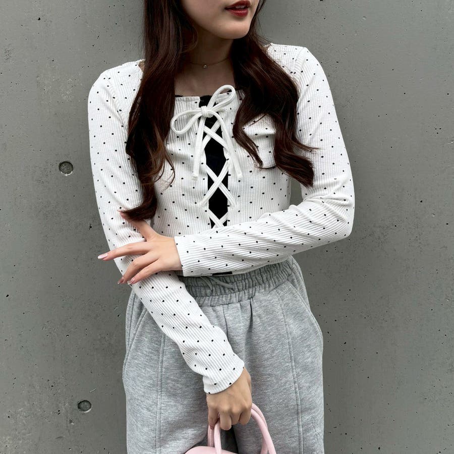 RMAF Remindmeandforever olivedesolive niceclaup 春 春服 春物 韓国 韓国系 韓国風 韓国ファッション 10代 20代 30代 大人 人気 大人かわいい 大人カジュアル トレンド 新作 プチプラ トップス レースアップトップス レースアップ ドット レース 0861060210