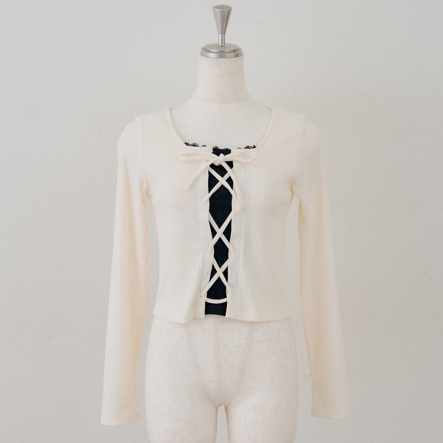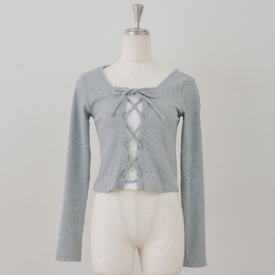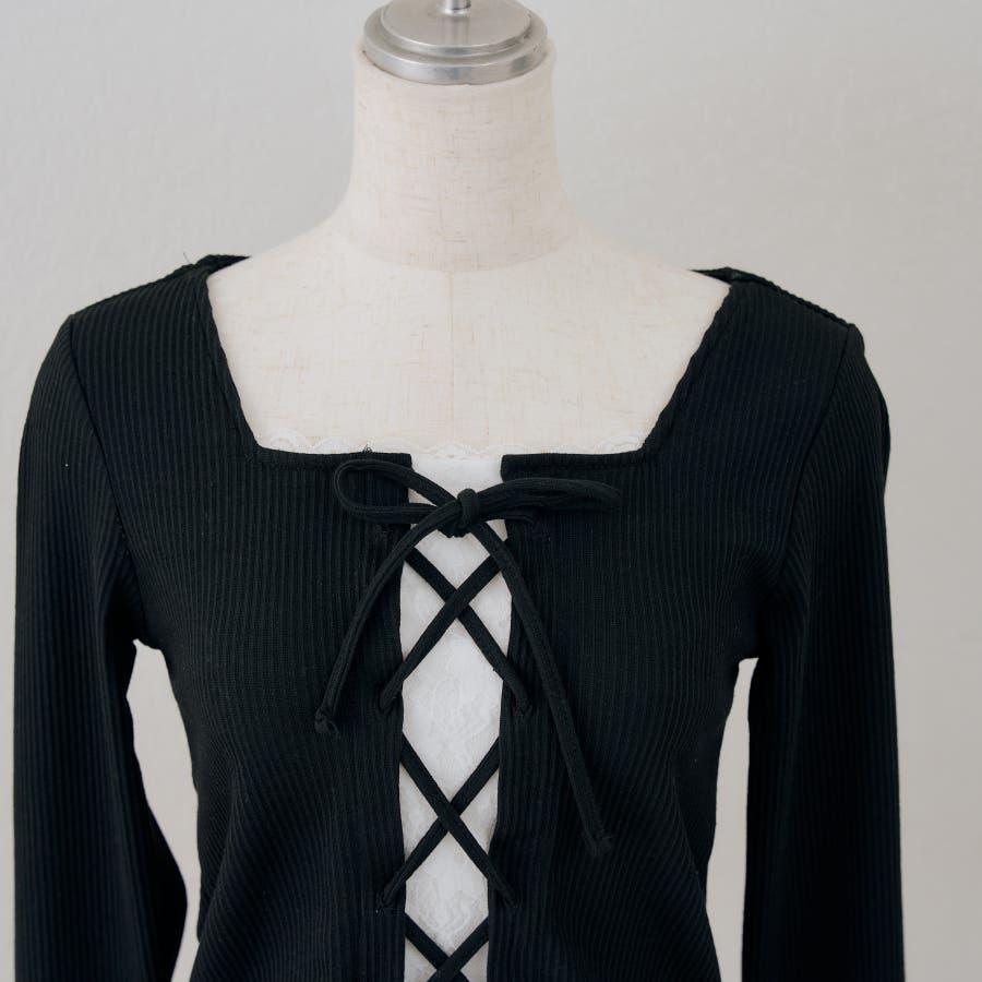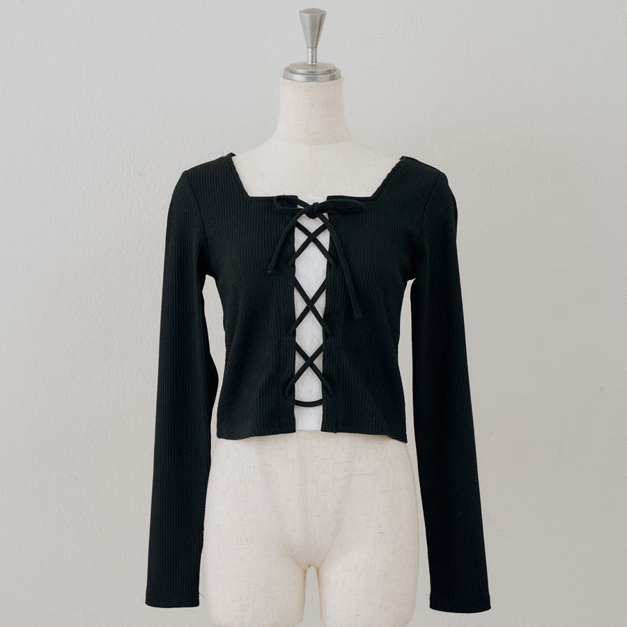 ・トレンドのレースアップデザインが目を惹くリブトップス