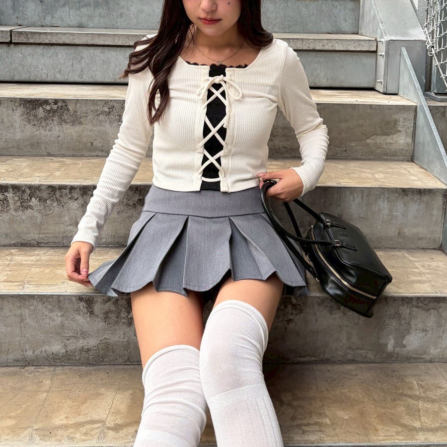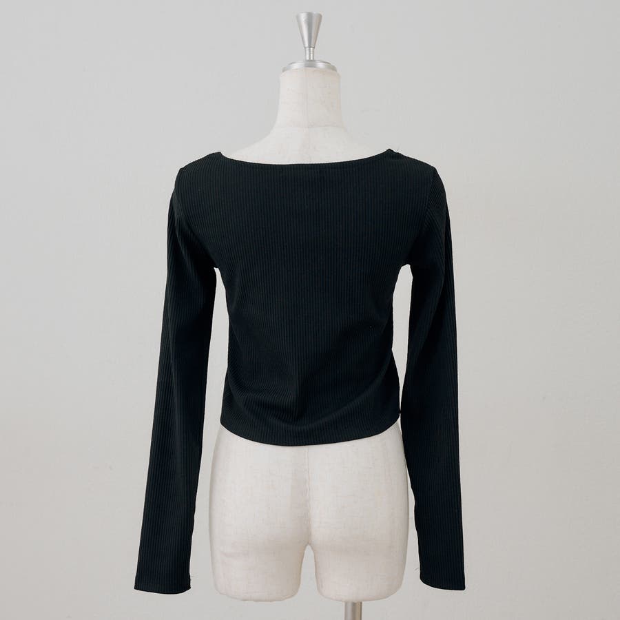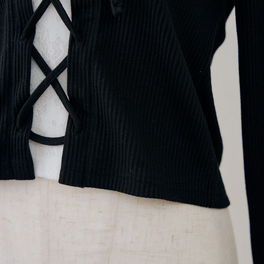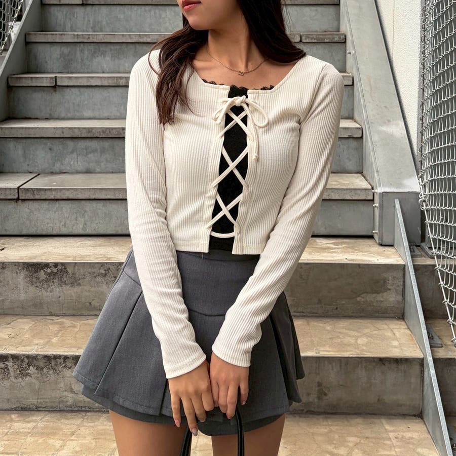・トレンドのレースアップデザインが目を惹くリブトップス