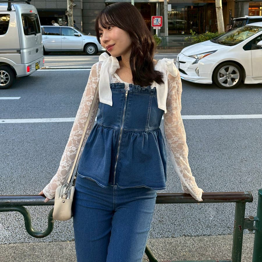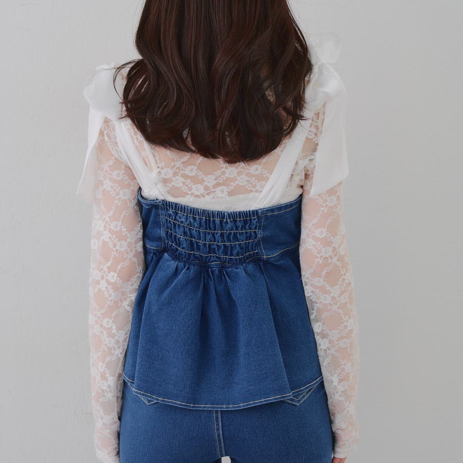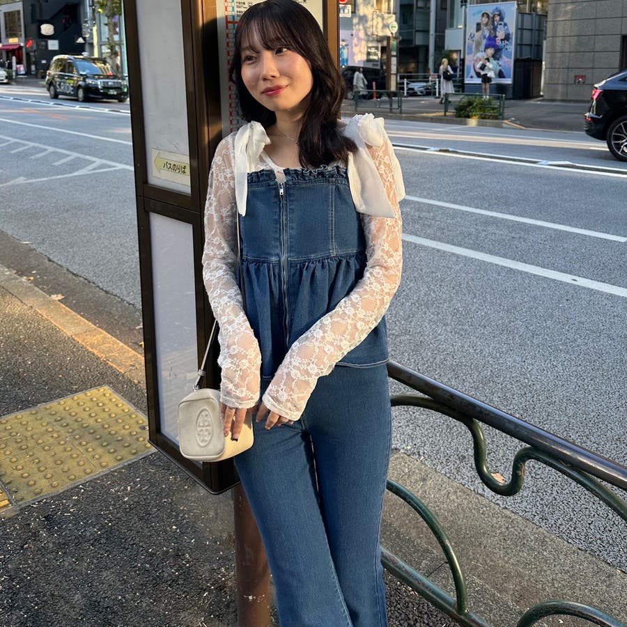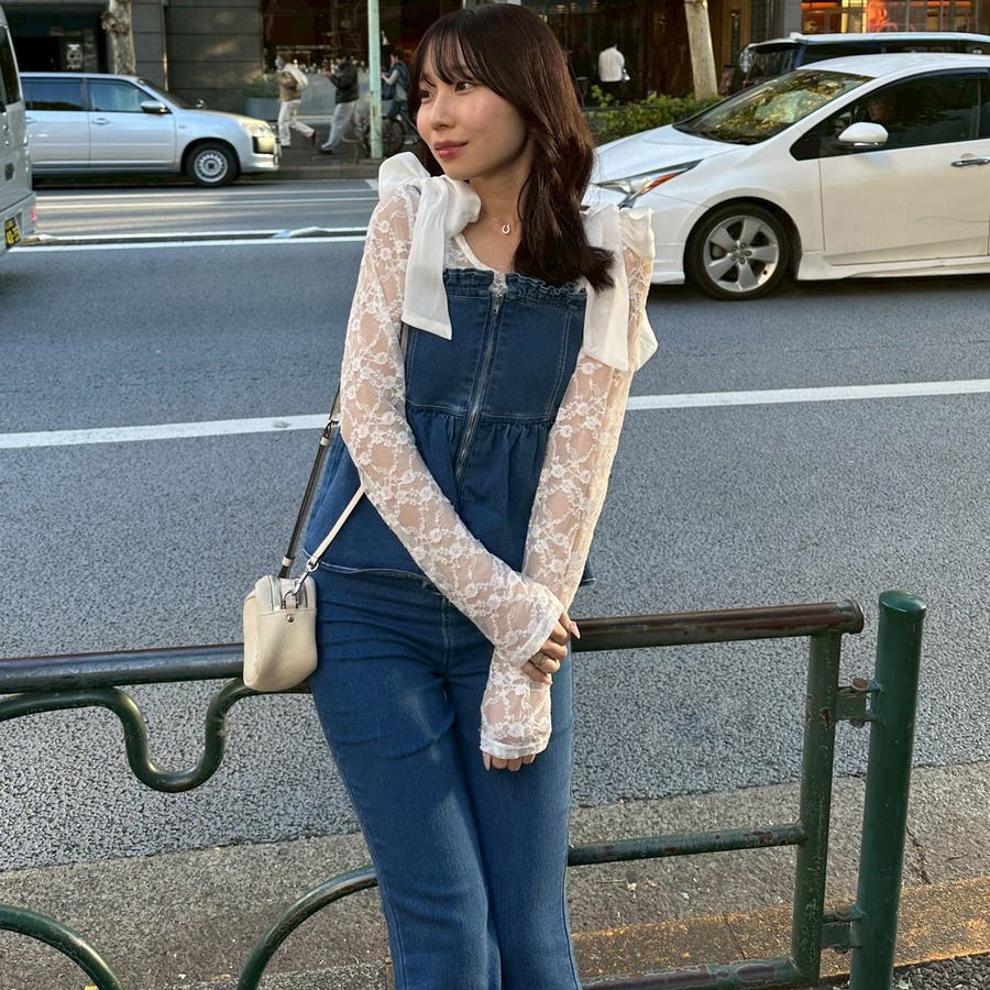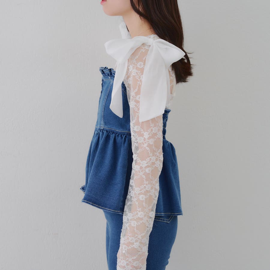 ・オーガン素材の肩リボンがガーリーな印象のデニムサロペ。