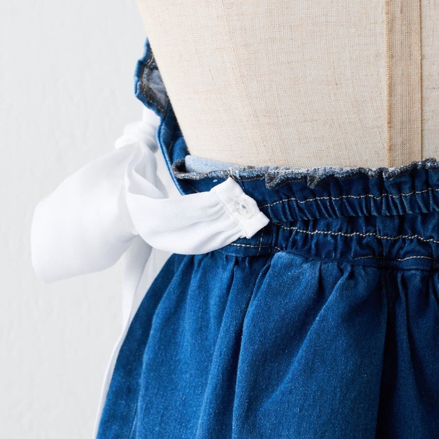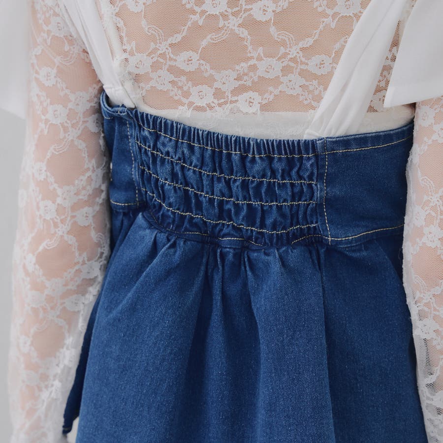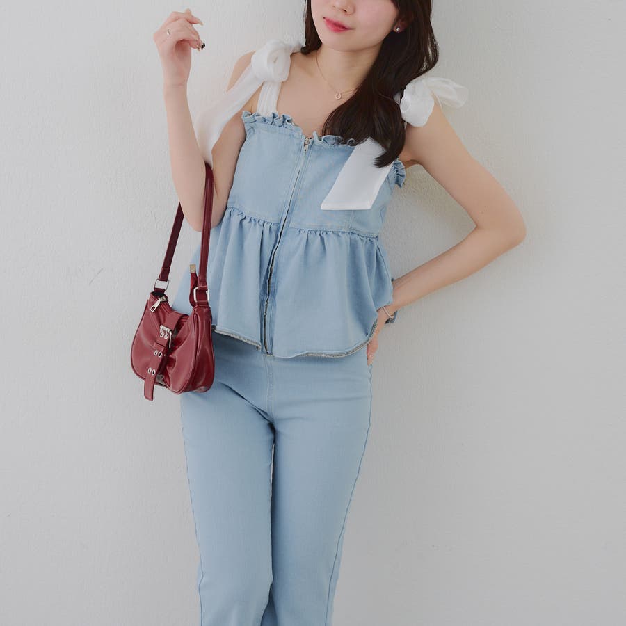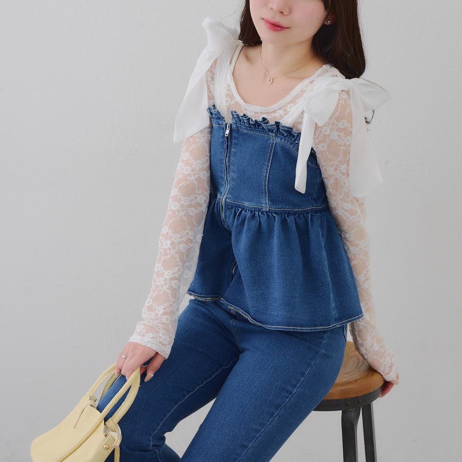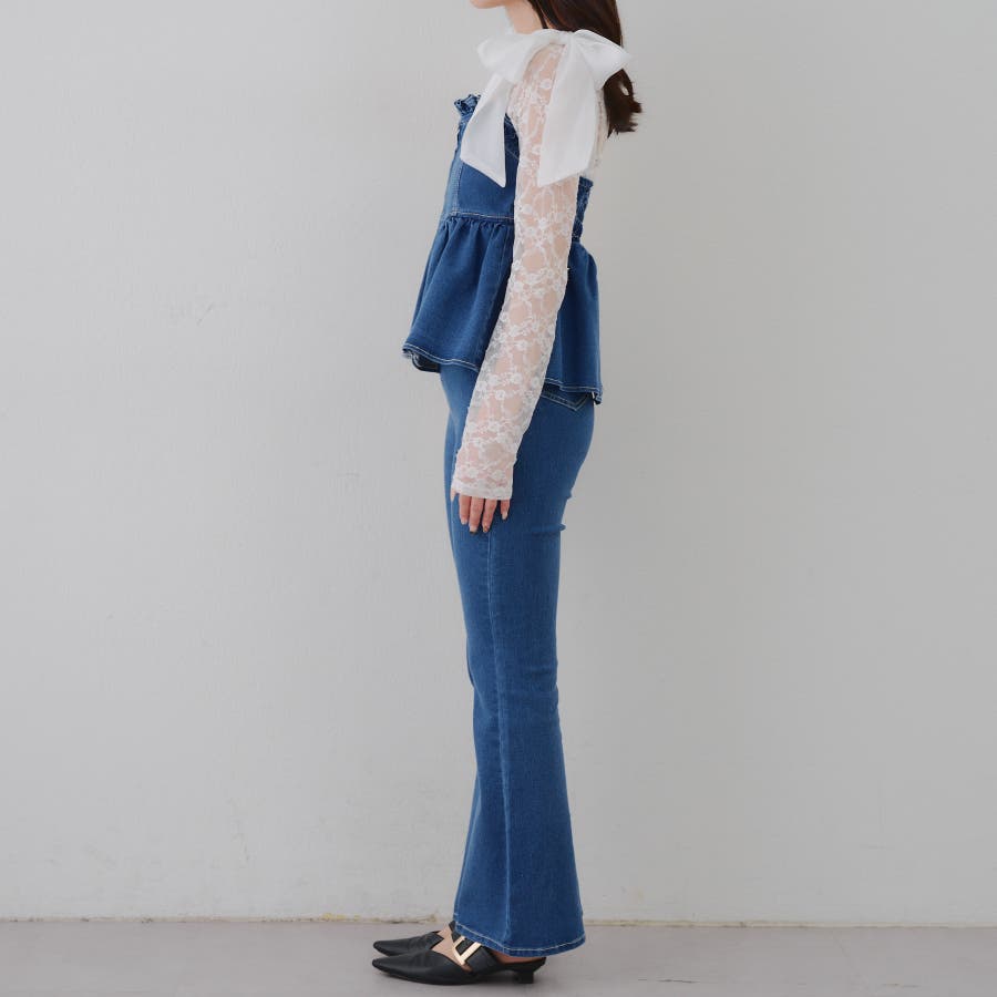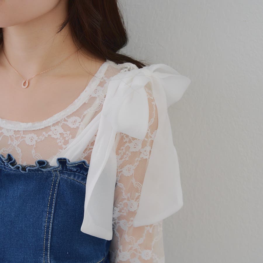 ・オーガン素材の肩リボンがガーリーな印象のデニムサロペ。