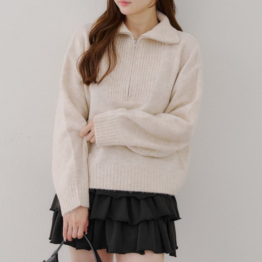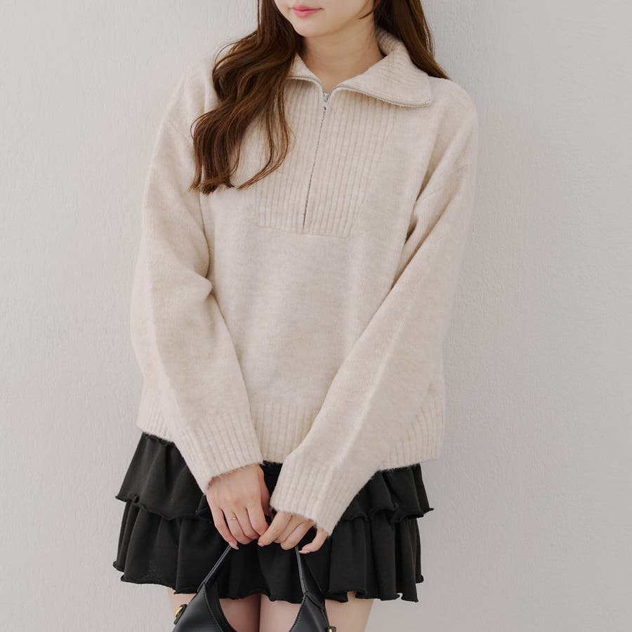 ・ハーフジップデザインのニットトップス。