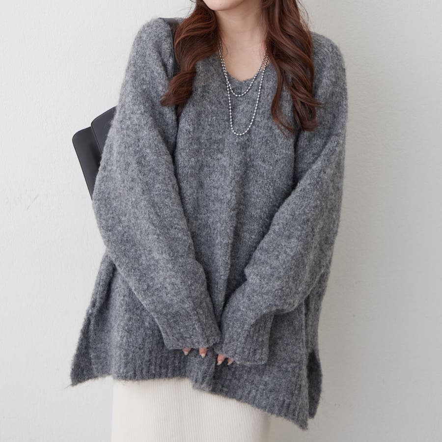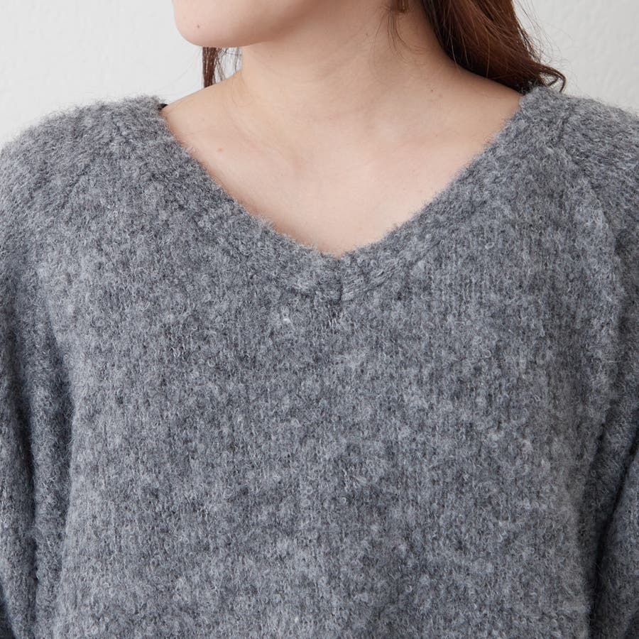 ・ざっくりと開いたVネックラインでデコルテ周りをすっきりと見せてくれます