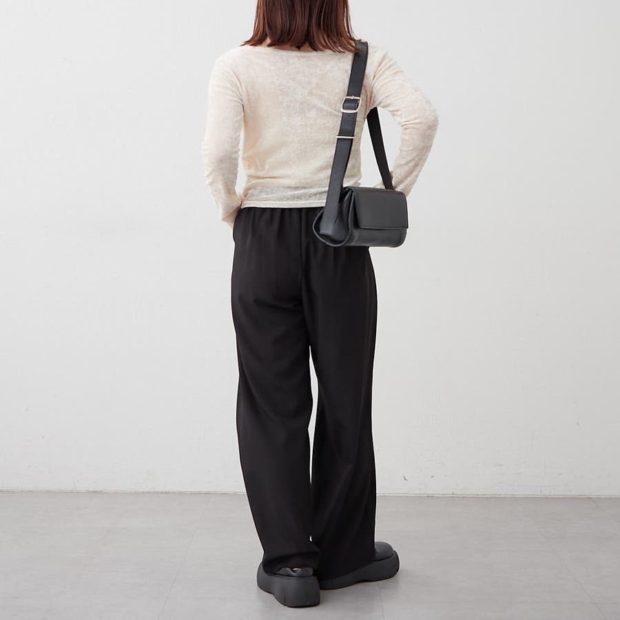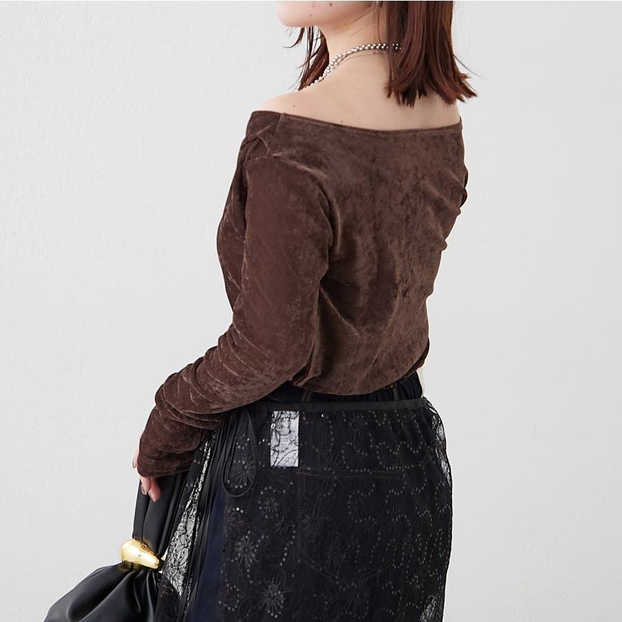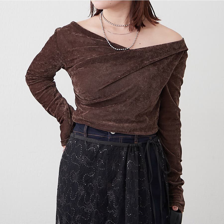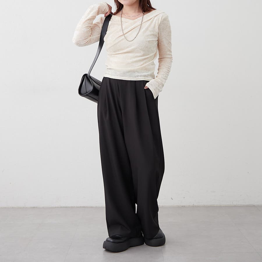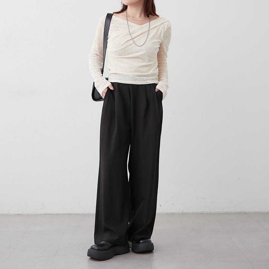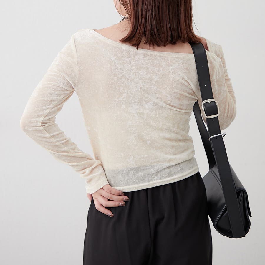 ・ ネックラインの開きが広めなのでワンショル風な着こなしもおすすめ