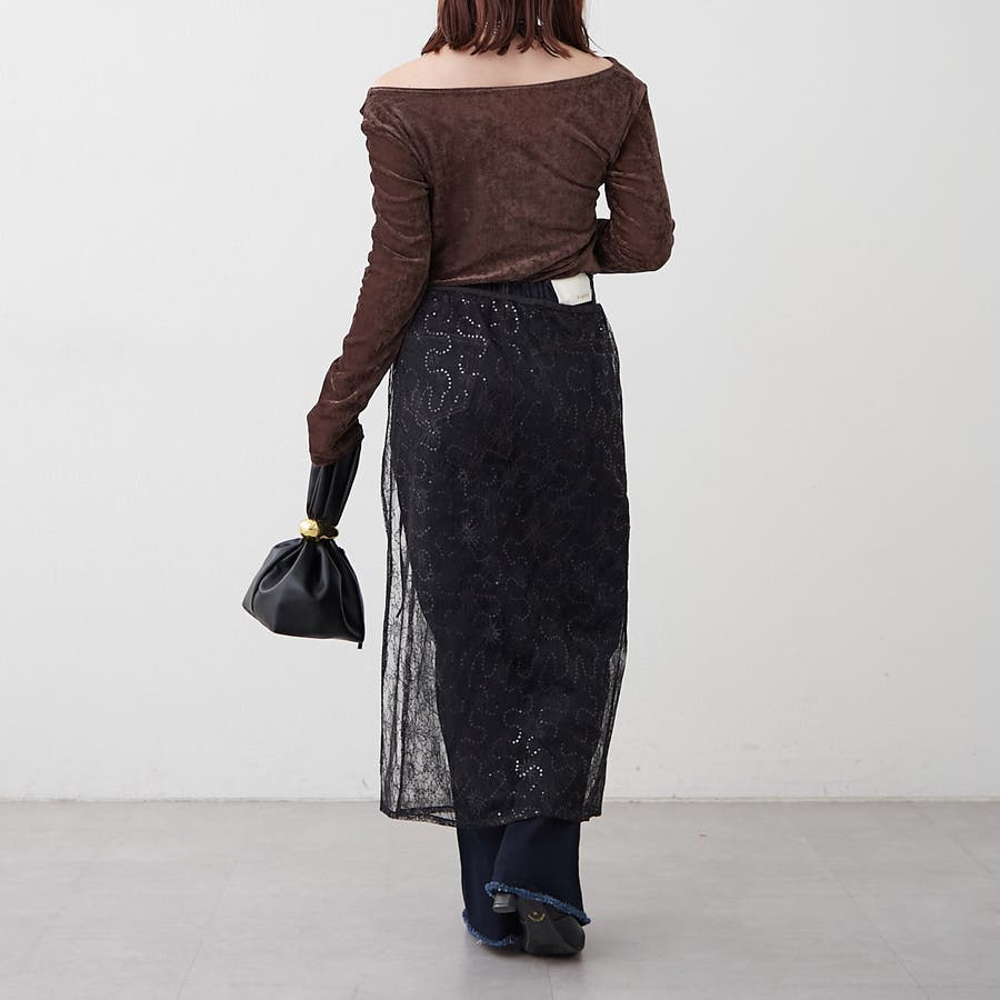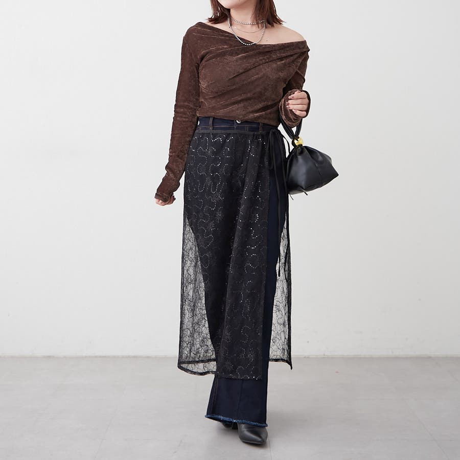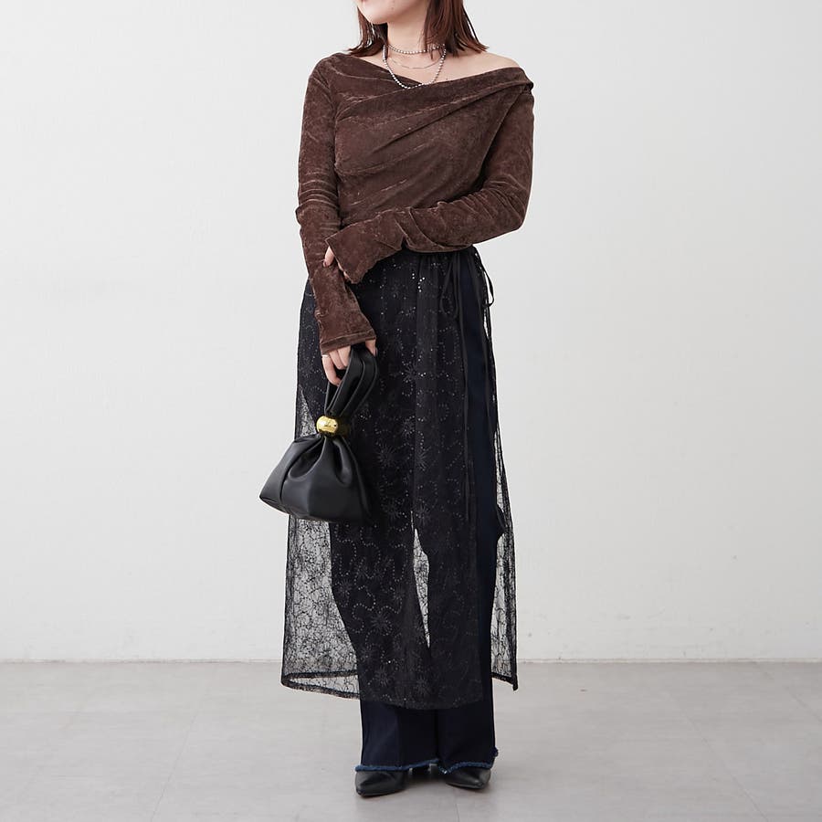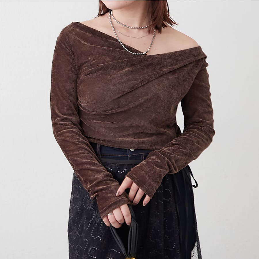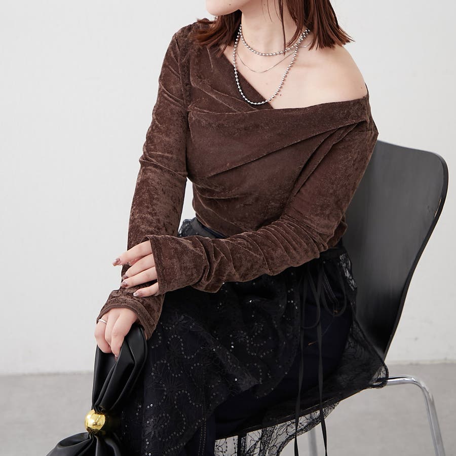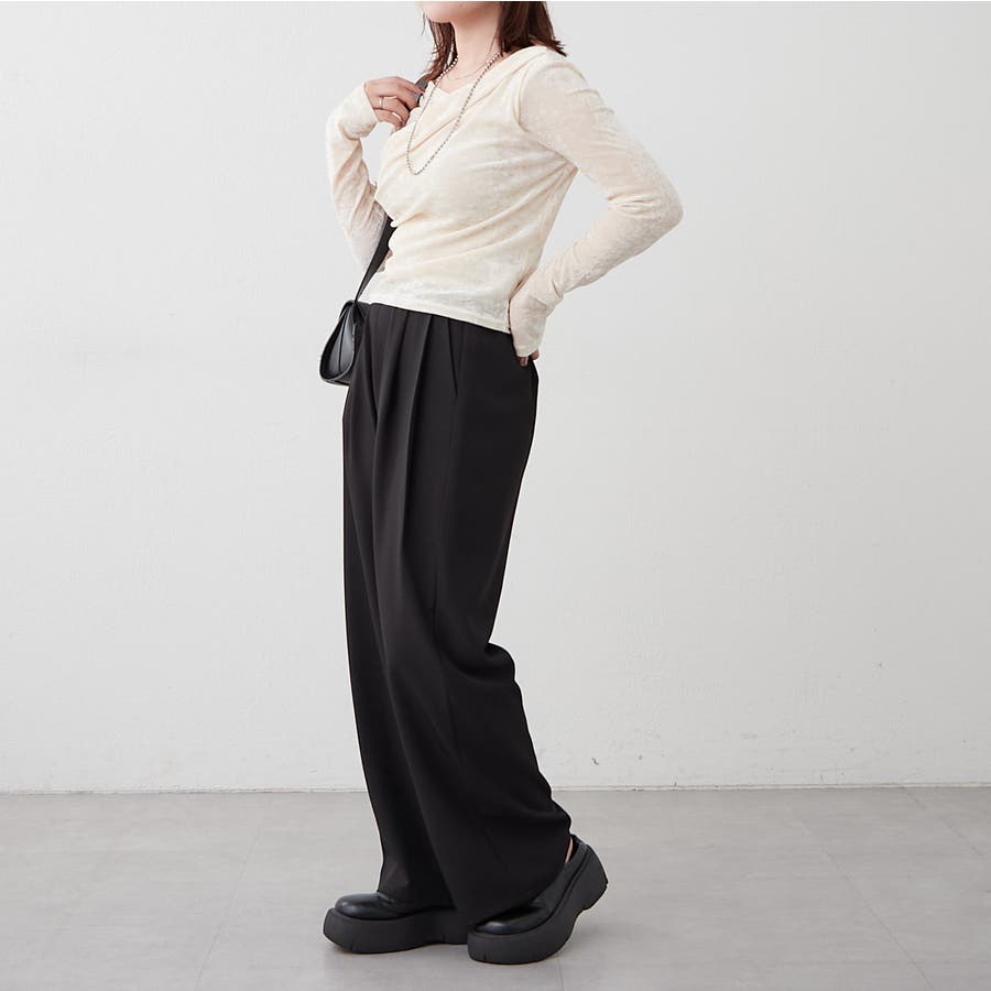 ・ ネックラインの開きが広めなのでワンショル風な着こなしもおすすめ