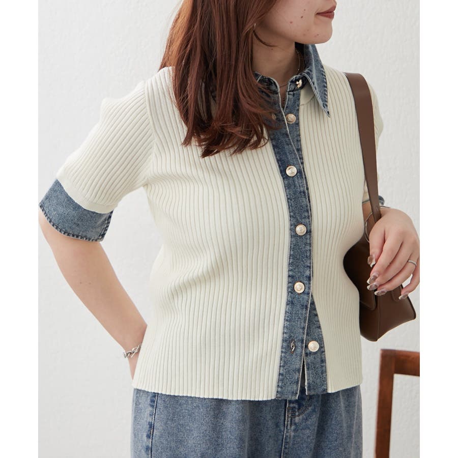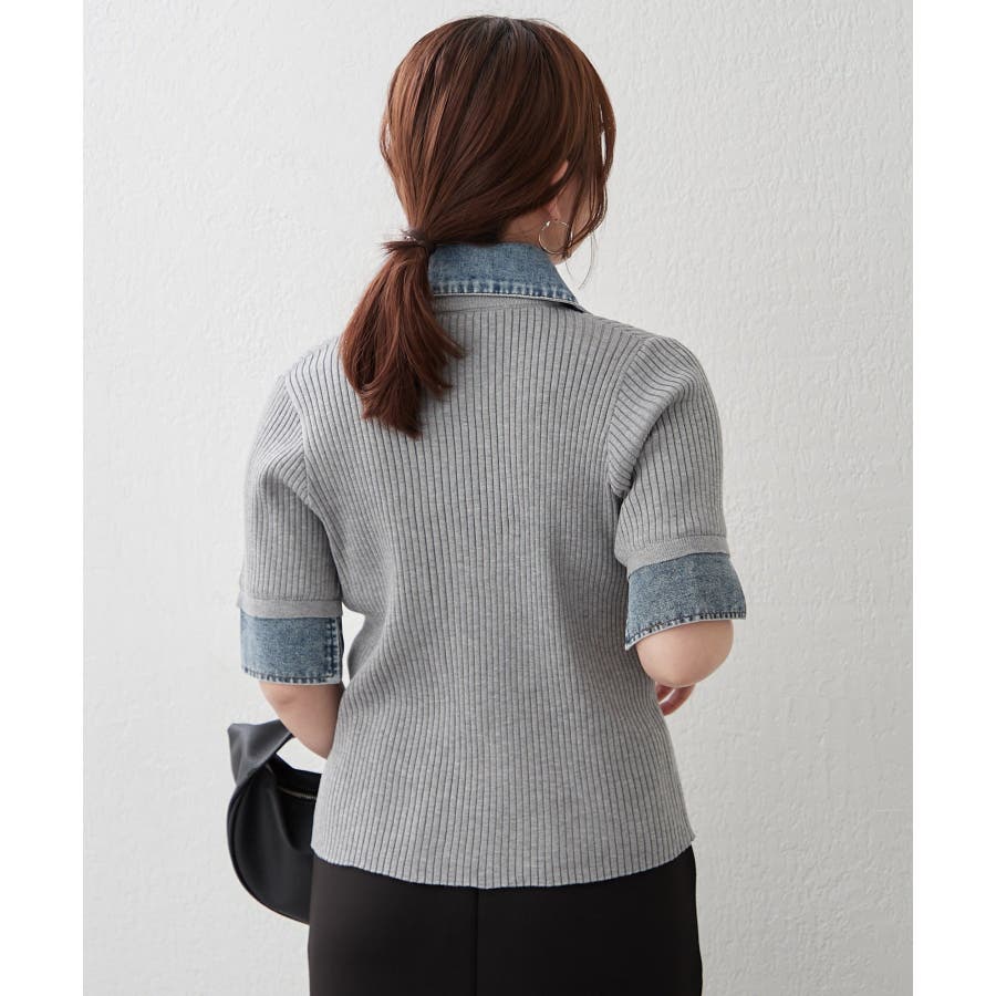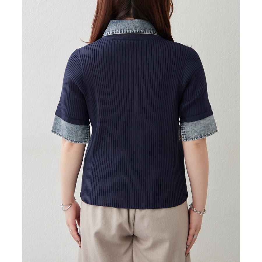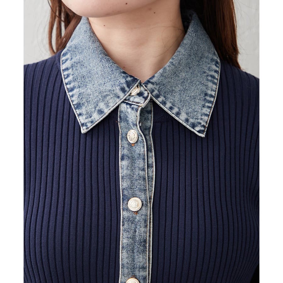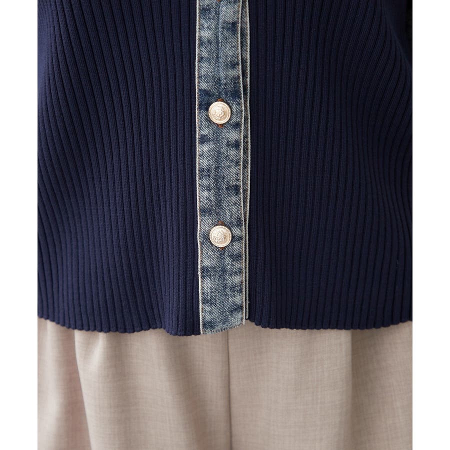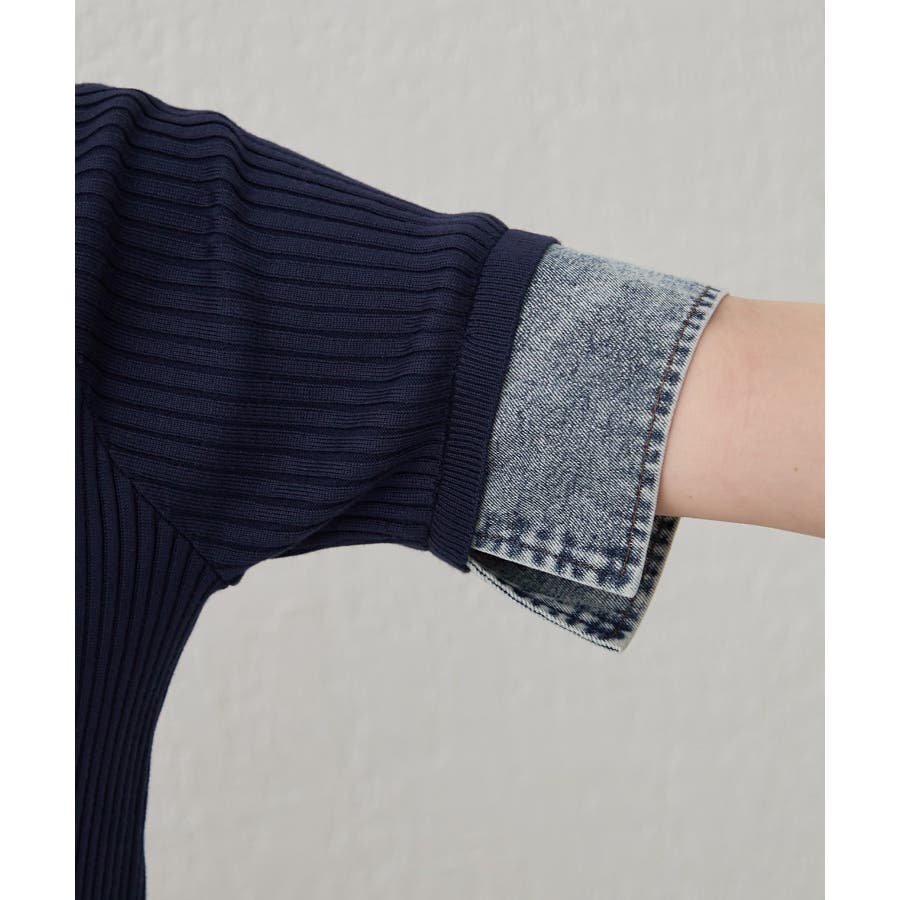 ・襟と袖口のデニム素材がアクセントになったリブニットトップス
