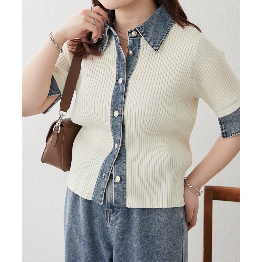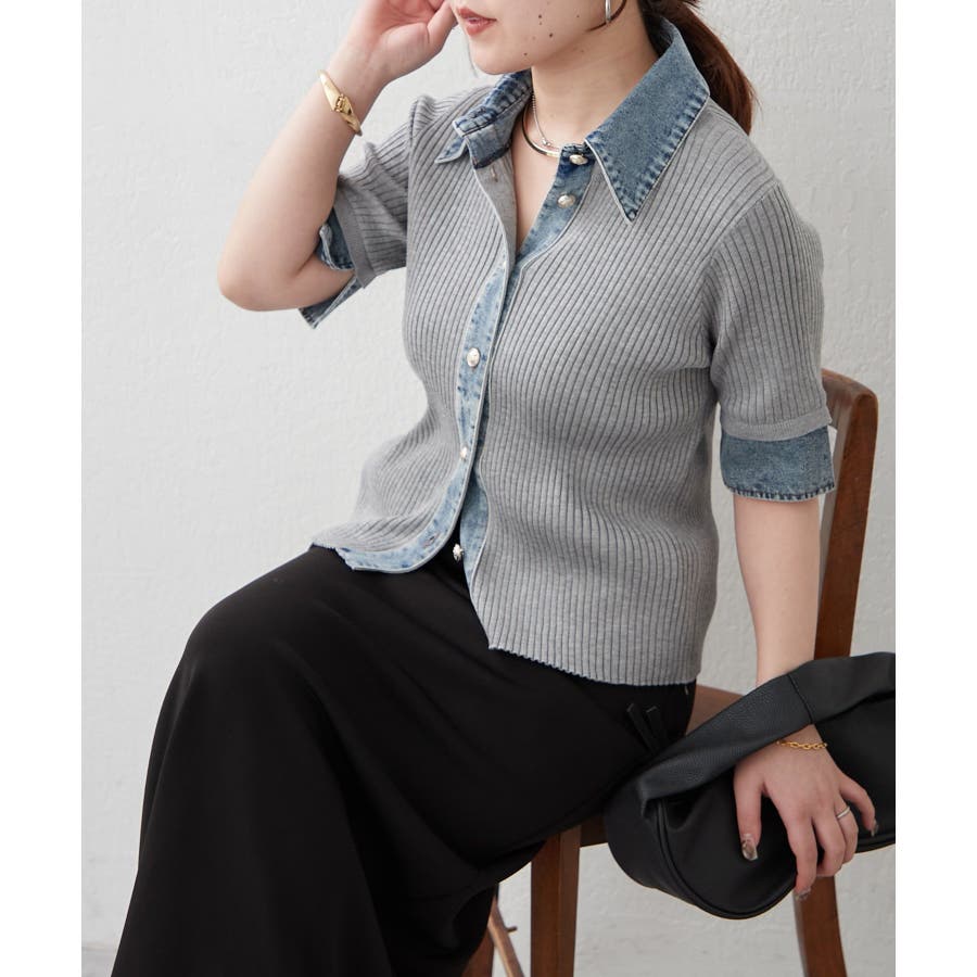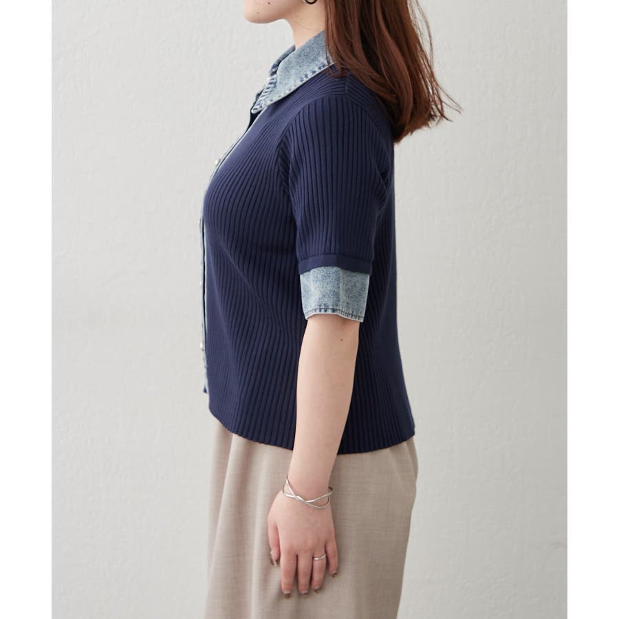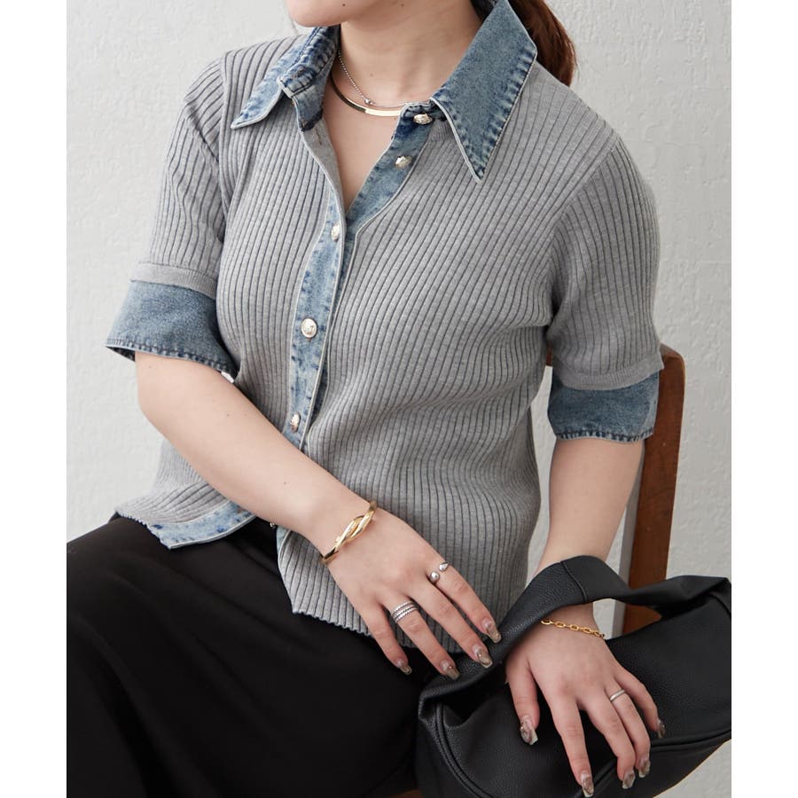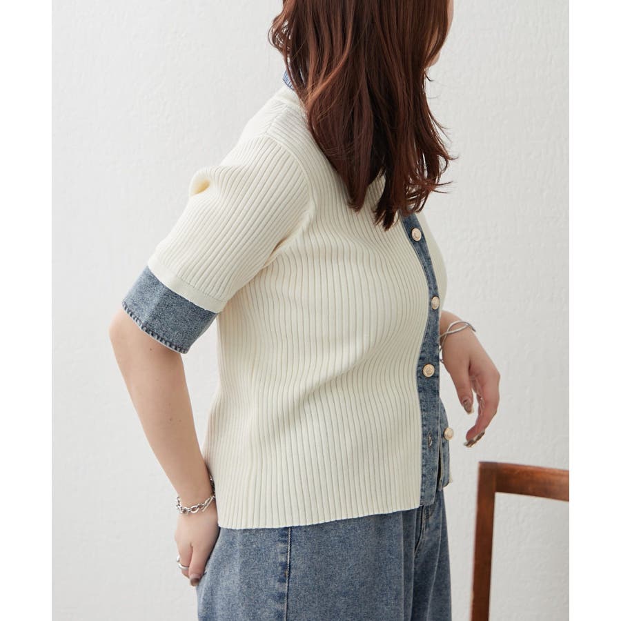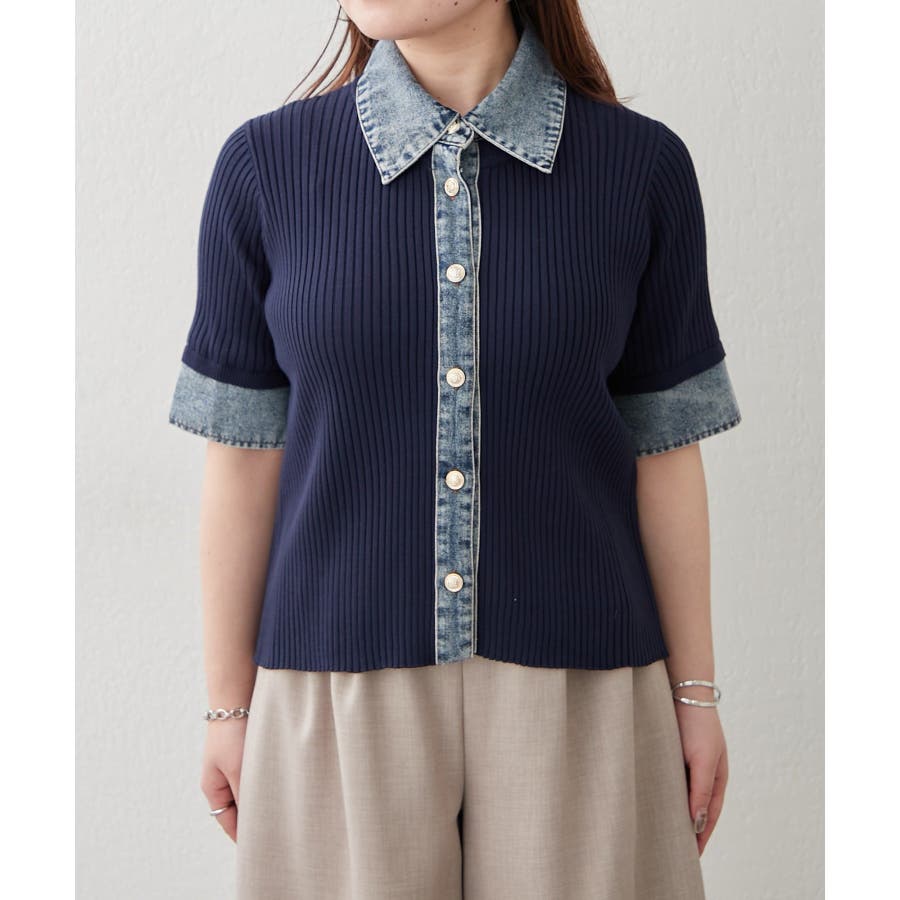 ・襟と袖口のデニム素材がアクセントになったリブニットトップス