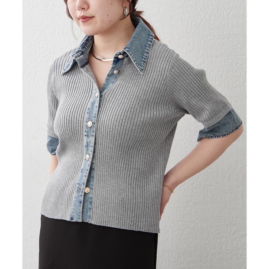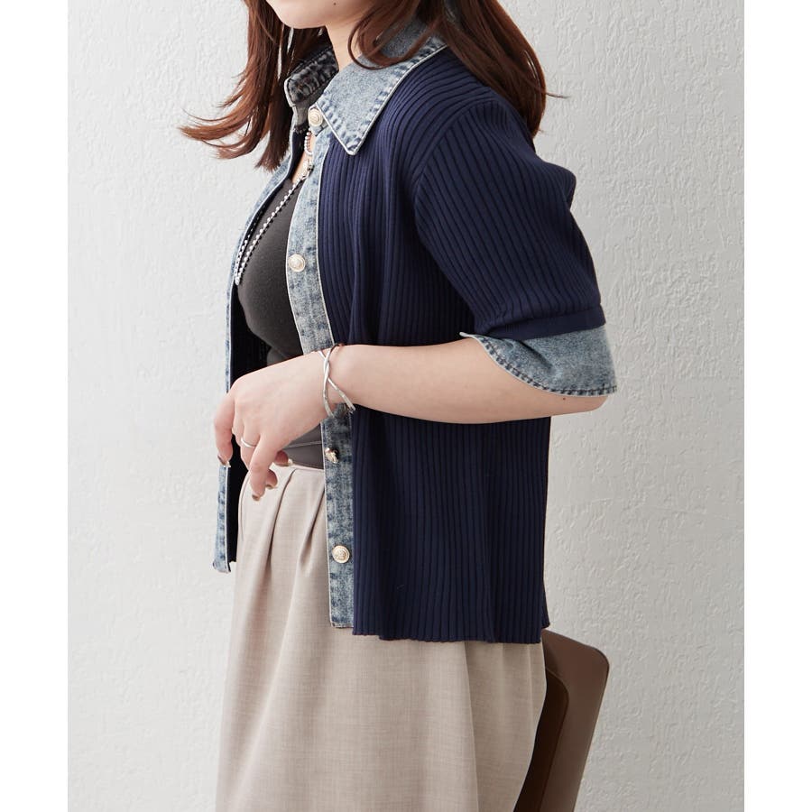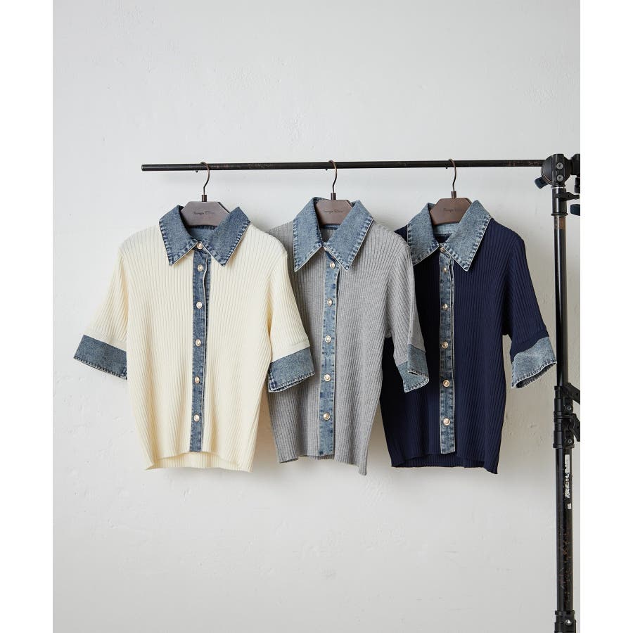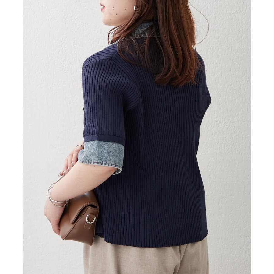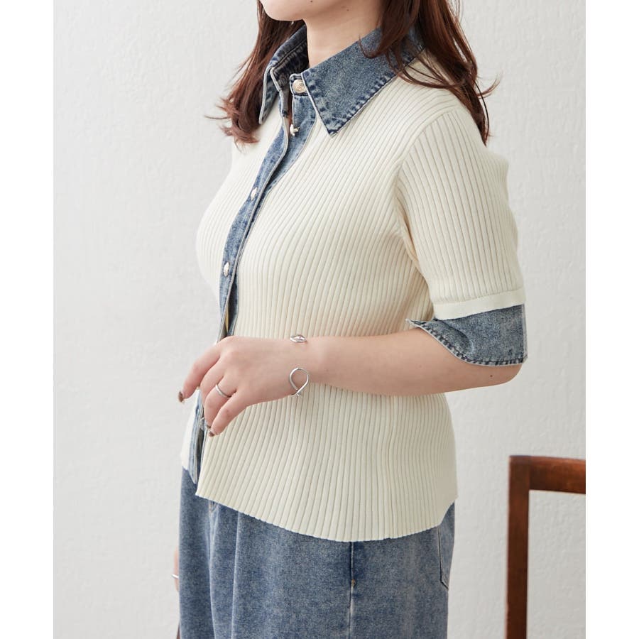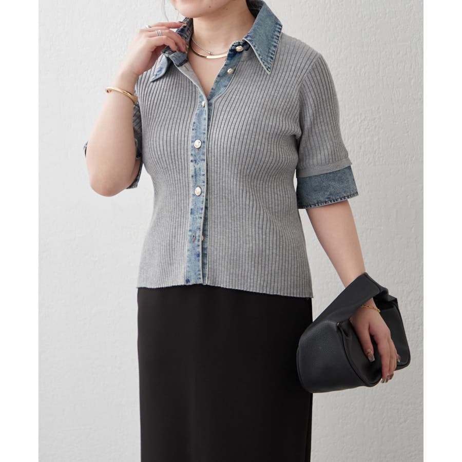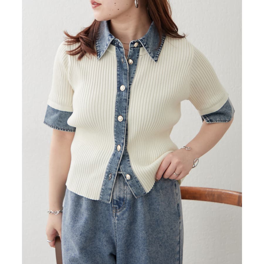 ・襟と袖口のデニム素材がアクセントになったリブニットトップス