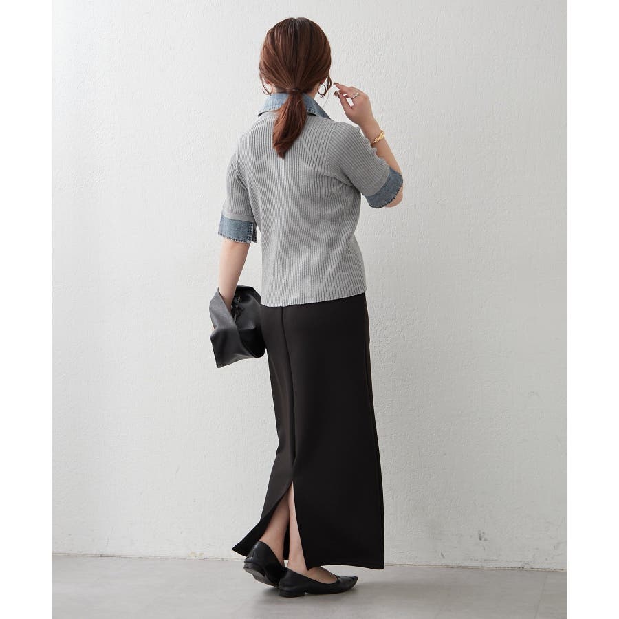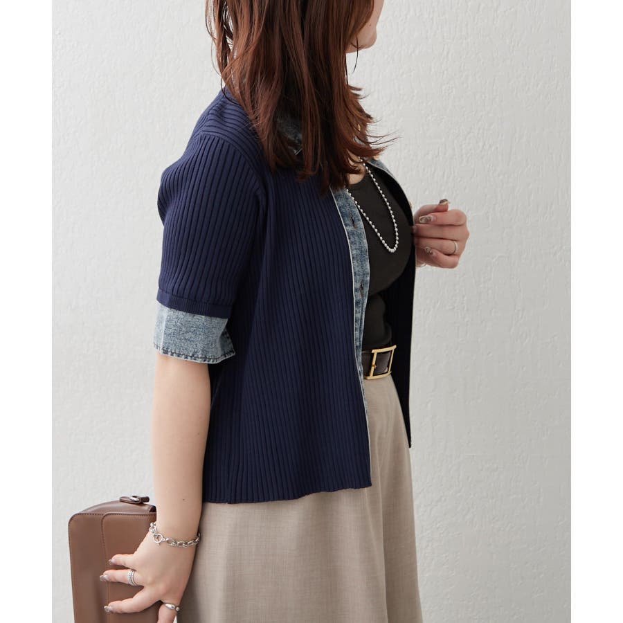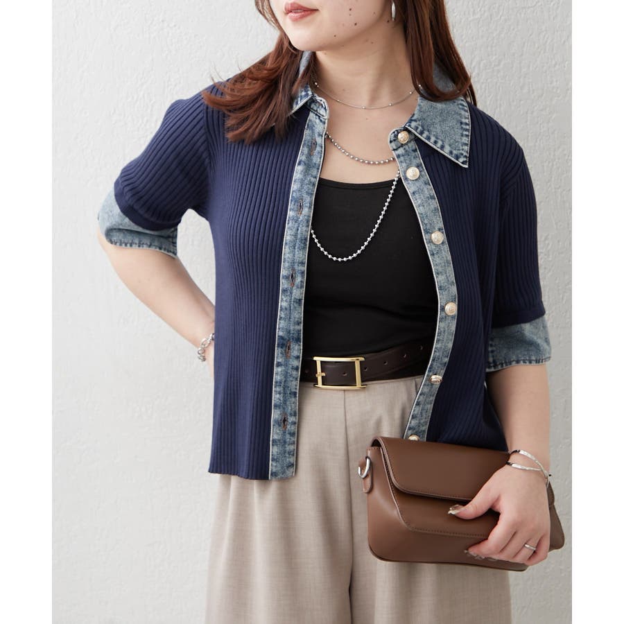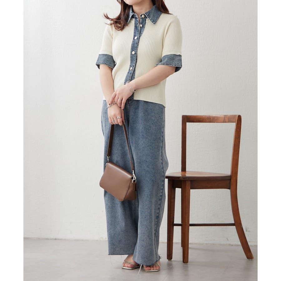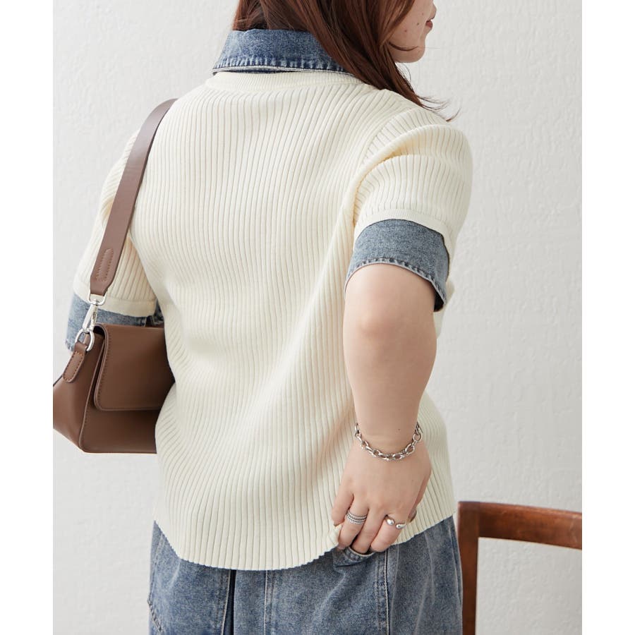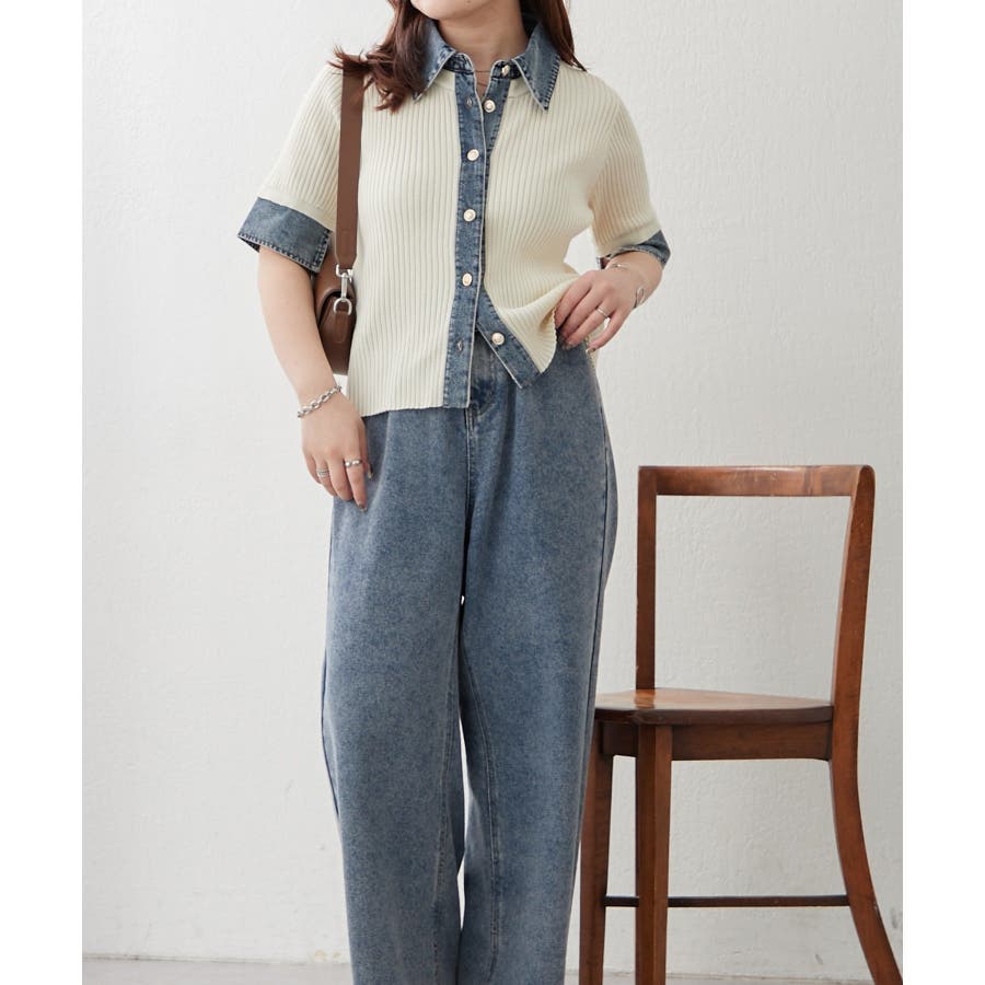 ・襟と袖口のデニム素材がアクセントになったリブニットトップス