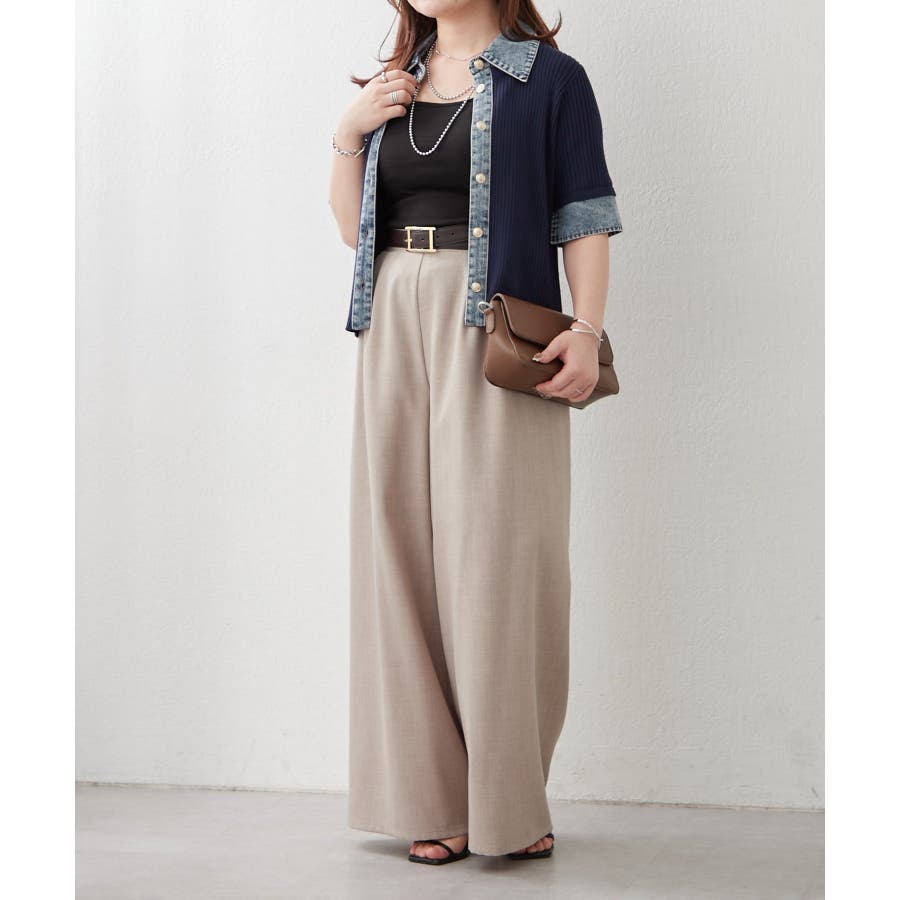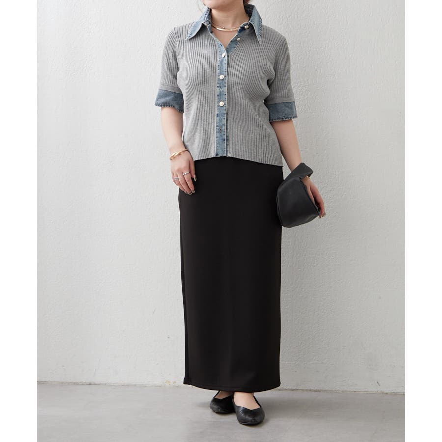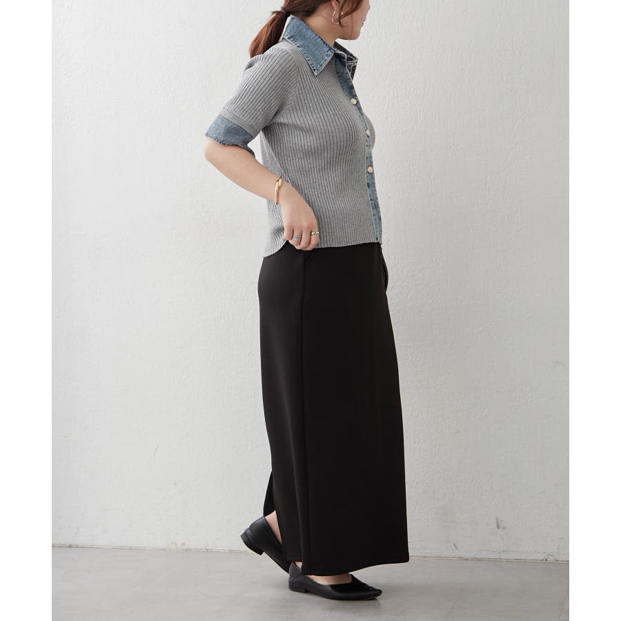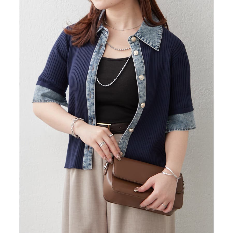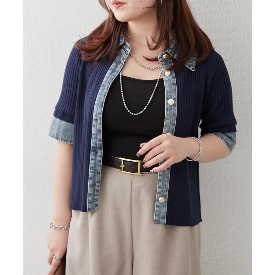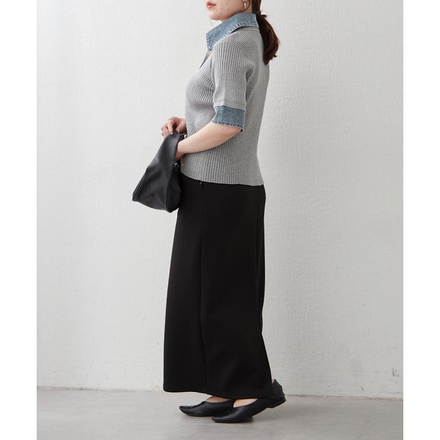 ・襟と袖口のデニム素材がアクセントになったリブニットトップス
