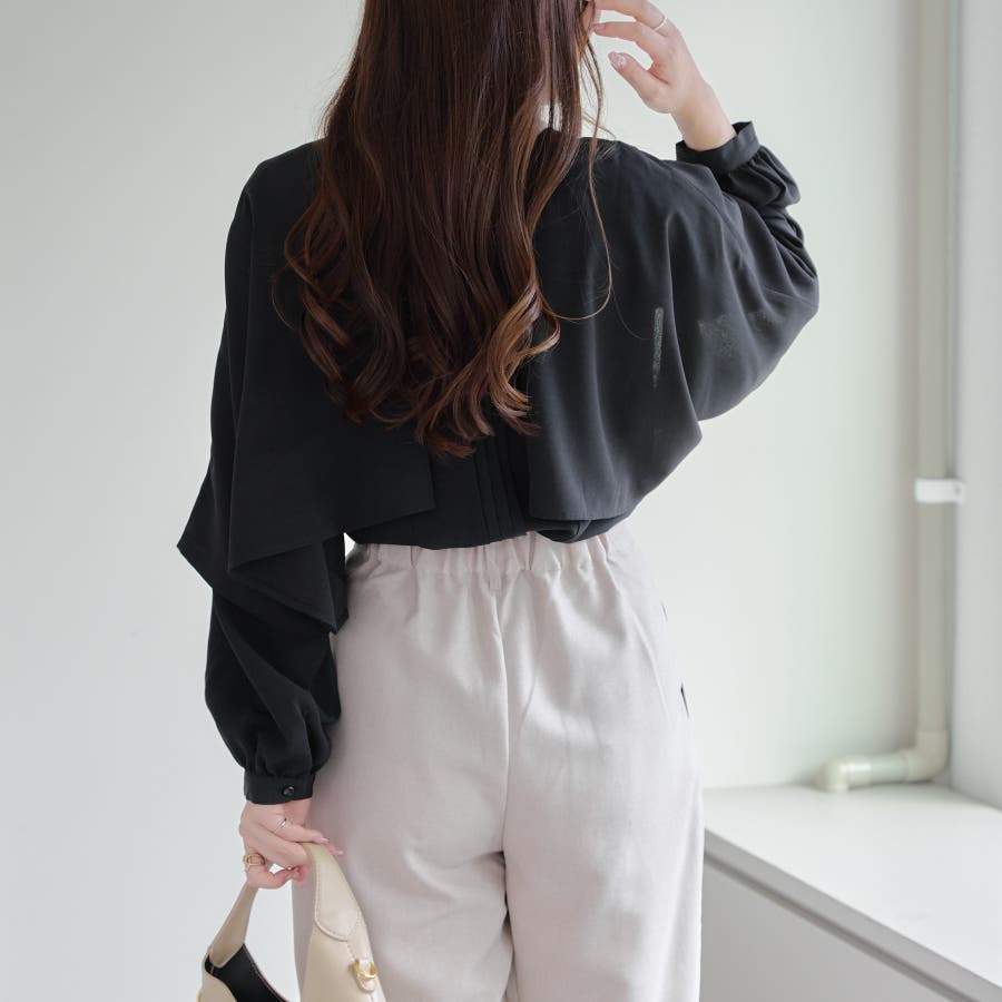 前と後ろの2wayで切られるし、袖のボタンでイメージ変えられるのでいい。甘すぎかなとも思ったが、黒なので合わせ安いし、スッキリします。パンツにもスカートにもいけるのでいい。素材もアイロンかけやすいし、ノーアイロンでも乾かしかた次第で全然いけるのもいい。