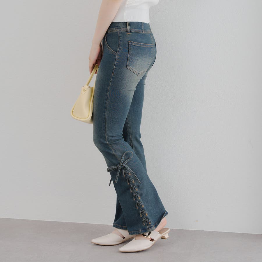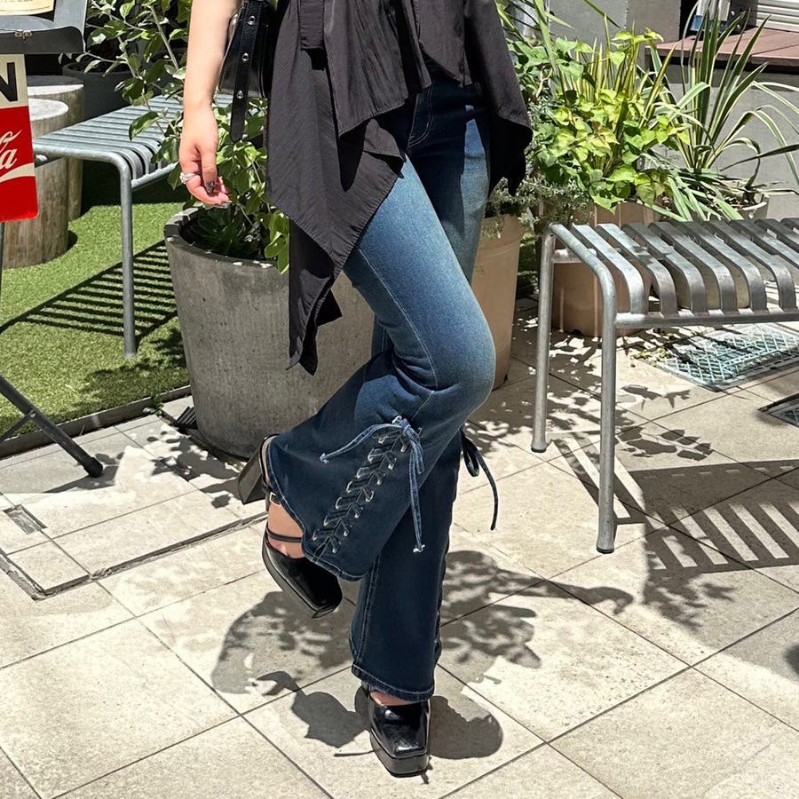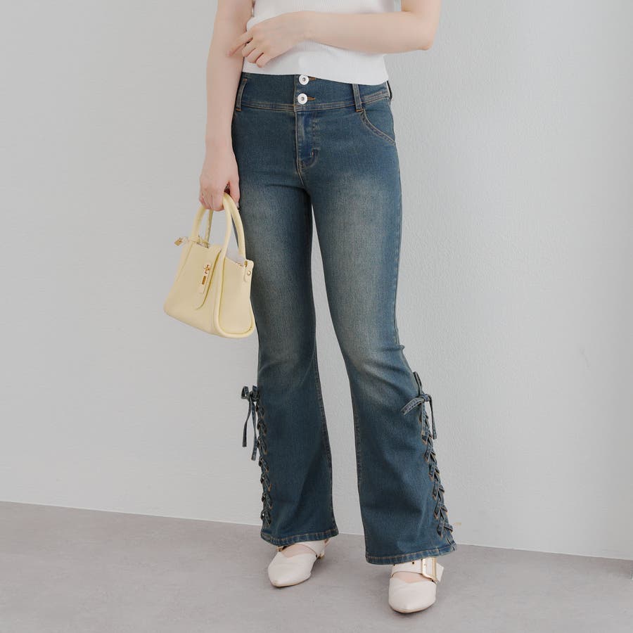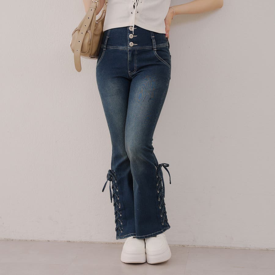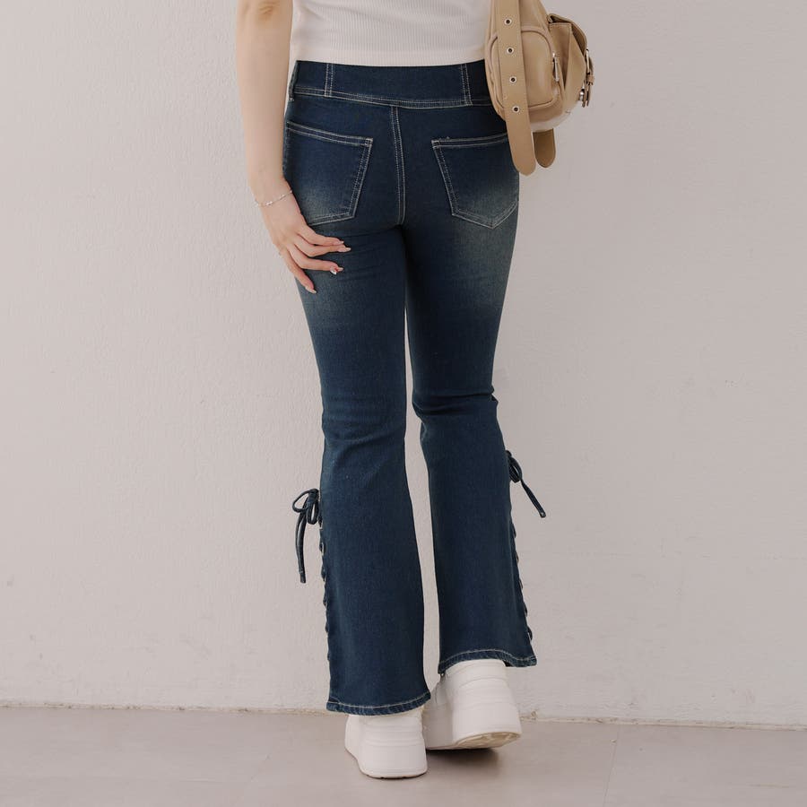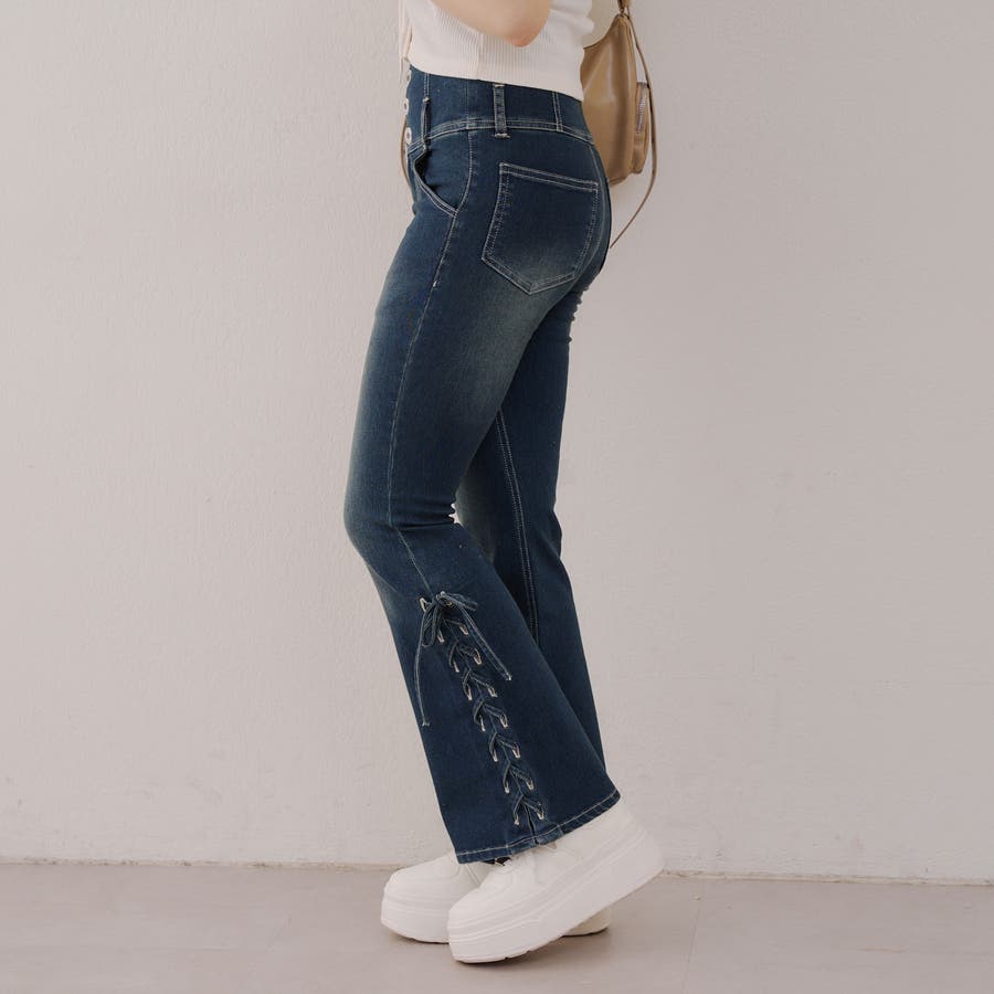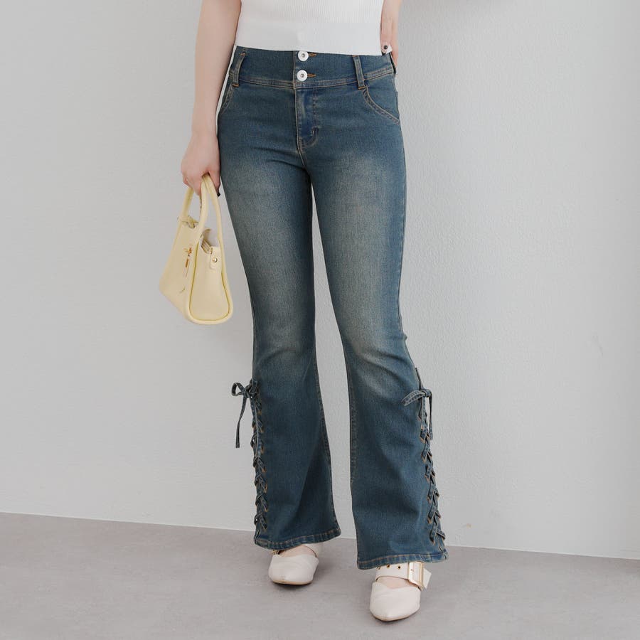 【2サイズ展開】サイドレースアップセミフレアデニム