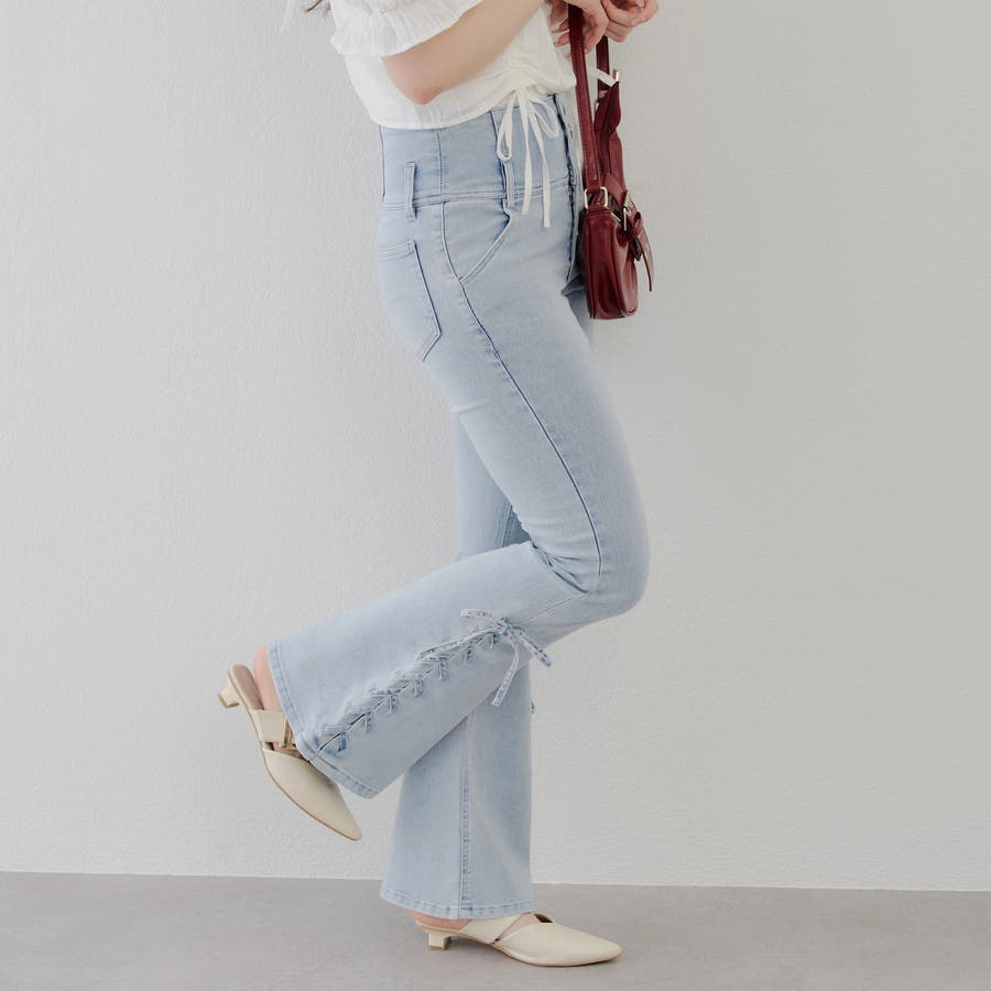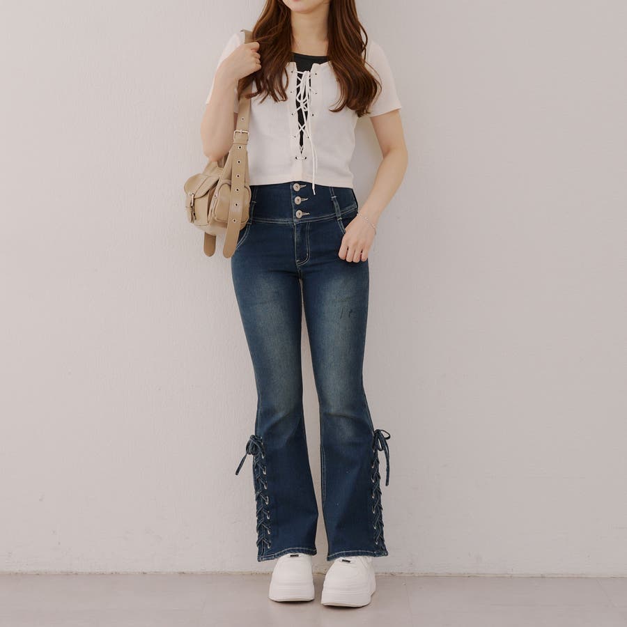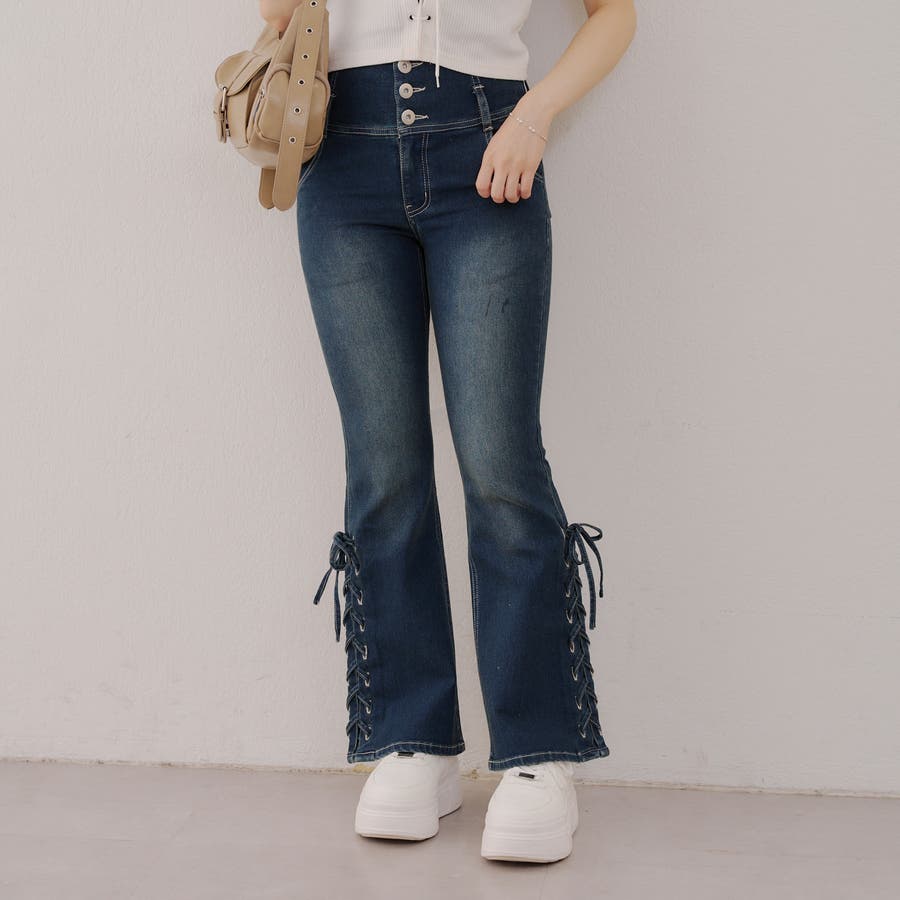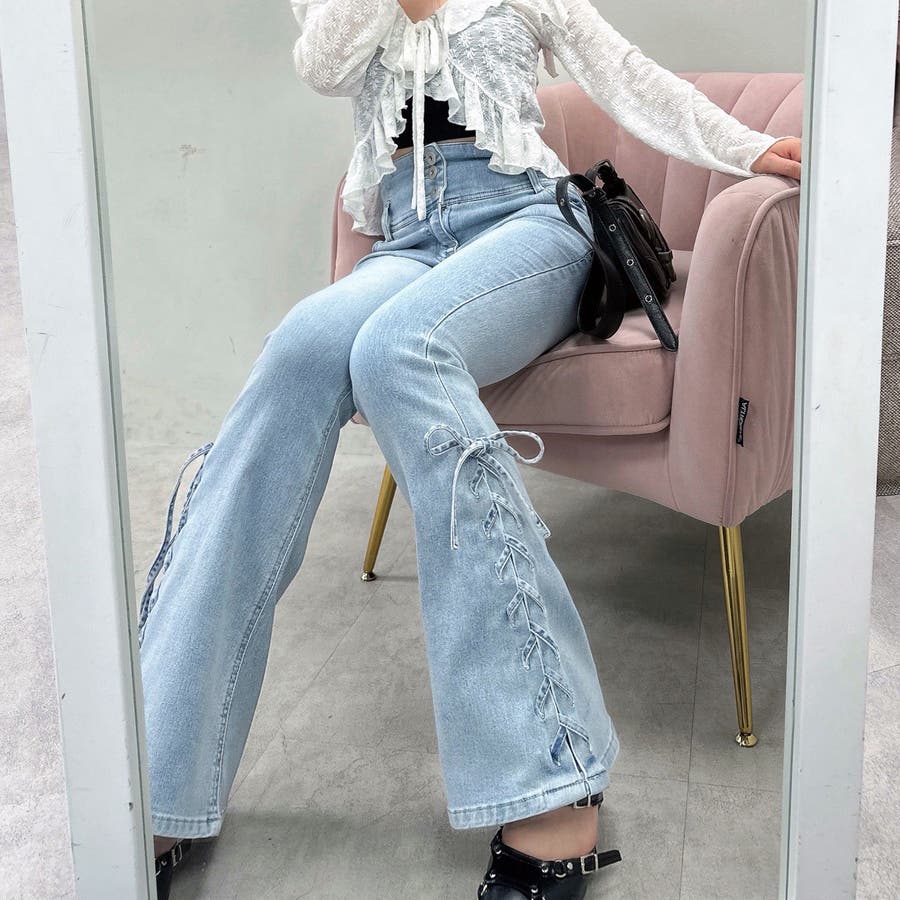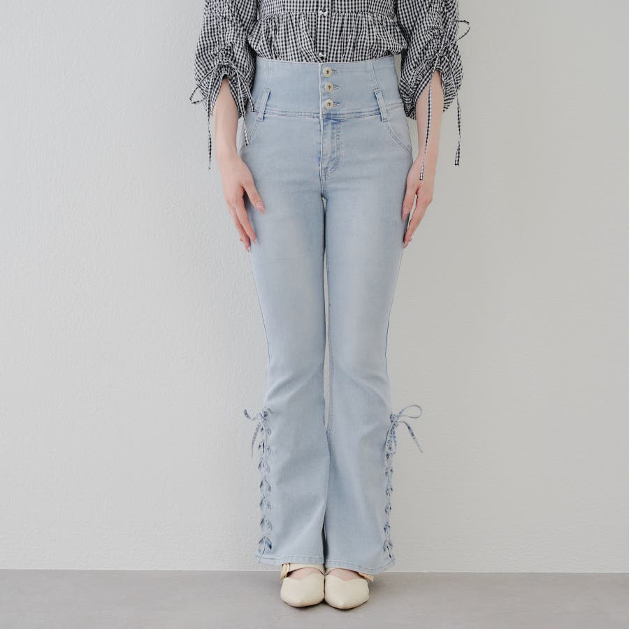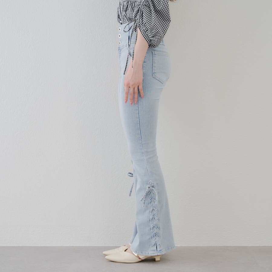 【2サイズ展開】サイドレースアップセミフレアデニム