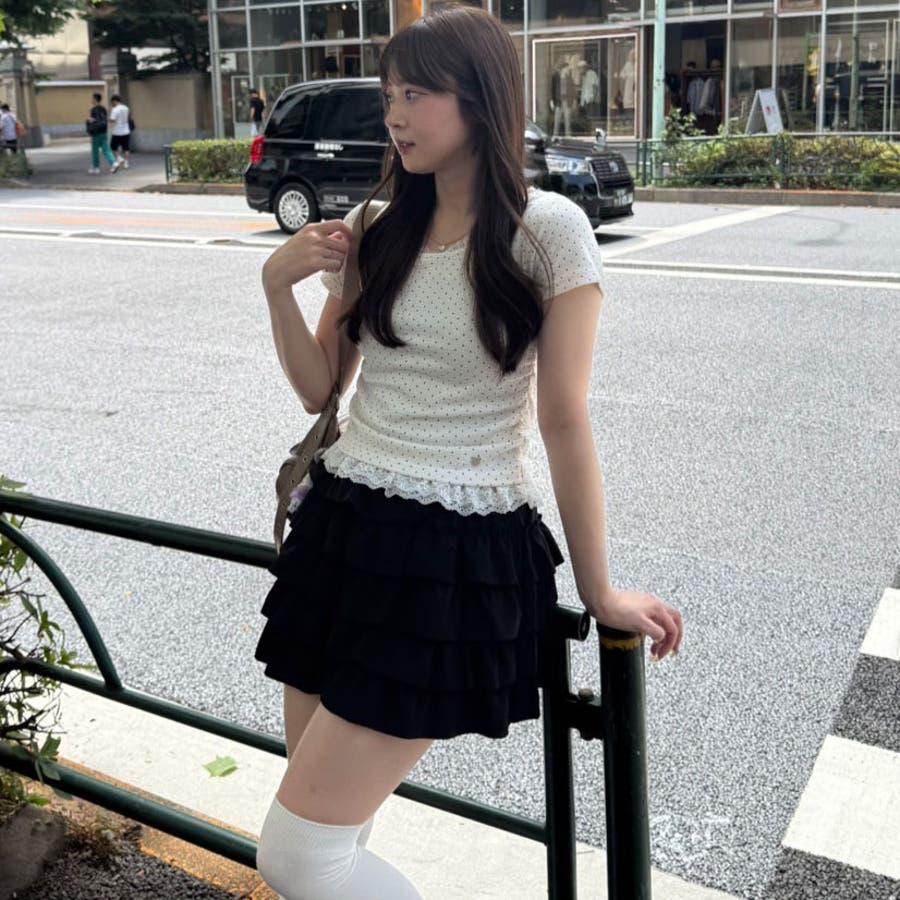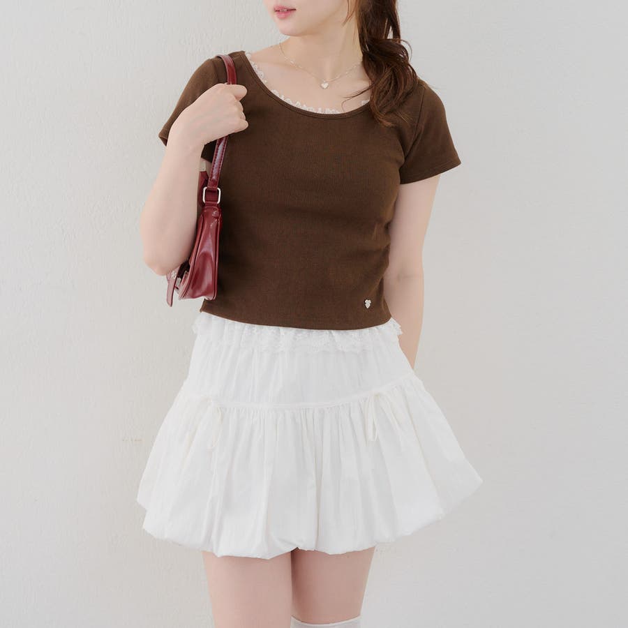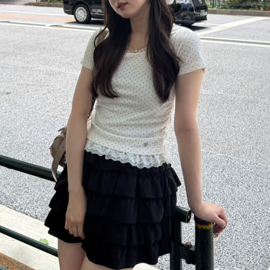 裾レース切替デザインが目を惹くトップス