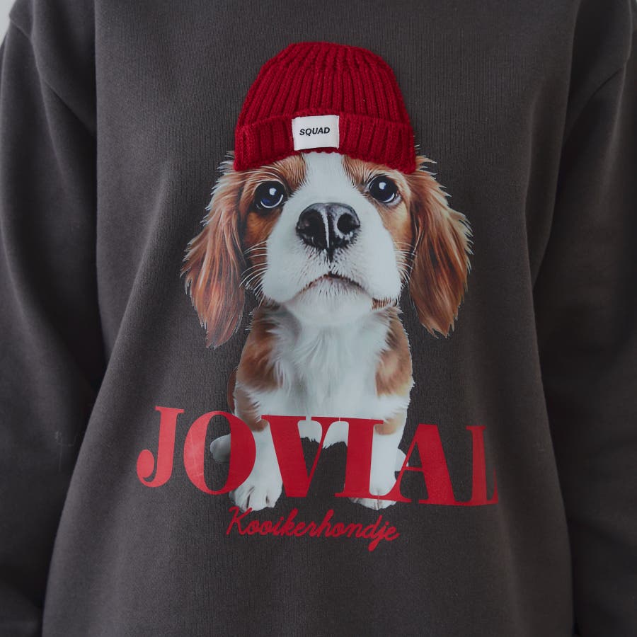 ・本物みたいなニット帽がユニークなデザインの犬プリントスウェット