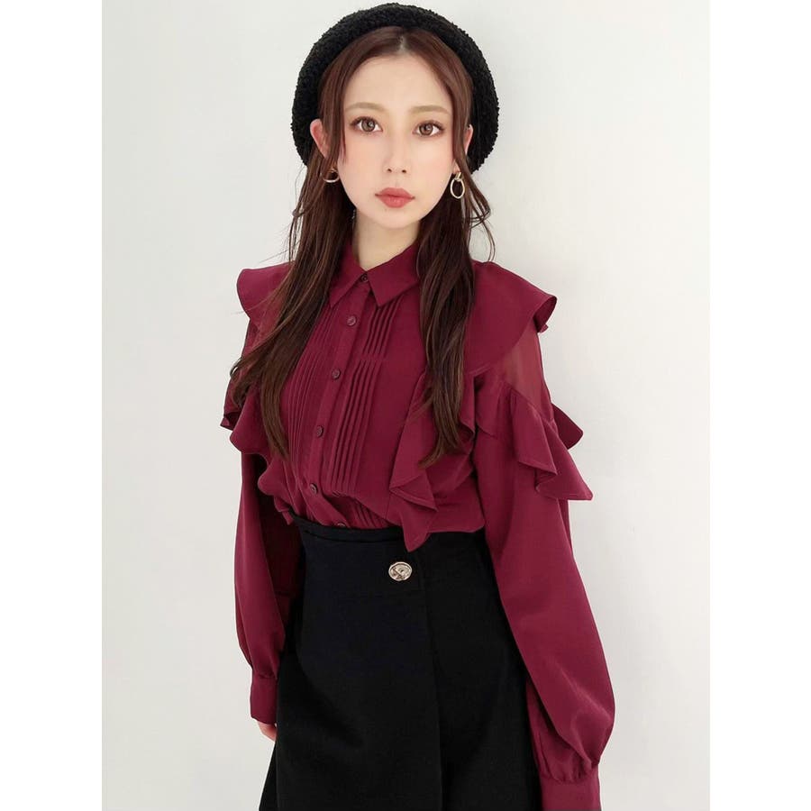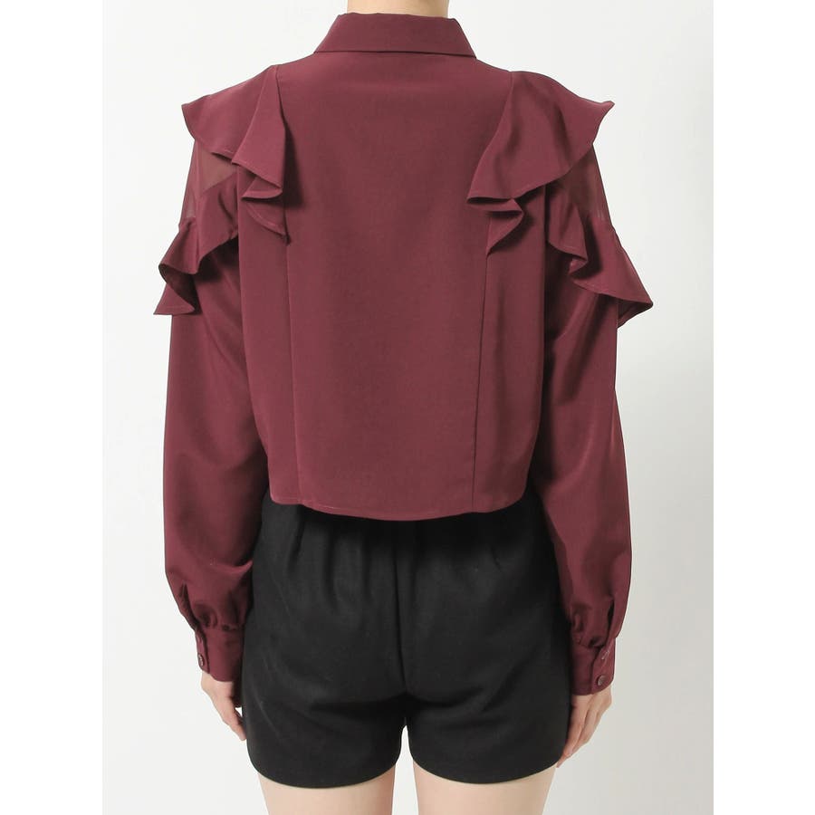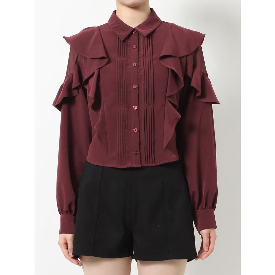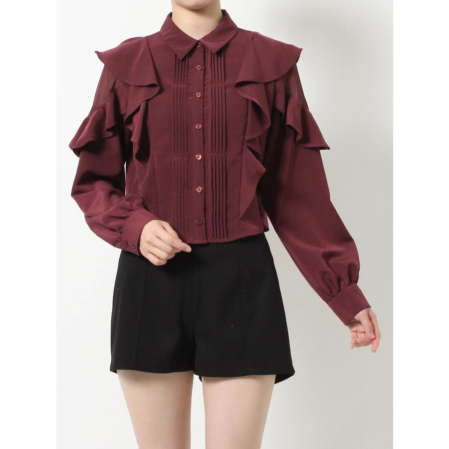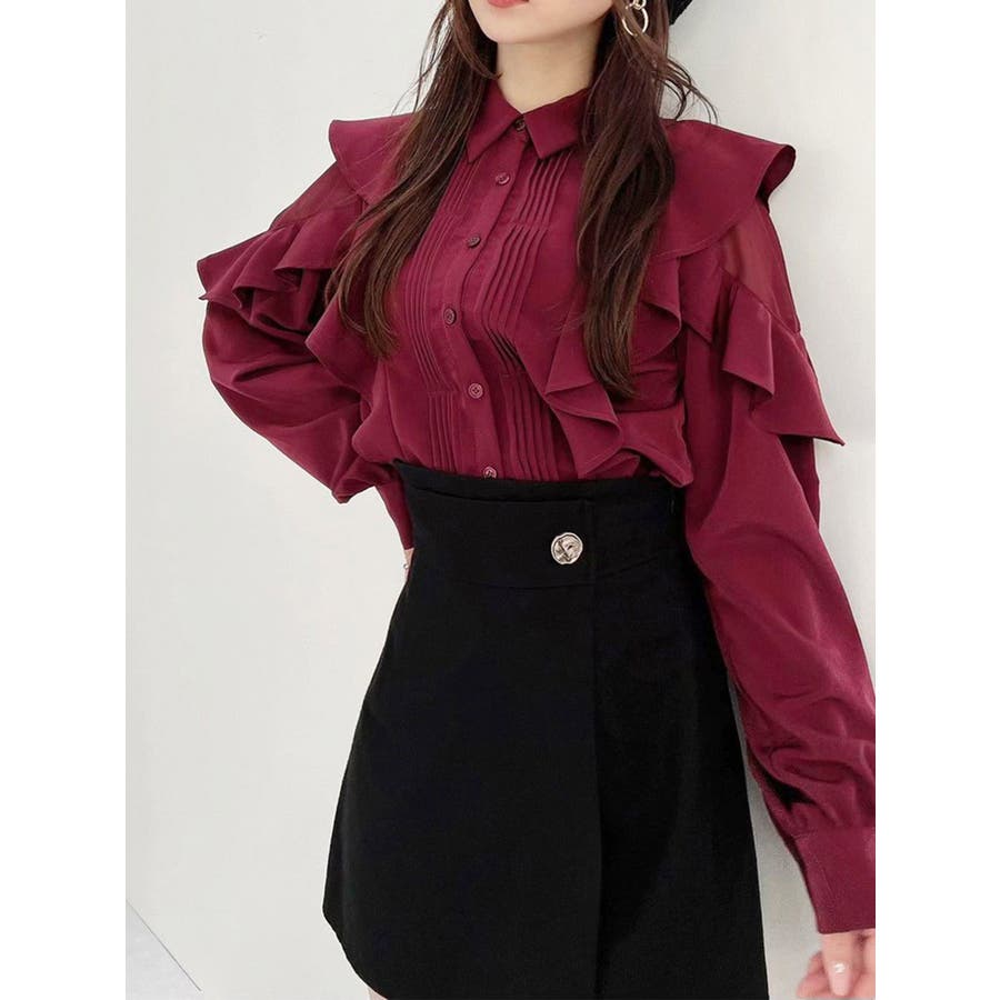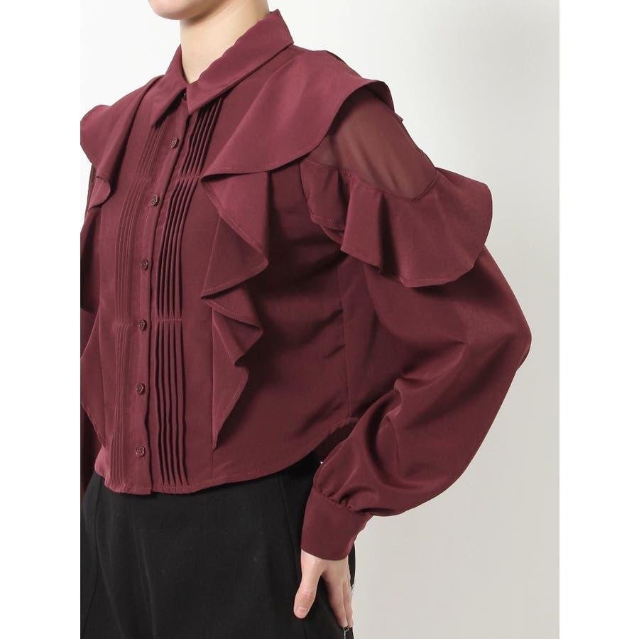デザイン性があり華やかな印象のブラウス▽デザイン▽衿元をエレガントに彩るモードなラッフルカラーが印象的なブラウス。構築的なラッフルにきちんと感があるシャツカラーを合わせ、絶妙なバランスに仕上げました。肩部分をシアーな素材で切り替えることで抜け感をプラスした遊び心のあるアイテムです。顔周りを華やかに見せてくれる上品な1枚。▽カラー▽白・黒・ワインの3色展開。▽スタイリング▽全体をワントーンで品良くまとめているのでボトムを選ばず合わせやすいのも嬉しいポイント。※着用画像はフラッシュの加減で実際の製品と色味等が異なる場合がございますので、生地のズームアップ画像をご確認ください。※ご利用の端末画面の設定により実際の商品と色味が異なる場合がございます。【商品特徴】透け感:なし伸縮性:なし生地の厚さ:薄手サイズ感:普通裏地:なしポケット:なし