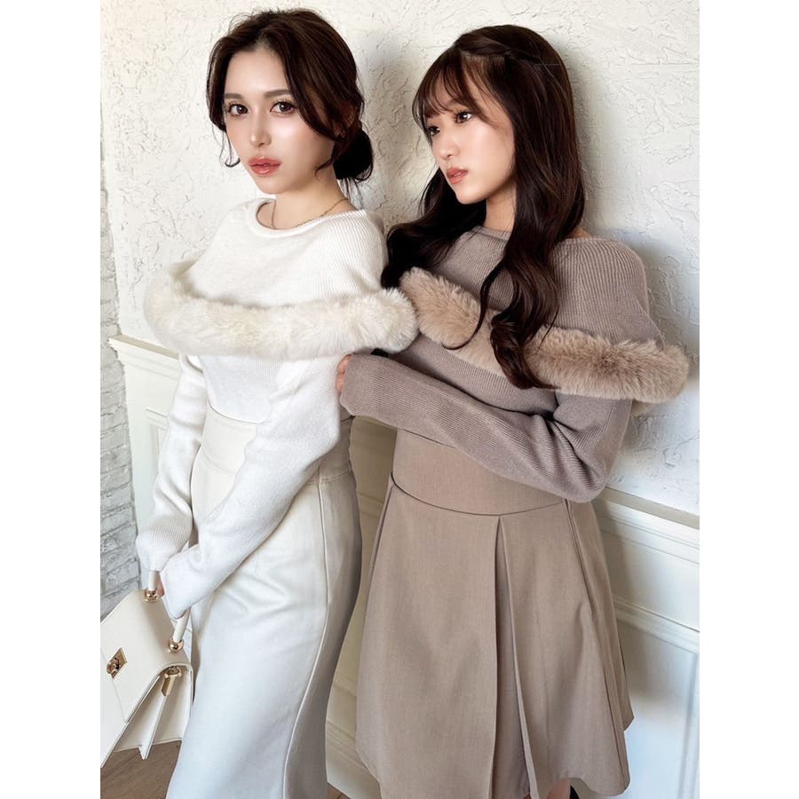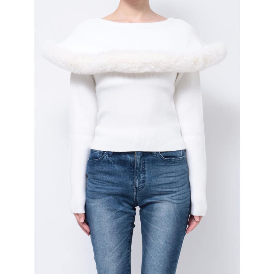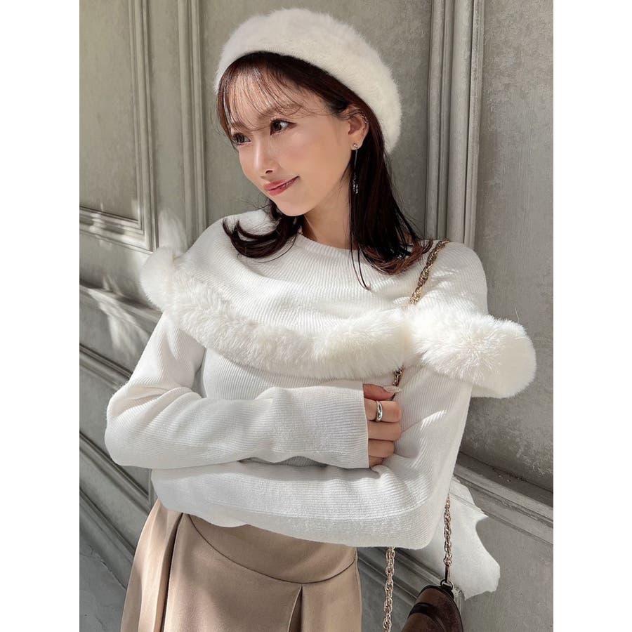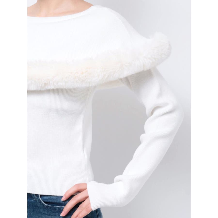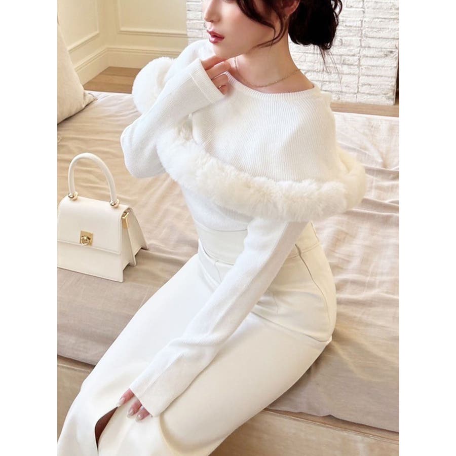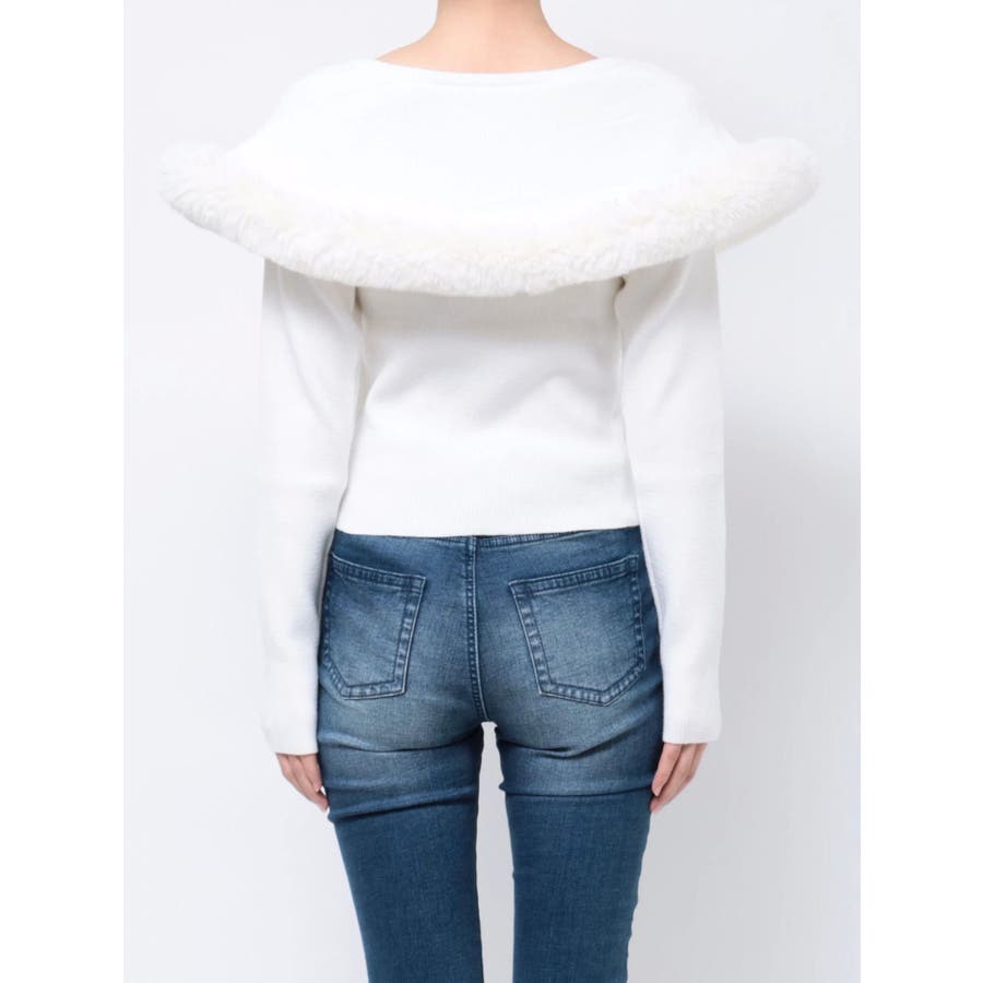 冬にピッタリのニットトップスが登場♪▽デザイン▽1枚でケープが付いたようなデザインで華やかな印象を与えてくれるニットトップス。フェイクファーが愛らしく、コーデのポイントに◎首元を開けたことで重たくならず、女性らしさをプラスしてくれる抜け感に。ボディと袖はタイトなサイズ感にしたことでボリュームが出すぎず、メリハリのあるシルエットに仕上がります。▽カラー▽白・黒・ベージュの3色展開。▽スタイリング▽ボトムはスカート合わせでとことん女性らしくまとめたスタイルがオススメ!冬の特別なシーンにぴったりなデザインでコートを脱いでもお洒落なスタイルが叶います。※着用画像はフラッシュの加減で実際の製品と色味等が異なる場合がございますので、生地のズームアップ画像をご確認ください。※ご利用の端末画面の設定により実際の商品と色味が異なる場合がございます。【商品特徴】透け感:なし伸縮性:あり生地の厚さ:普通サイズ感:普通裏地:なしポケット:なし