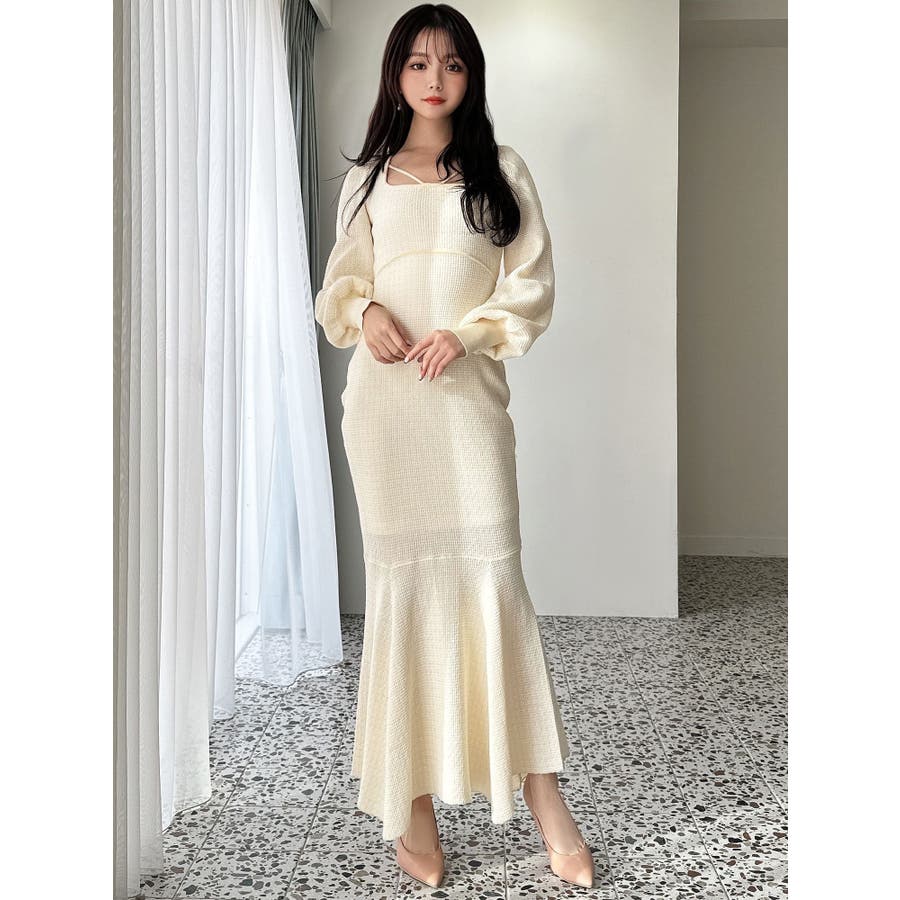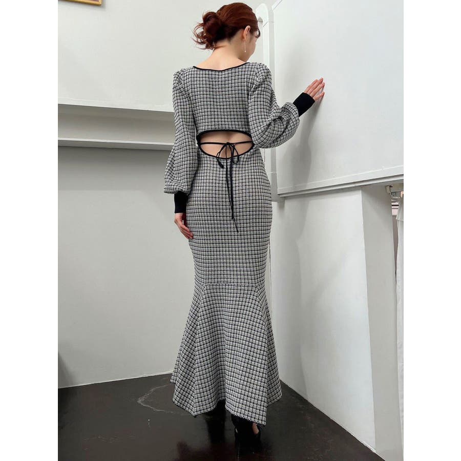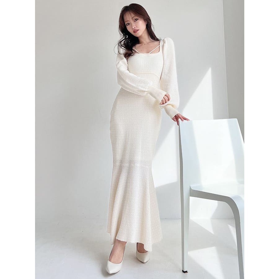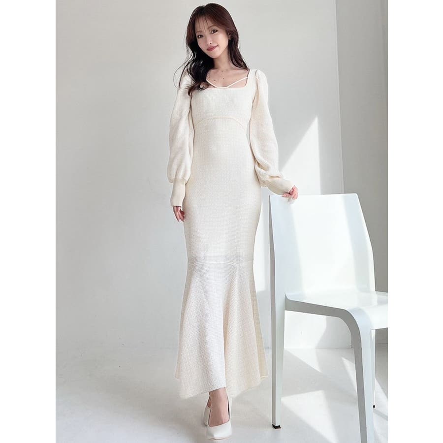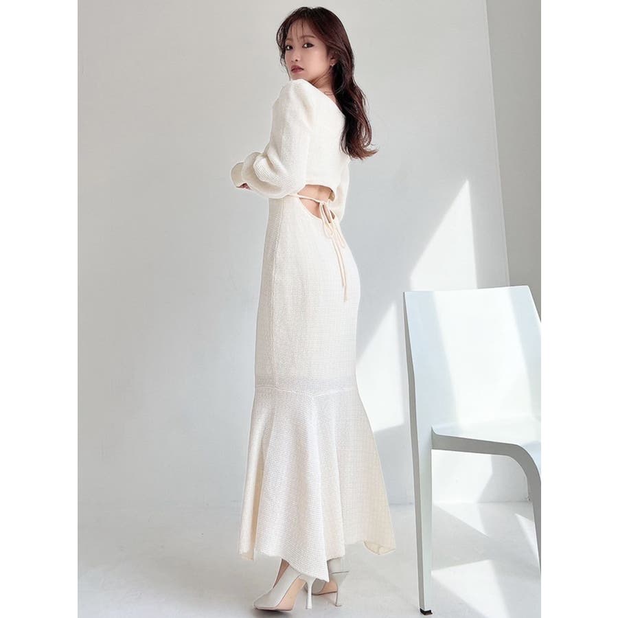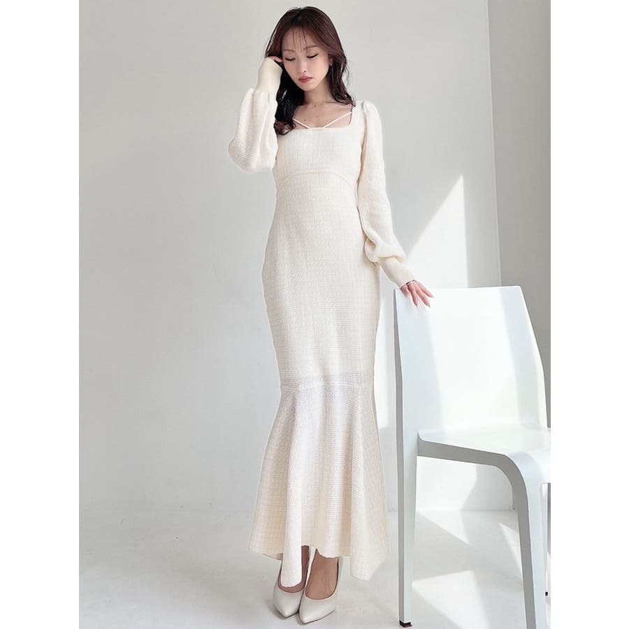 イチオシのツイードマーメイドワンピース▽デザイン▽ジャガード編みでツイード調のニットワンピースを作りました♪涼しげなシャリっとした糸を使用し、春らしい素材感でツイードニットをお楽しみ頂ける1着。数カラーの糸を組み合わせて立体感ある配色を作り、部分的に濃色にしたことで全体が締まる印象にしました。人気のバックオープンデザインにし、バックリボンでウエスト調節が可能◎バスト下に切り替えのラインを入れたことでスタイルアップ効果も。デコルテはスクエアネックで華奢見えするデザインに。裏地付きなので1枚で安心して着用していただけます。▽カラー▽白・黒・青の3色展開。▽スタイリング▽1枚でキレイめスタイリングが完成◎身頃はボディにフィットするサイズ感なのでトレンチコートやジャケット合わせも◎※着用画像はフラッシュの加減で実際の製品と色味等が異なる場合がございますので、生地のズームアップ画像をご確認ください。※ご利用の端末画面の設定により実際の商品と色味が異なる場合がございます。【商品特徴】透け感:なし伸縮性:ややあり生地の厚さ:普通サイズ感:普通裏地:ありポケット:なしファスナー:なし