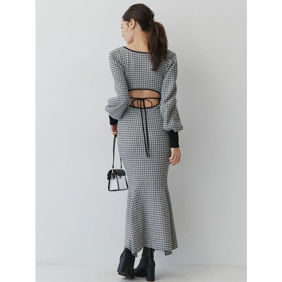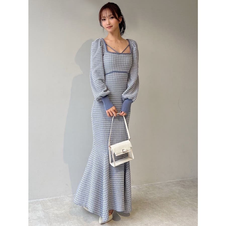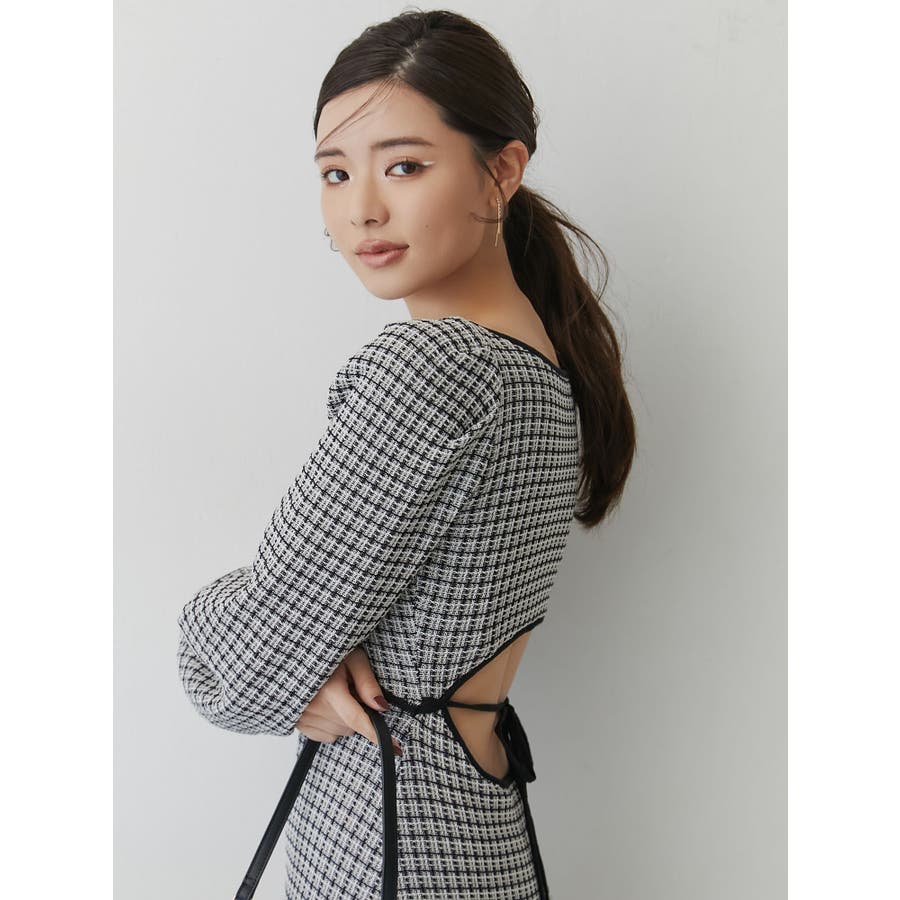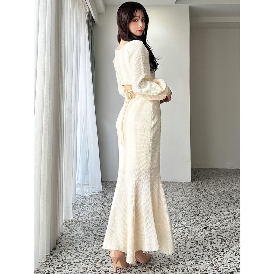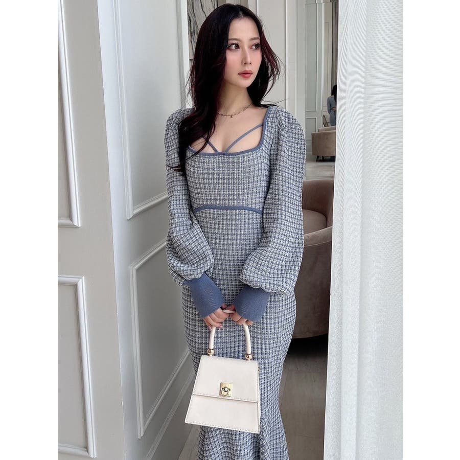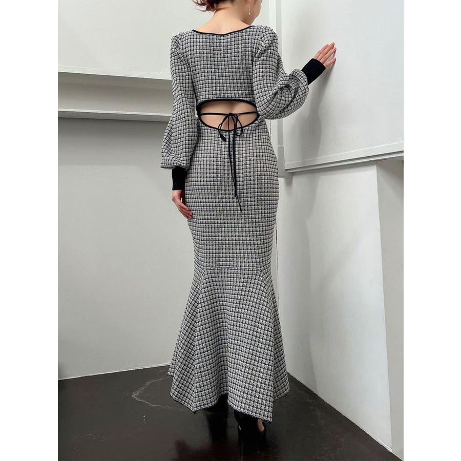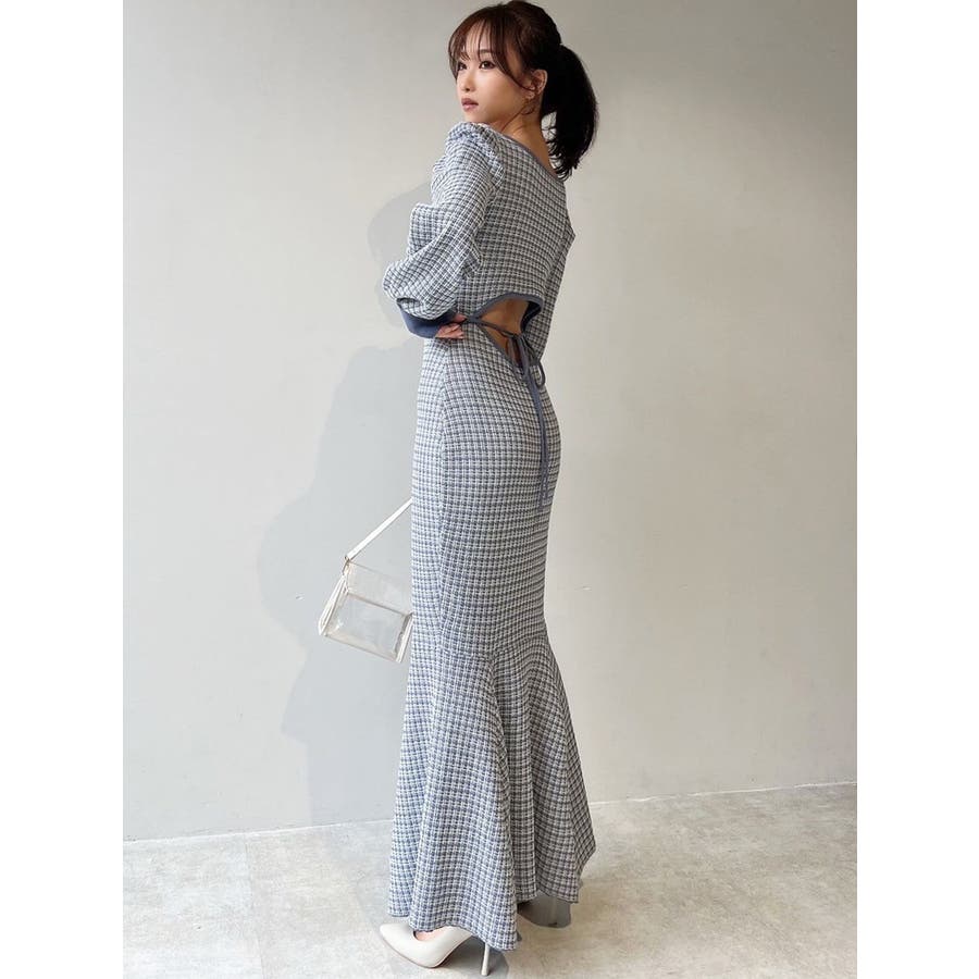 イチオシのツイードマーメイドワンピース▽デザイン▽ジャガード編みでツイード調のニットワンピースを作りました♪涼しげなシャリっとした糸を使用し、春らしい素材感でツイードニットをお楽しみ頂ける1着。数カラーの糸を組み合わせて立体感ある配色を作り、部分的に濃色にしたことで全体が締まる印象にしました。人気のバックオープンデザインにし、バックリボンでウエスト調節が可能◎バスト下に切り替えのラインを入れたことでスタイルアップ効果も。デコルテはスクエアネックで華奢見えするデザインに。裏地付きなので1枚で安心して着用していただけます。▽カラー▽白・黒・青の3色展開。▽スタイリング▽1枚でキレイめスタイリングが完成◎身頃はボディにフィットするサイズ感なのでトレンチコートやジャケット合わせも◎※着用画像はフラッシュの加減で実際の製品と色味等が異なる場合がございますので、生地のズームアップ画像をご確認ください。※ご利用の端末画面の設定により実際の商品と色味が異なる場合がございます。【商品特徴】透け感:なし伸縮性:ややあり生地の厚さ:普通サイズ感:普通裏地:ありポケット:なしファスナー:なし