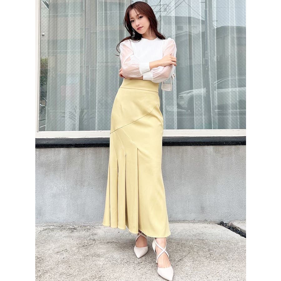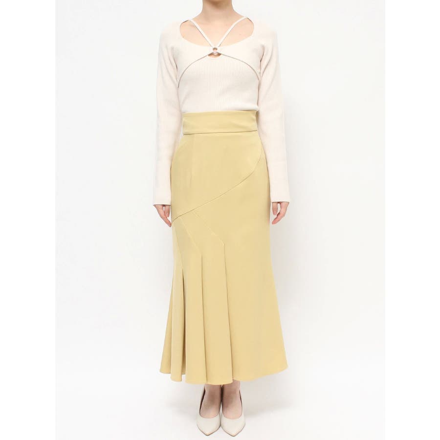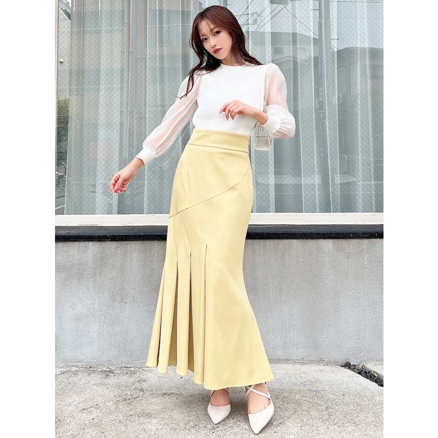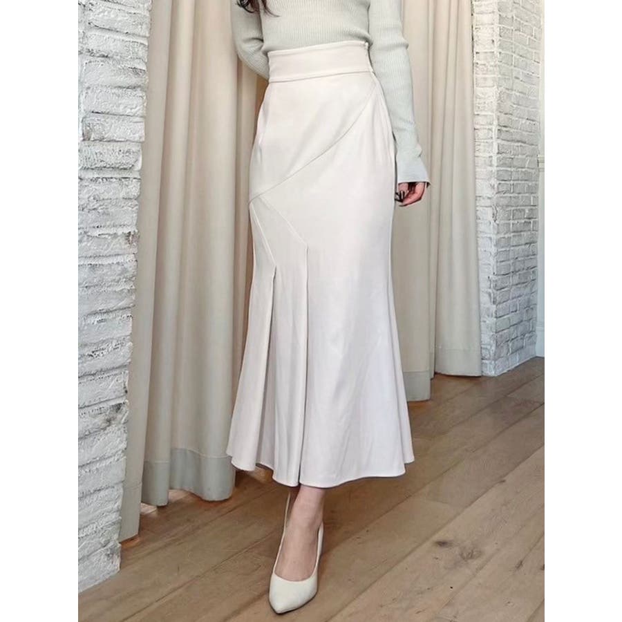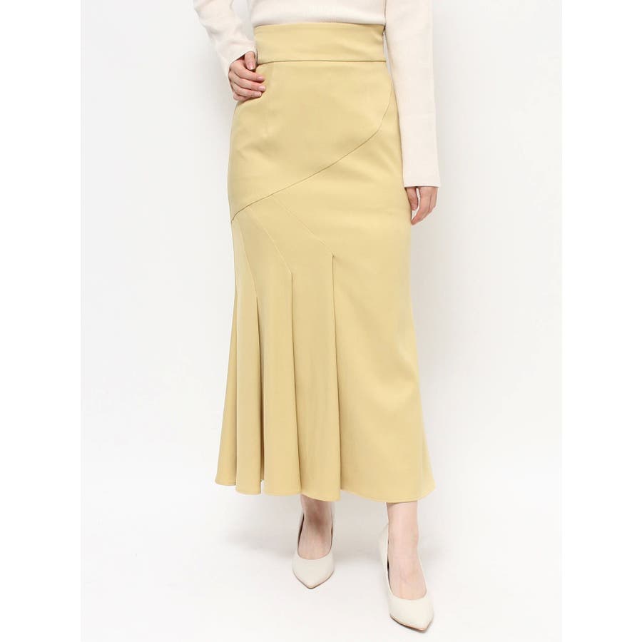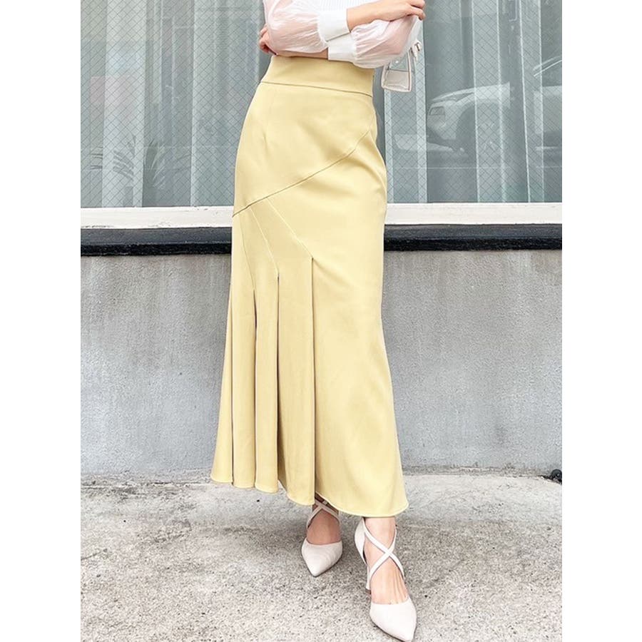 アシンメトリーに入ったタックがポイントのマーメイドスカート▽デザイン▽他にはないメリハリを効かせたデザインで、こなれ感を出した大人な雰囲気のある一枚です。裾に向かって緩やかに広がるマーメイドシルエットにしたことで身体のラインを拾いすぎず着やすい1枚に仕上げました。ハイウエストなのでウエストラインはしっかりと引き締め、美しいシルエットのスタイリングになります◎▽カラー▽白・黒・黄色の3色展開。▽スタイリング▽タイトなニットをインしたスタイリングはもちろん、オーバーサイズのトップスをアウトで着てもすっきりまとまります。1枚持っていればシーズンレスに着用できる万能スカートです♪※着用画像はフラッシュの加減で実際の製品と色味等が異なる場合がございますので、生地のズームアップ画像をご確認ください。※ご利用の端末画面の設定により実際の商品と色味が異なる場合がございます。【商品特徴】透け感:なし伸縮性:なし生地の厚さ:普通サイズ感:普通 裏地:ありポケット:なし