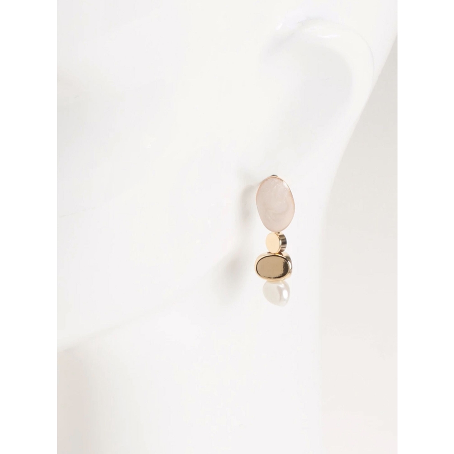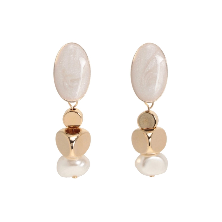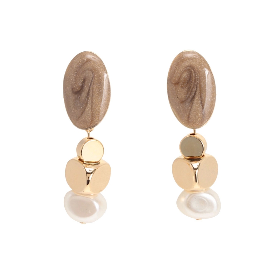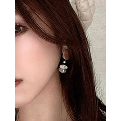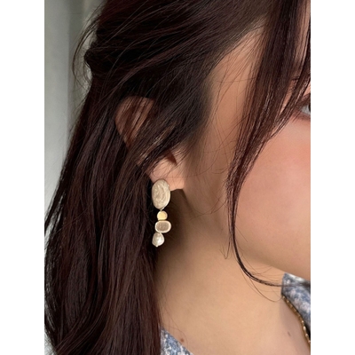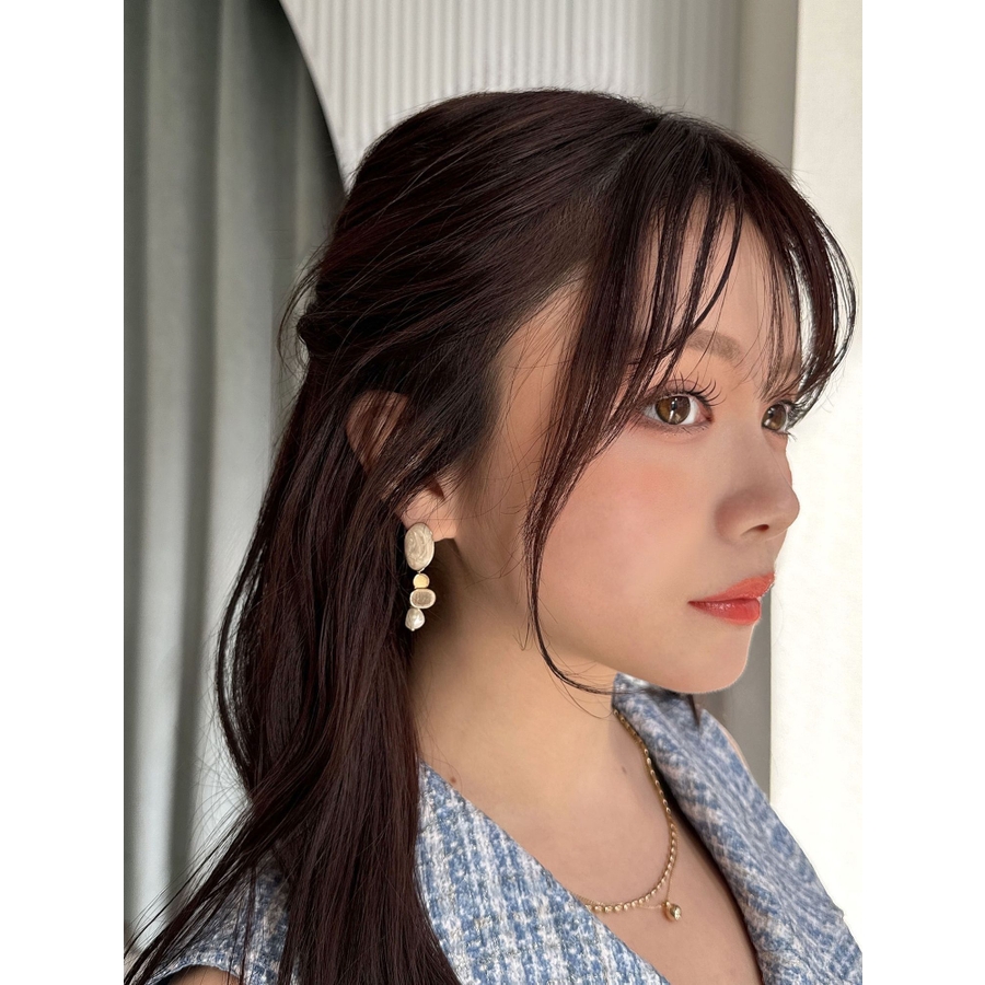 季節感のあるパーツをあしらったデザイン性のあるピアス。ゴールドパーツと先端のパールが顔周りを華やかに見せてくれます。どちらのカラーもコーデの邪魔をせず、使いやすさも◎