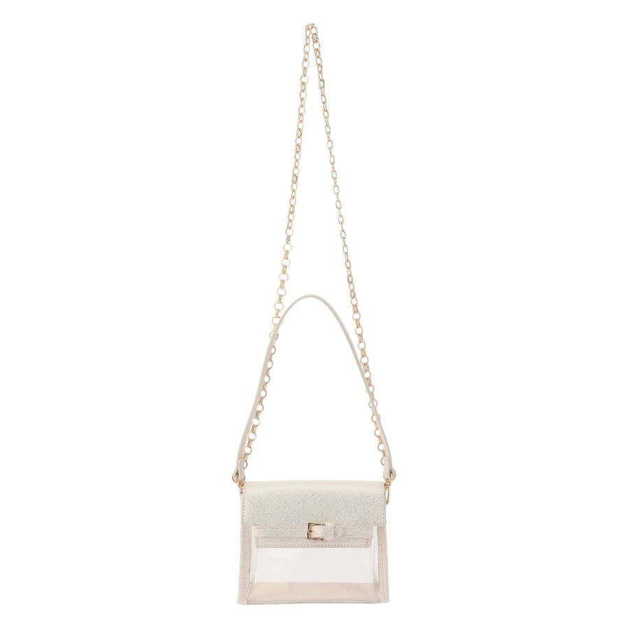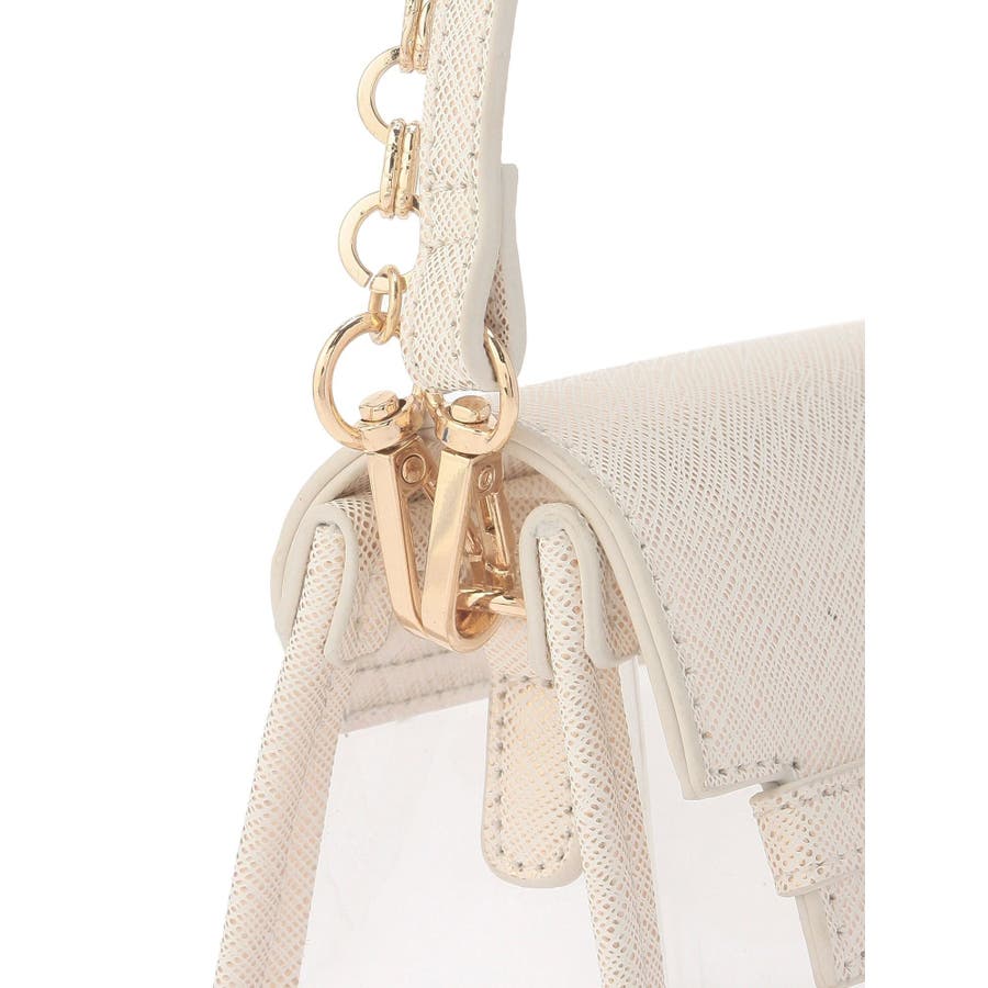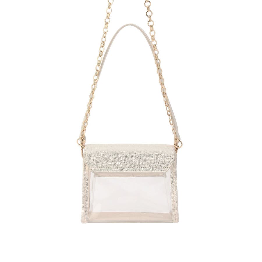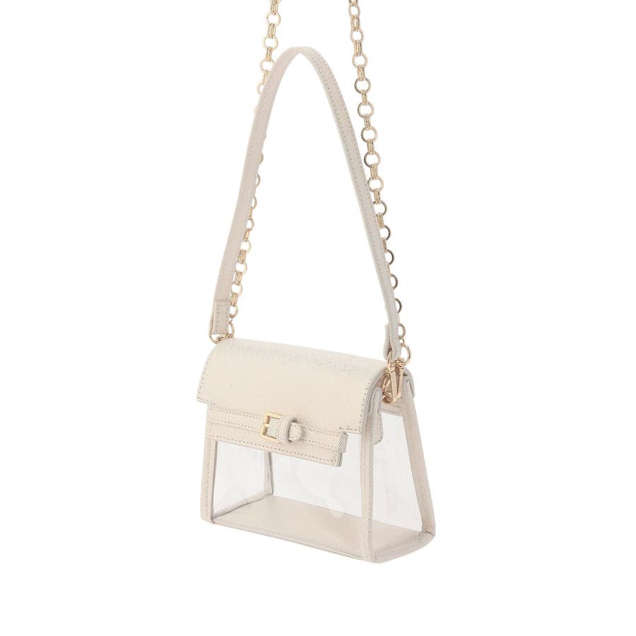 コンパクトなサイズ感で使いやすいクリアバッグ▽デザイン▽フラップ部分は表面感のある生地にして高級感を持たせ、メリハリを付けました♪クリアバッグにしたことで夏まで使いやすい涼しげな印象に。取り外し可能なチェーンショルダーを付けたのでハンドバッグとしてもショルダーバッグとしても使用できる2WAY仕様。▽カラー▽白・黒・青の3色展開。白はシャイニー感あるゴールド混じりのカラーになります。