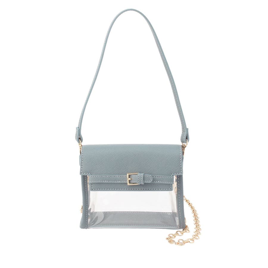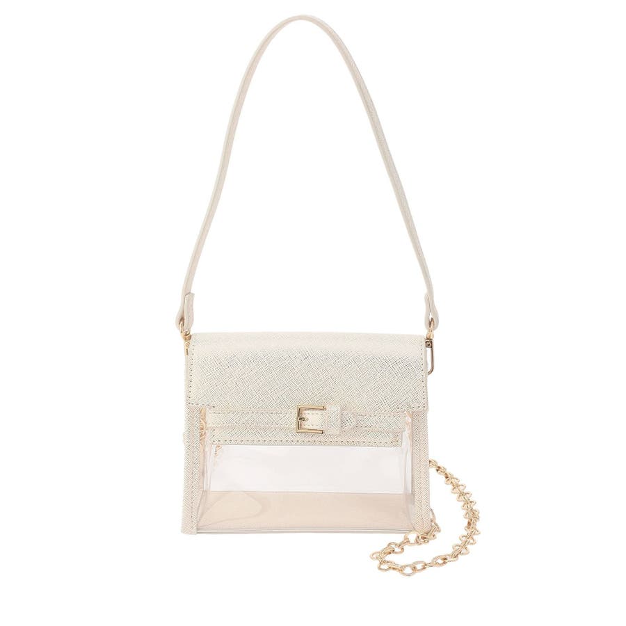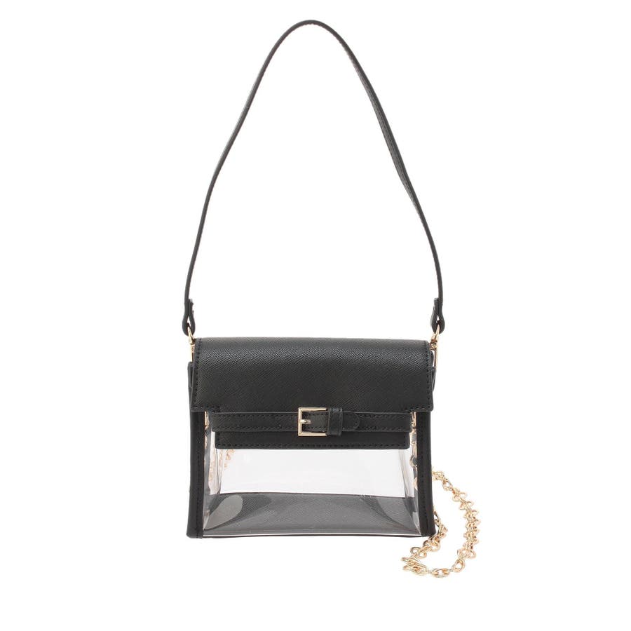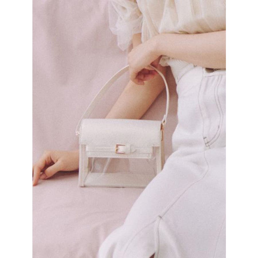 コンパクトなサイズ感で使いやすいクリアバッグ▽デザイン▽フラップ部分は表面感のある生地にして高級感を持たせ、メリハリを付けました♪クリアバッグにしたことで夏まで使いやすい涼しげな印象に。取り外し可能なチェーンショルダーを付けたのでハンドバッグとしてもショルダーバッグとしても使用できる2WAY仕様。▽カラー▽白・黒・青の3色展開。白はシャイニー感あるゴールド混じりのカラーになります。