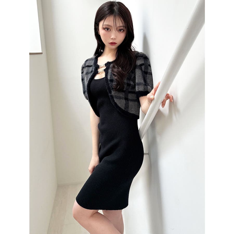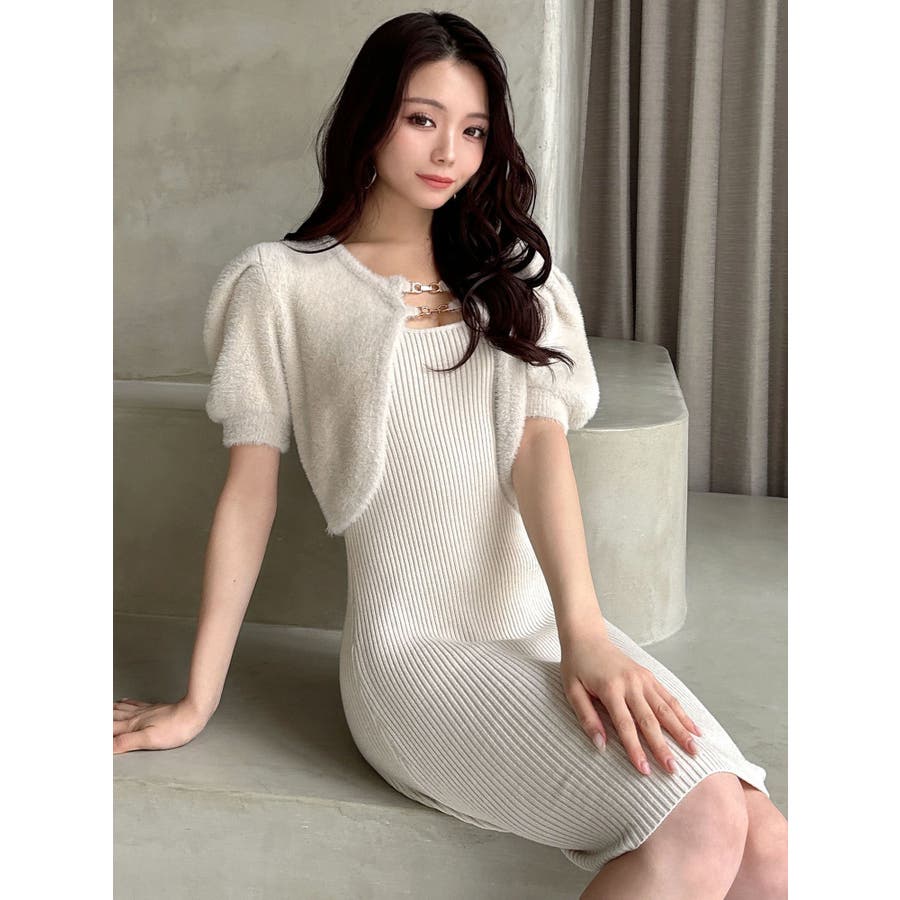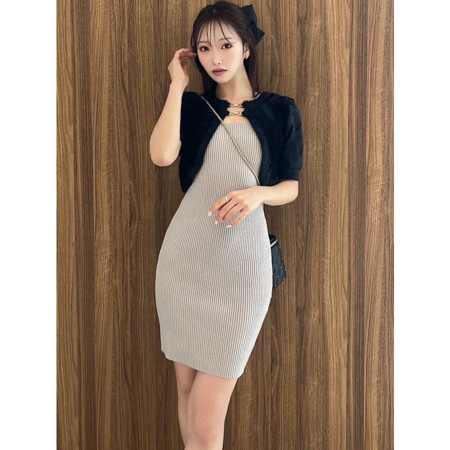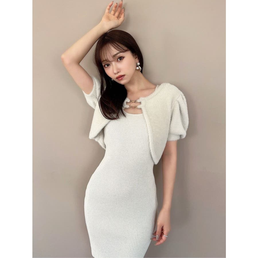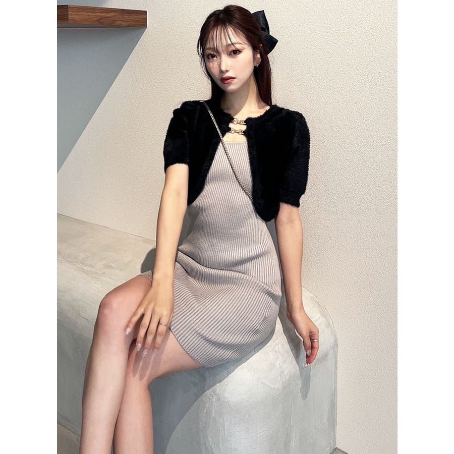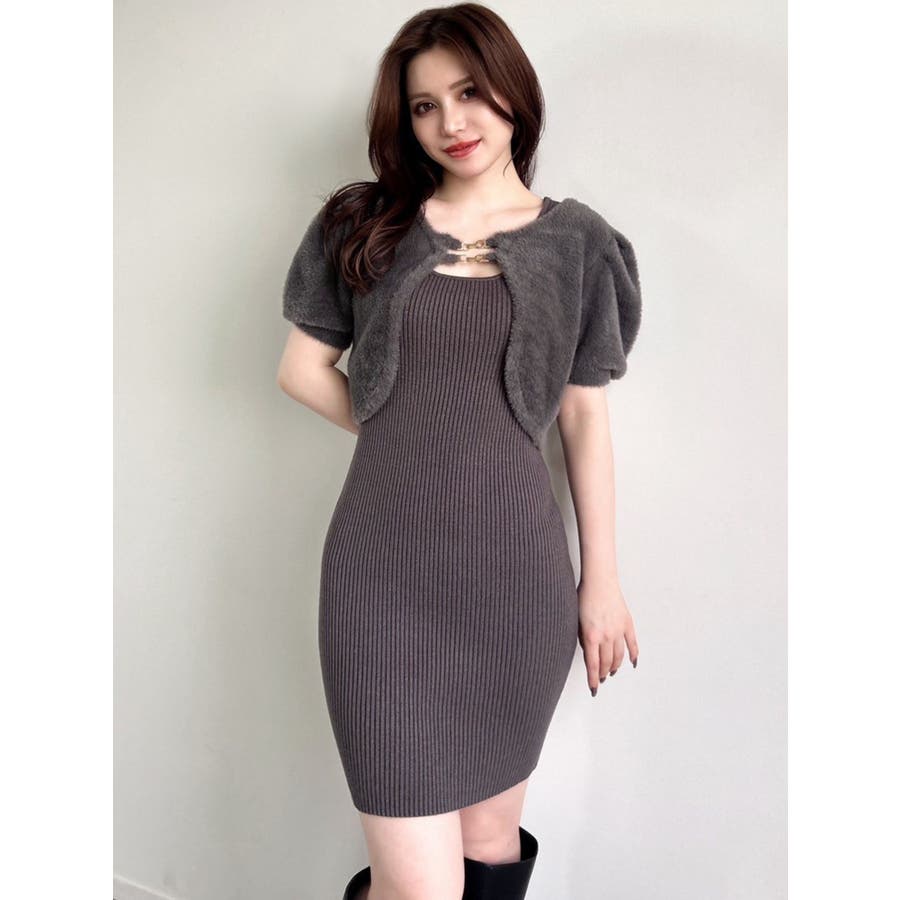 ミニ丈のニットワンピースとミニシャギーのボレロがセットになったアイテム。