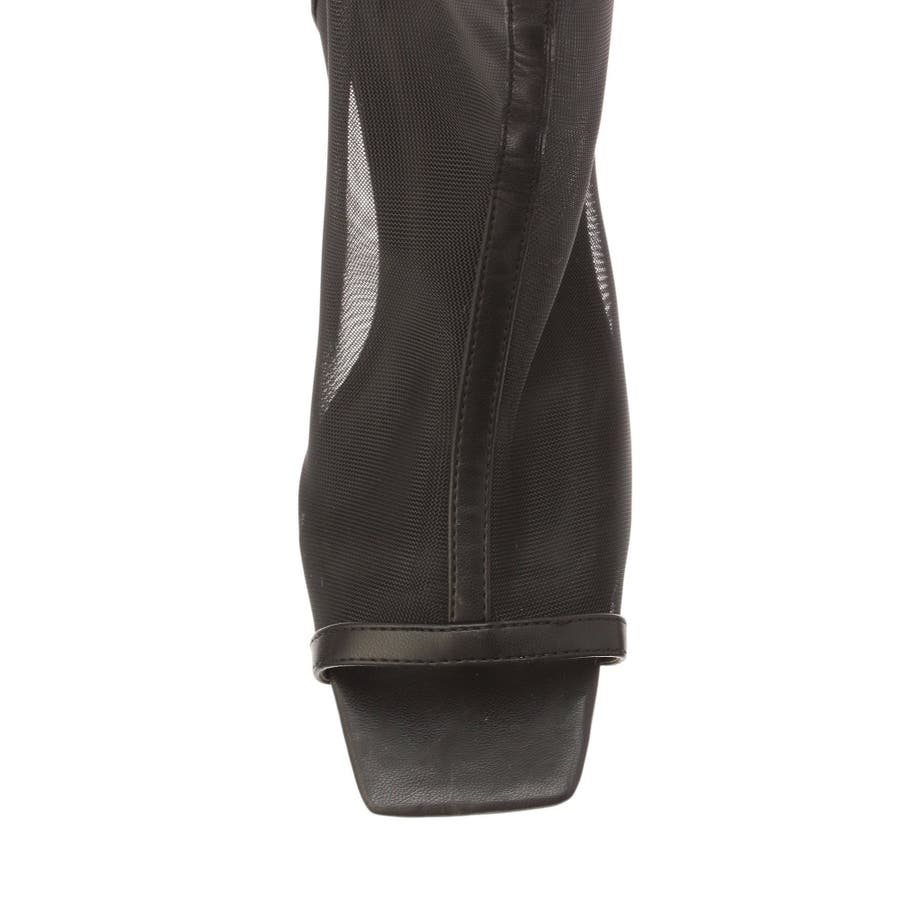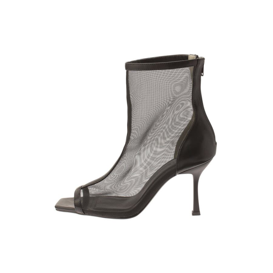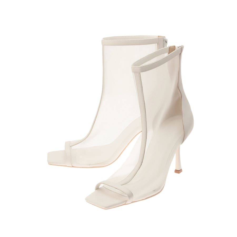 シアー感のあるボディに華奢なピンヒールを組み合わせたメッシュブーツ▽デザイン▽つま先のラインはスクエアトゥでシャープに仕上げ、モードな雰囲気もプラス。歩きやすく、スタイルアップも叶える9センチヒールもこだわりです。華奢なピンヒールが後ろ姿も可愛くコーデをアップデート♪春先や秋口にピッタリの1足です。ワンピースなどと合わせた普段使いからパーティーシーンまで、幅広いシーンでお使いいただけます。▽カラー▽使いやすい白・黒とシーズンムードを高めるブラウンの3色展開。【スタッフ着用レビュー】スタッフC(普段のサイズ: 24.0cm/足の幅: 9.7cm/甲の高さ: 6.1cm/ふくらはぎ周り:33.5cm)Mサイズ着用でピッタリでした。オープントゥとメッシュ素材で夏~秋にかけて重宝できる1足です。後ろにファスナーがあるので着脱もしやすいです。