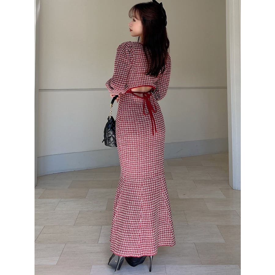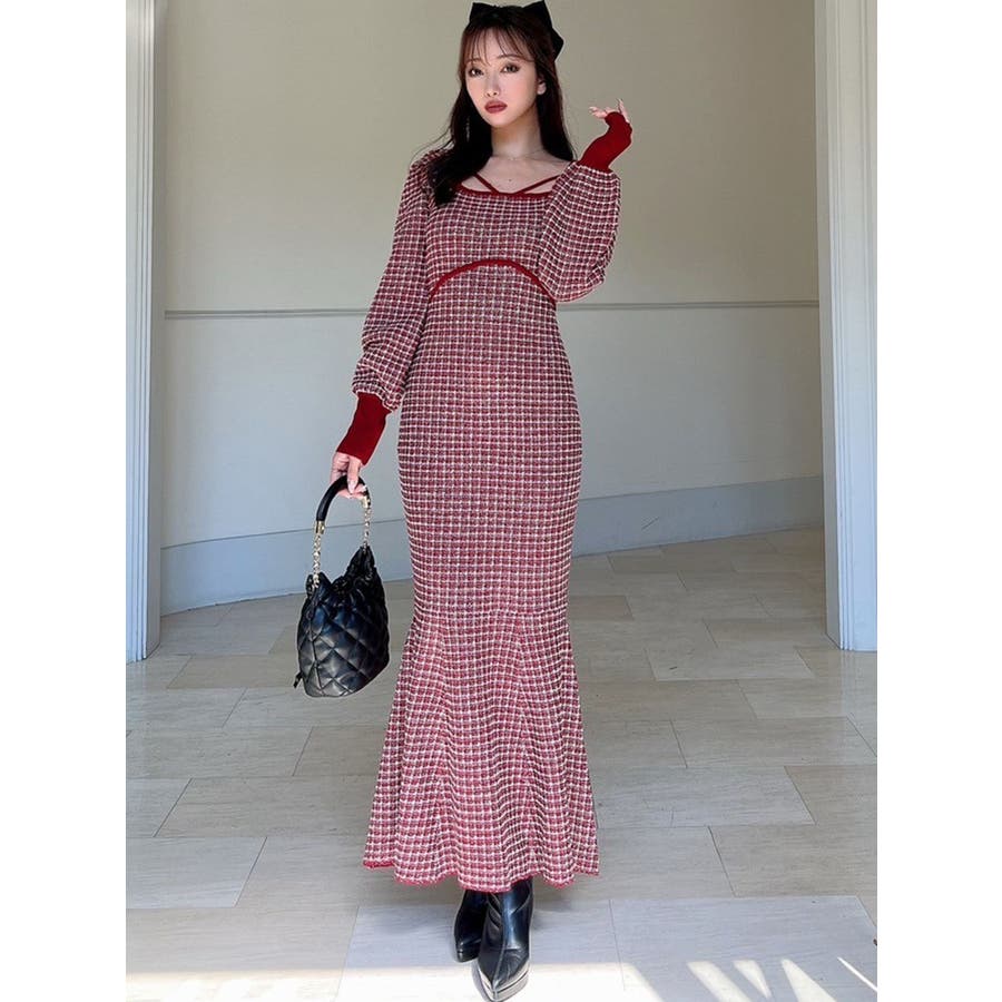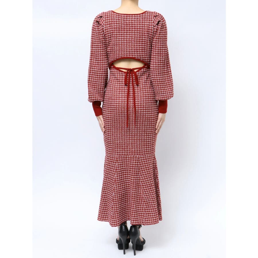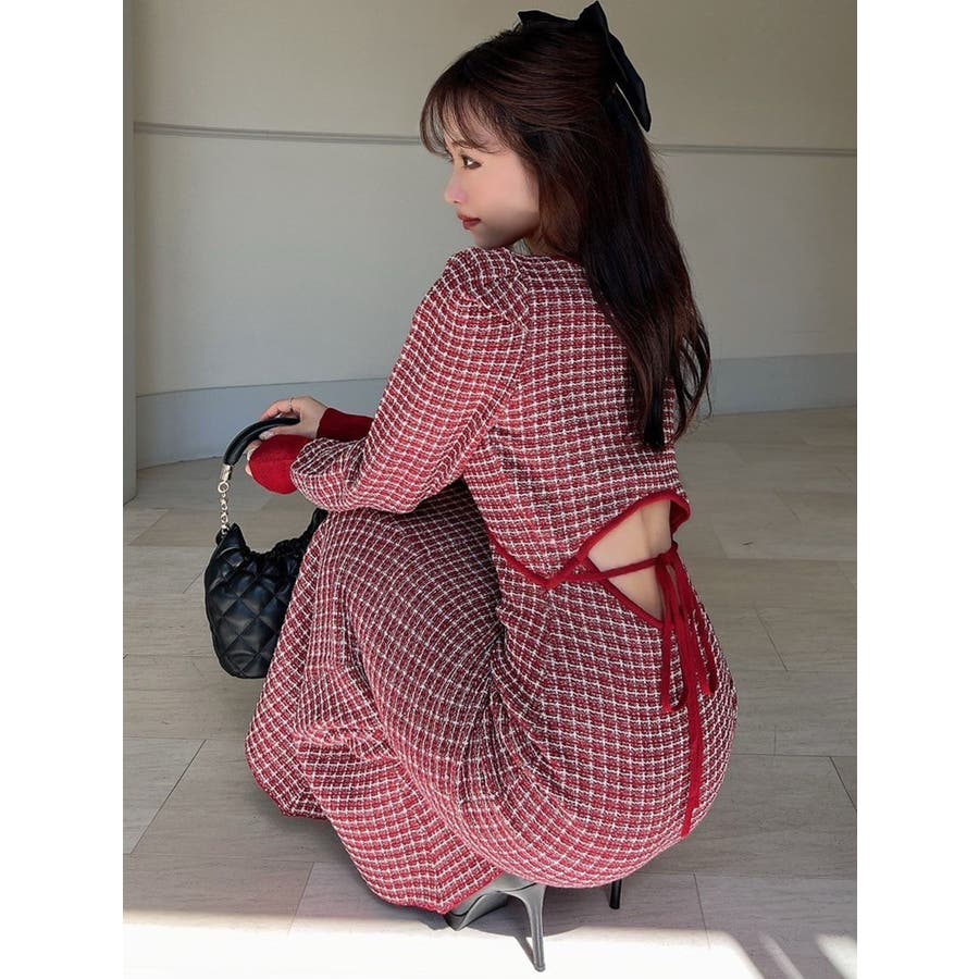 コーデを華やかに冬見せしてくれるマーメイドワンピース▽デザイン▽1枚で女性らしいスタイルが完成するコーデの主役アイテム◎ツイードデザインが上品な印象を与えてくれ、季節感を高めます。バックリボンと背中開きが後ろ姿まで女性らしくデザインポイントに。バスト下にカーブの切り替えを入れ、バックリボンでウエストを絞れるので1枚でウエストの細見えが叶う美シルエットワンピースです。▽カラー▽黒・赤・青の3色展開。▽スタイリング▽1枚でコーデが完成するので小物合わせで様々なスタイルをお楽しみいただけます。アウター合わせはもちろん1枚で着てもサマになるので秋~春先まで長く活躍します。ブーツやミュールなど女性らしいアイテムでまとめるのがオススメ!※着用画像はフラッシュの加減で実際の製品と色味等が異なる場合がございますので、生地のズームアップ画像をご確認ください。※ご利用の端末画面の設定により実際の商品と色味が異なる場合がございます。【商品特徴】透け感:なし伸縮性:あり生地の厚さ:普通サイズ感:普通裏地:ありポケット:なしファスナー:なし