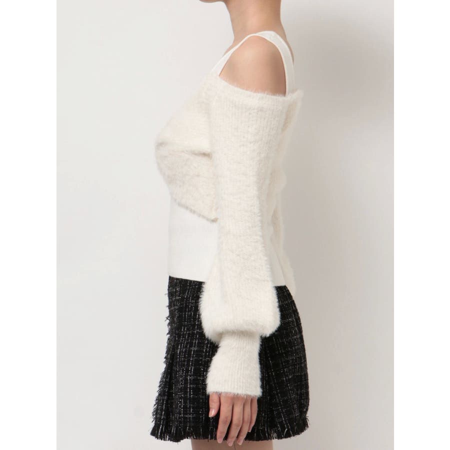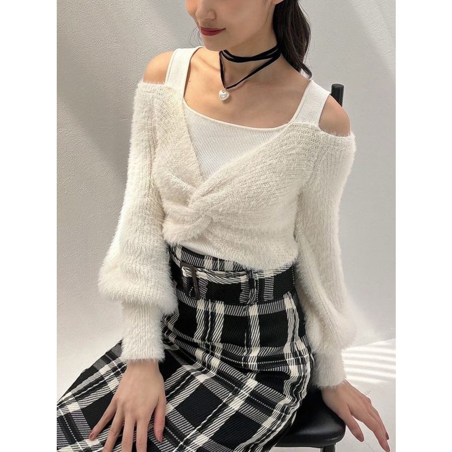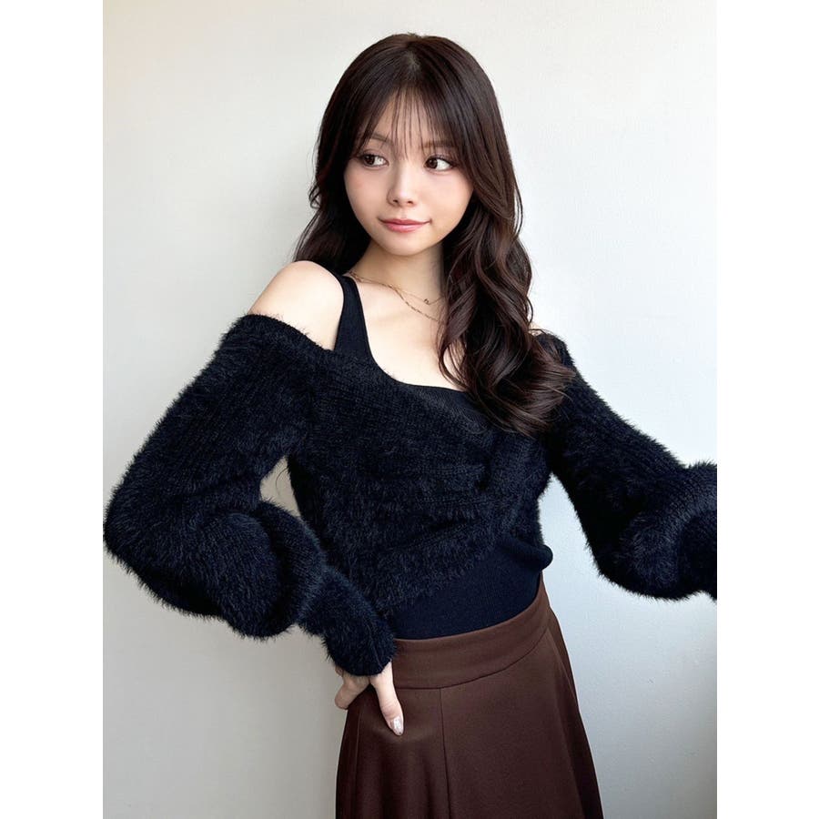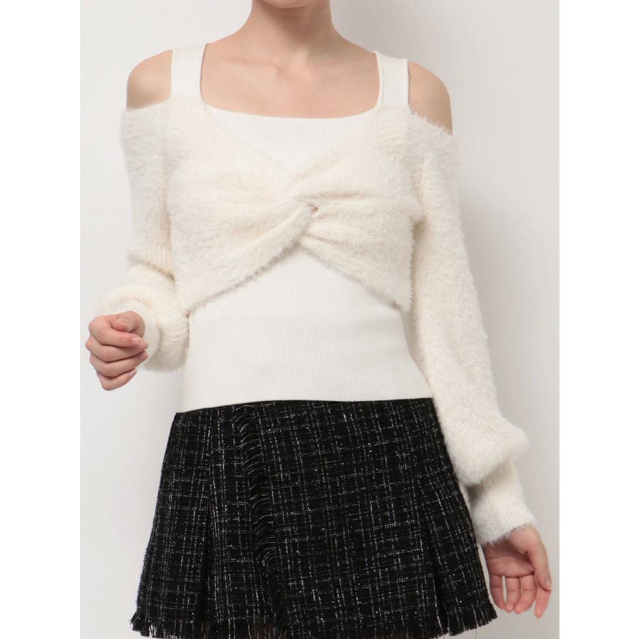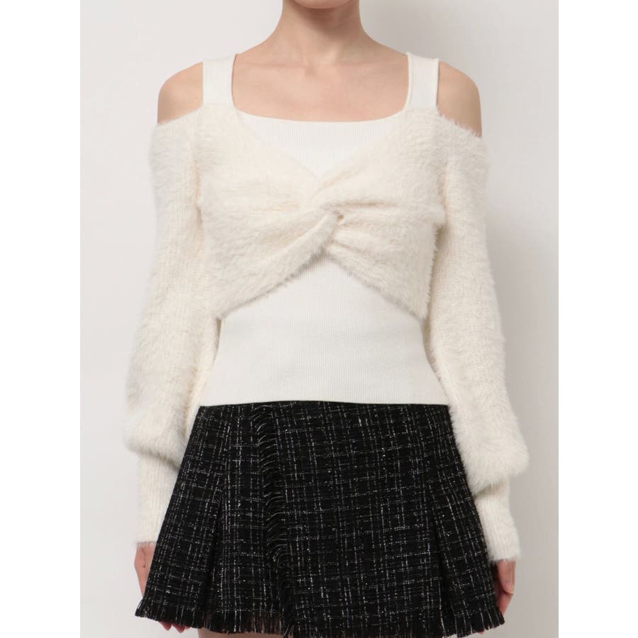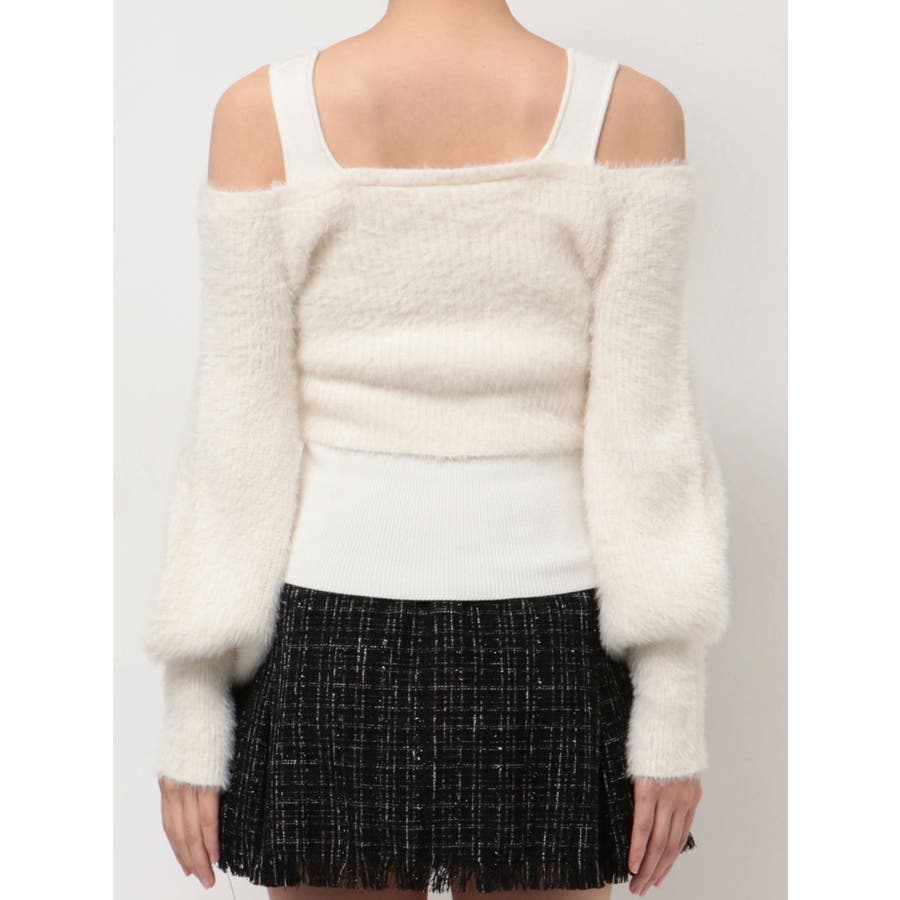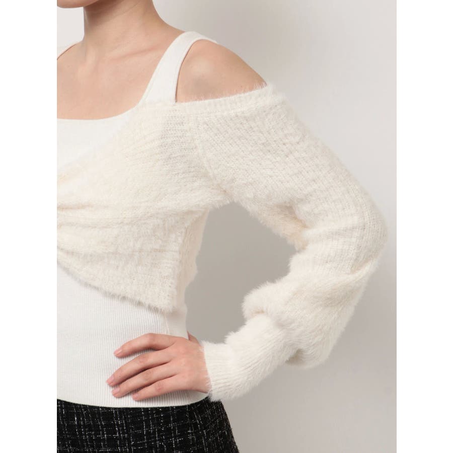 レイヤードデザインで女性らしさUPのニット▽デザイン▽リブタンクの上からオフショルニットを重ねたデザインにし、異素材のレイヤード見えがおしゃれな1着。スクエアネックとオフショルデザインが程よく肌見せでき女性らしさをプラス。シャギーニットはバスト下までなので、ウエスト部分はボディにフィットするリブニット素材でスタイルアップ効果も◎シャギーがシーズンムードを高めてくれます。▽カラー▽白・黒・ピンクの3色展開。▽スタイリング▽ハイウエストボトムにインしてコンパクトにまとめるのがオススメ!スカートでとことん女性らしく合わせたスタイリングがピッタリ◎※着用画像はフラッシュの加減で実際の製品と色味等が異なる場合がございますので、生地のズームアップ画像をご確認ください。※ご利用の端末画面の設定により実際の商品と色味が異なる場合がございます。【商品特徴】透け感:なし伸縮性:ややあり生地の厚さ:普通サイズ感:普通裏地:なしポケット:なし