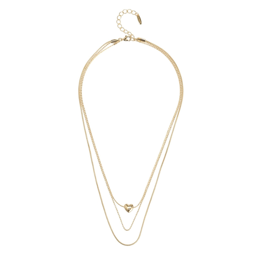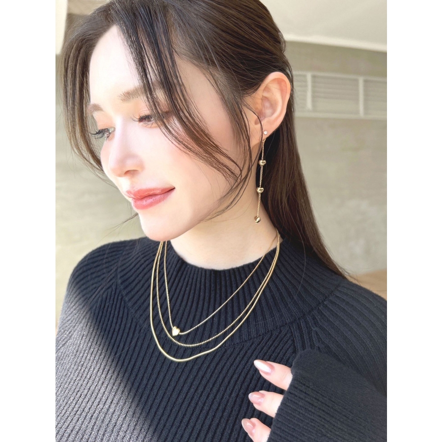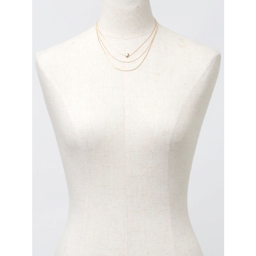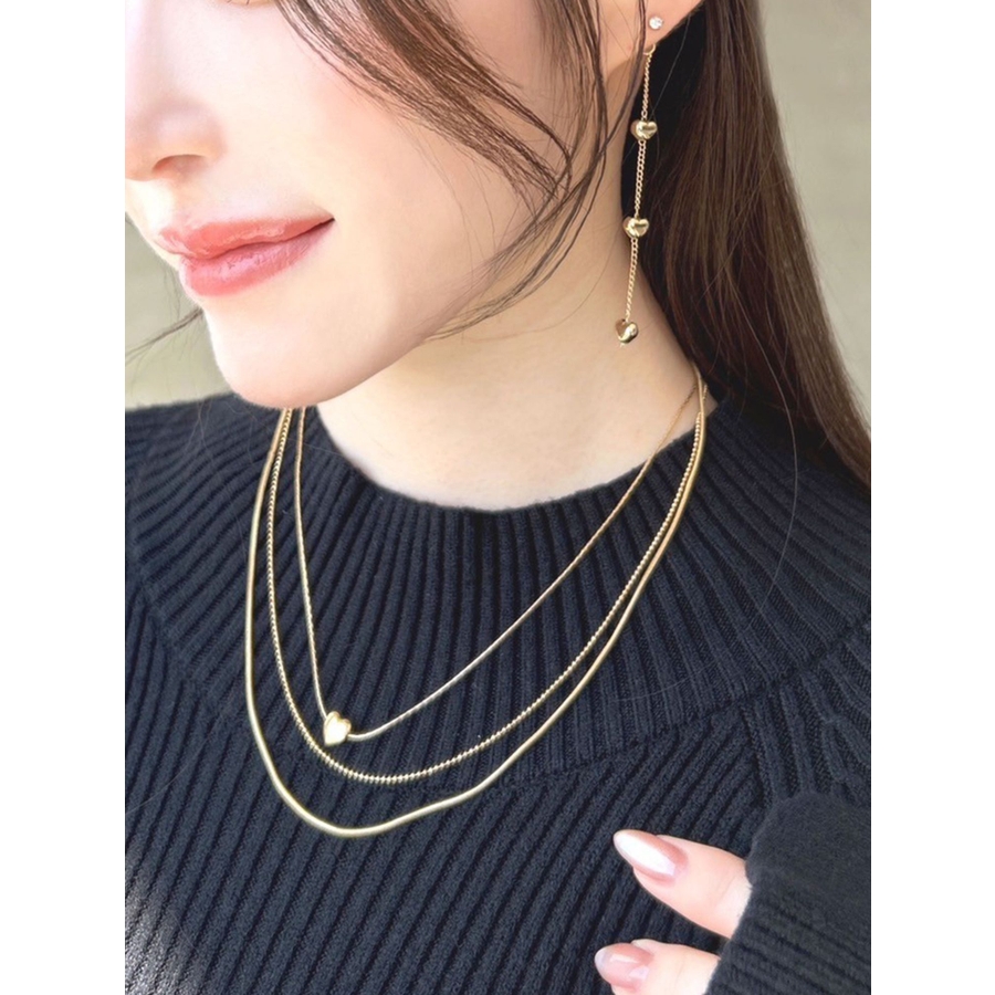 形の異なるチェーンを3種類使用したネックレス。真ん中には小さくハートのモチーフをあしらい今年らしいデザインに。ネックレス一つで首元を華やかに彩ってくれます。
