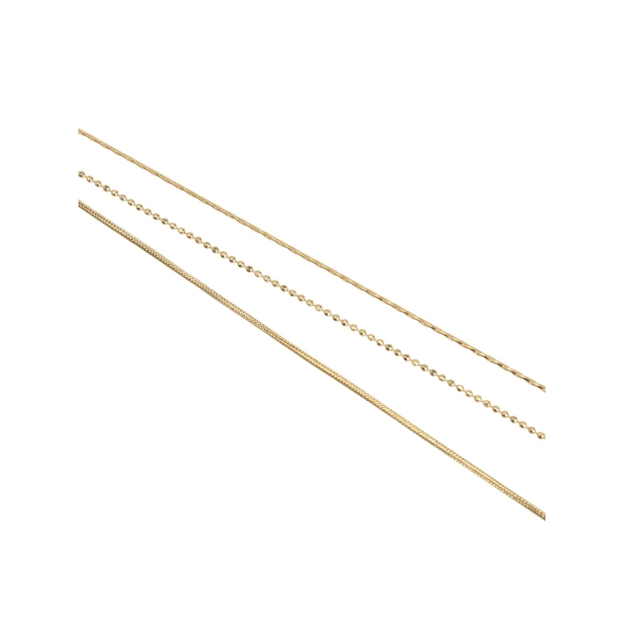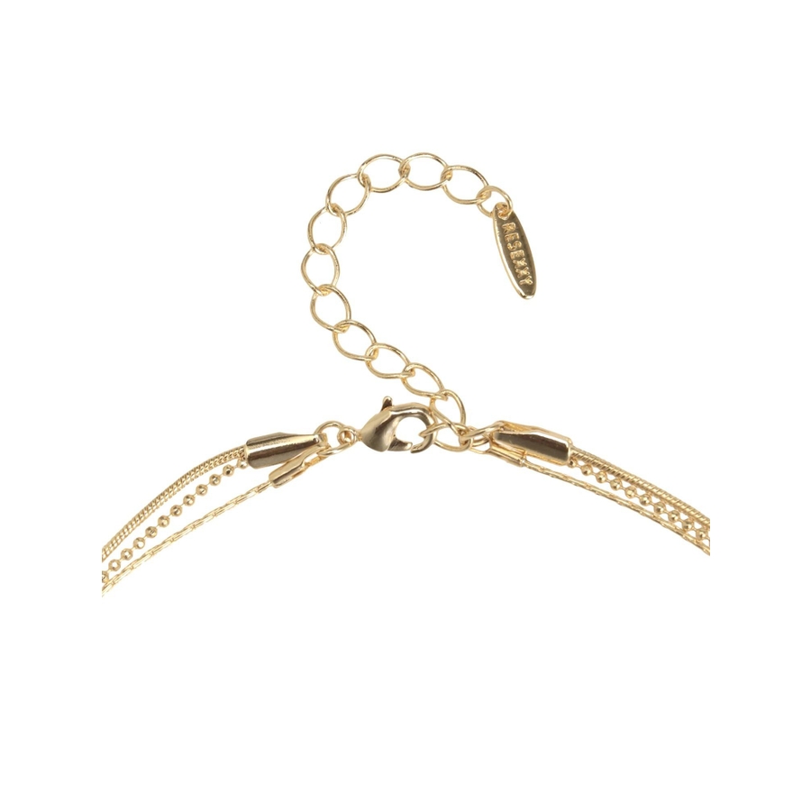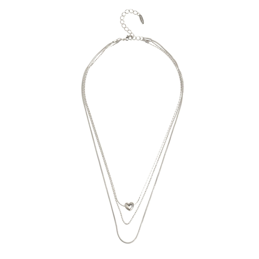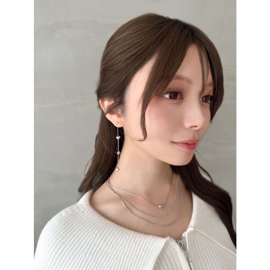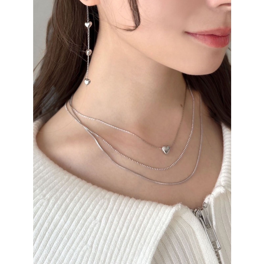 形の異なるチェーンを3種類使用したネックレス。真ん中には小さくハートのモチーフをあしらい今年らしいデザインに。ネックレス一つで首元を華やかに彩ってくれます。
