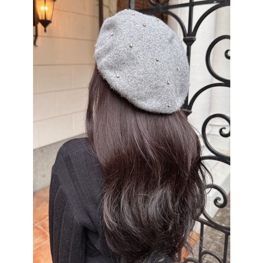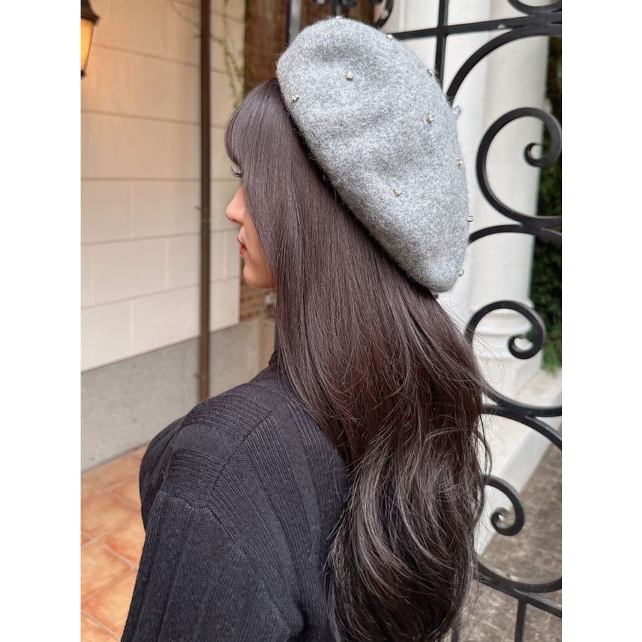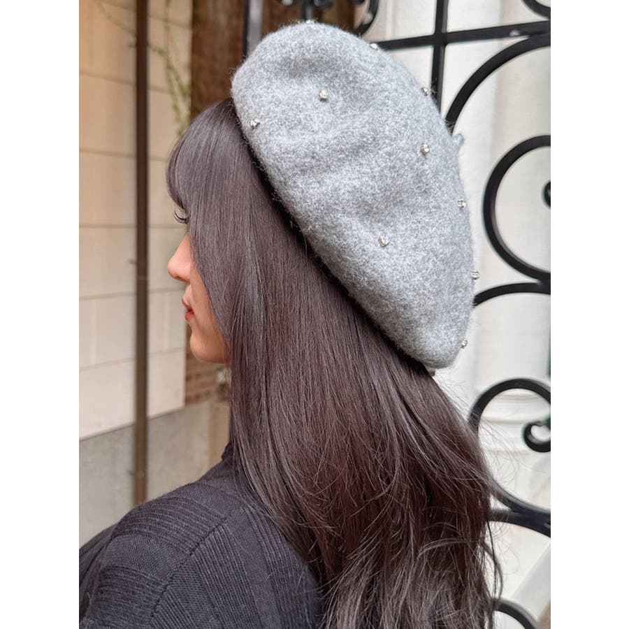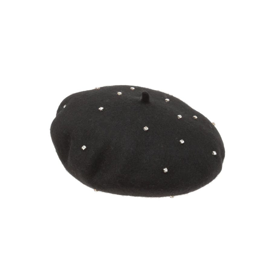 スタッズが散りばめられたベレー帽。定番の形にキラキラと輝くスタッズが可愛らしさと華やかさをプラス。形が作りやすい生地の為、様々なかぶり方が可能です♪秋冬のコーデを引き立たせてくれるアイテムです。
