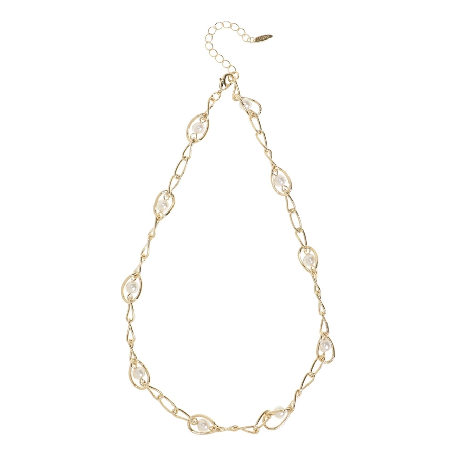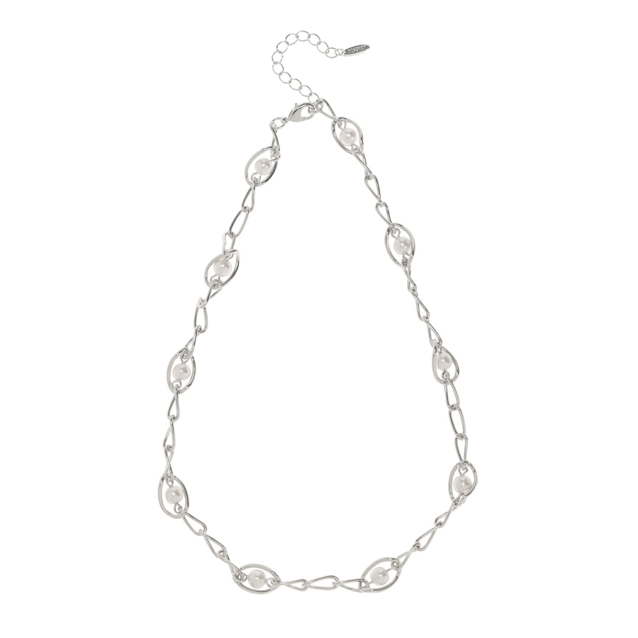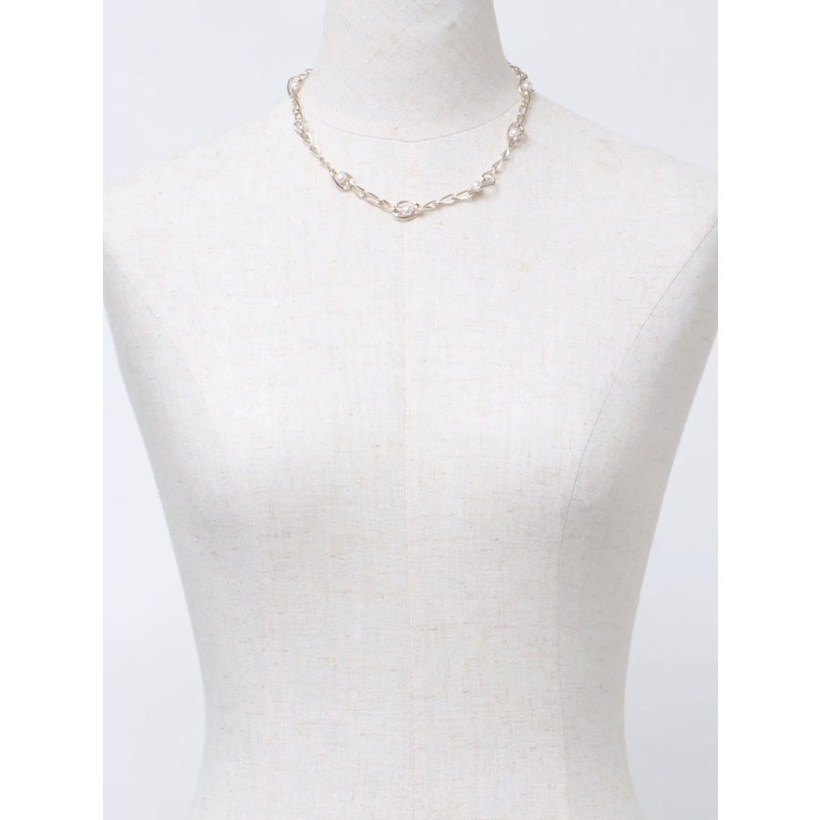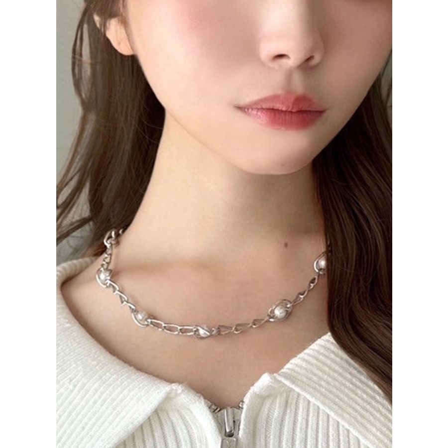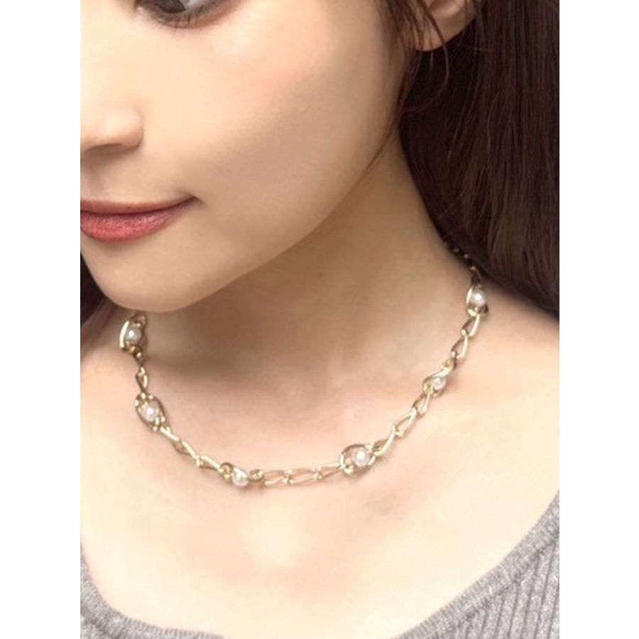 チェーンとパールを組み合わせたパールコンビメタルネックレス。散りばめられたパールが目を引き、存在感のあるチェーンが華やかに見せてくれます。どんなコーデにも合うネックレスです。