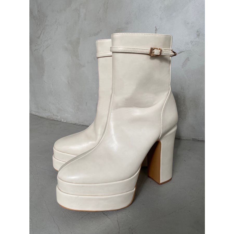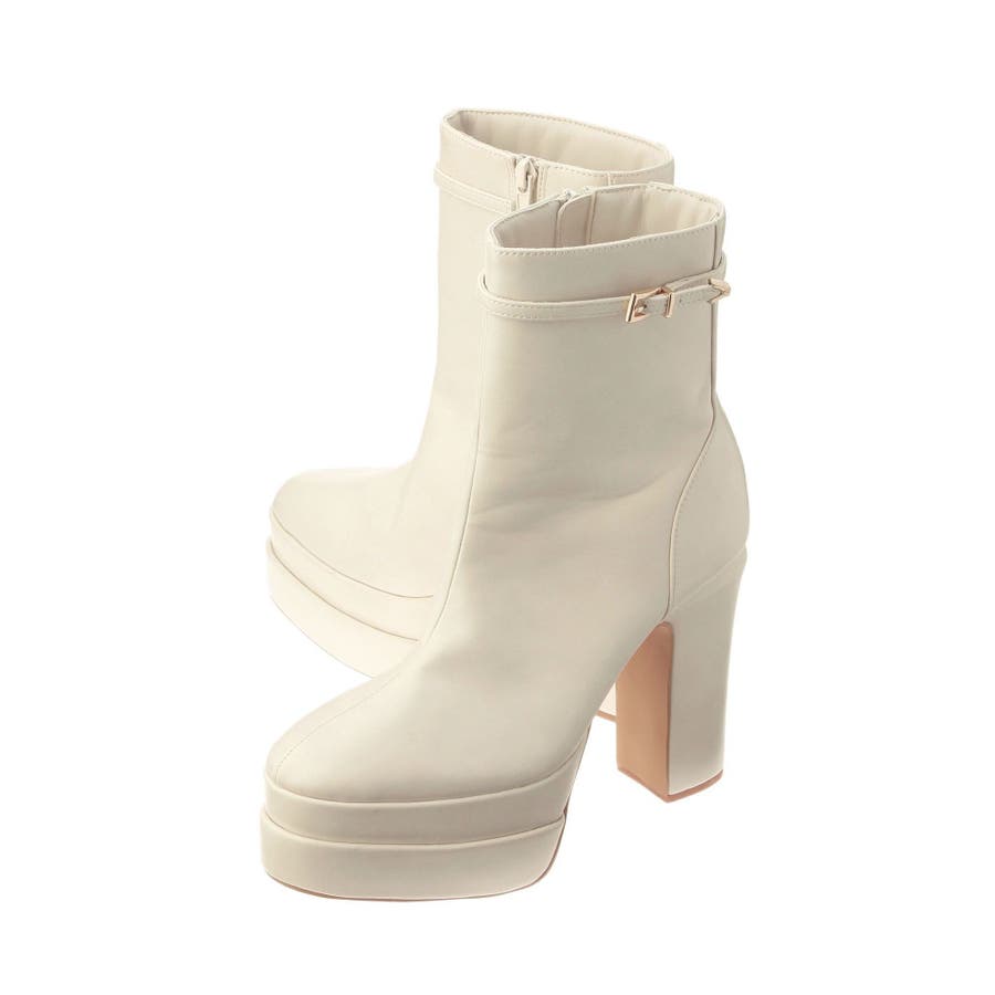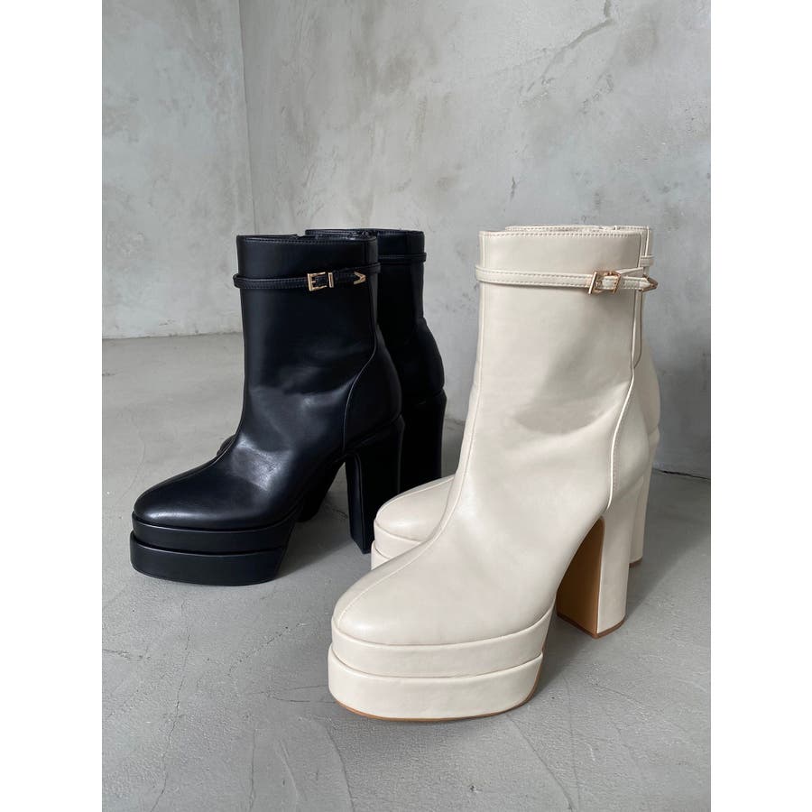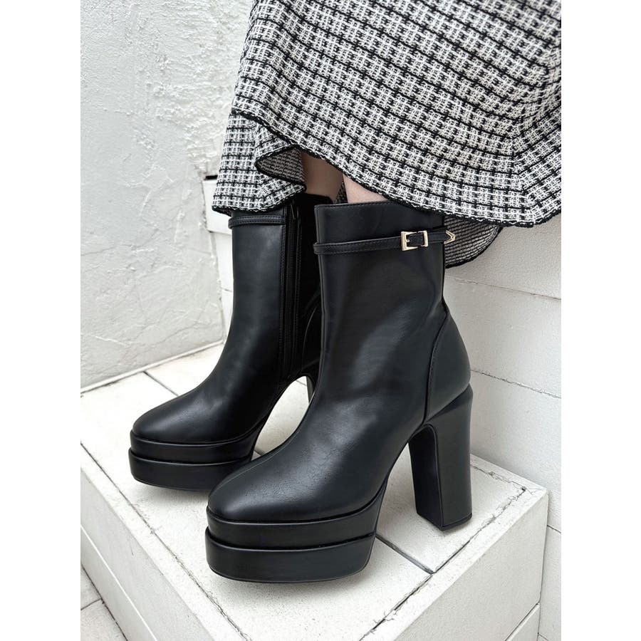 美脚効果抜群!シンプルで使いやすいショートブーツ▽デザイン▽ワンポイントでサイドにバックルを付けたプラットフォームブーツ。