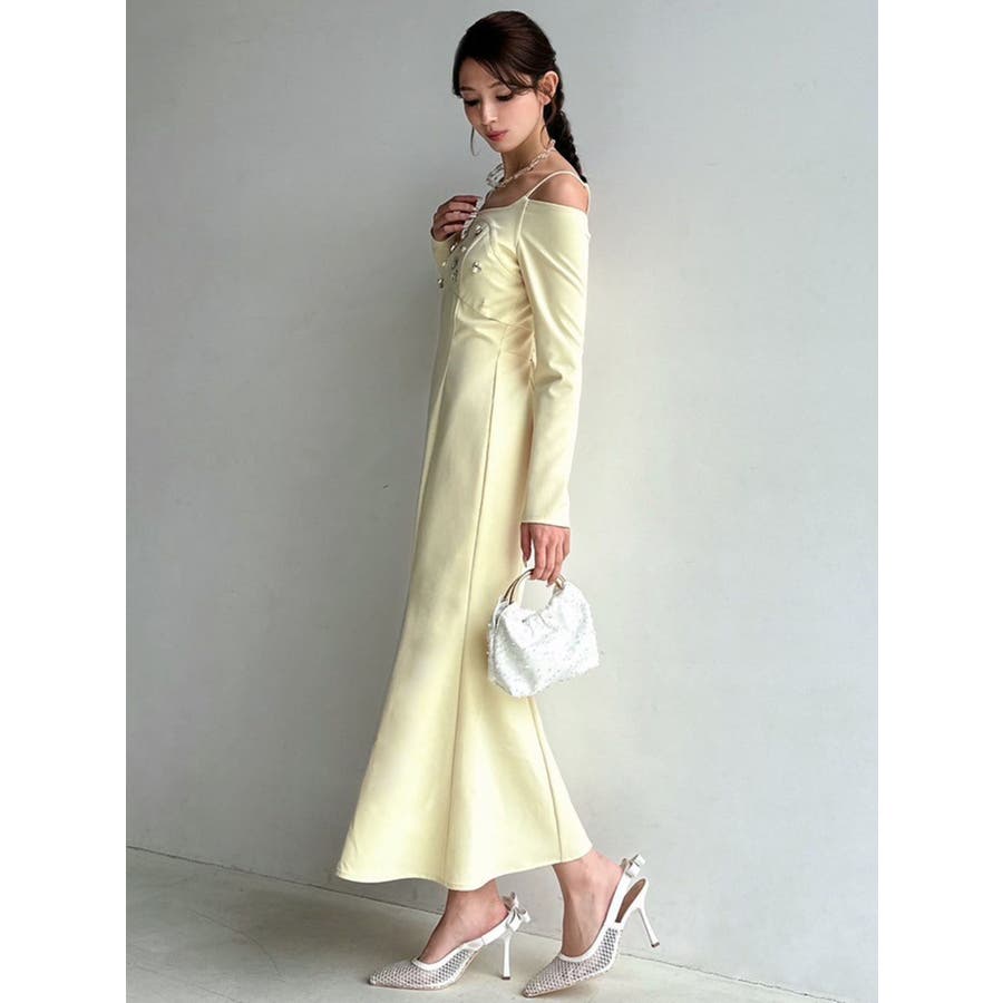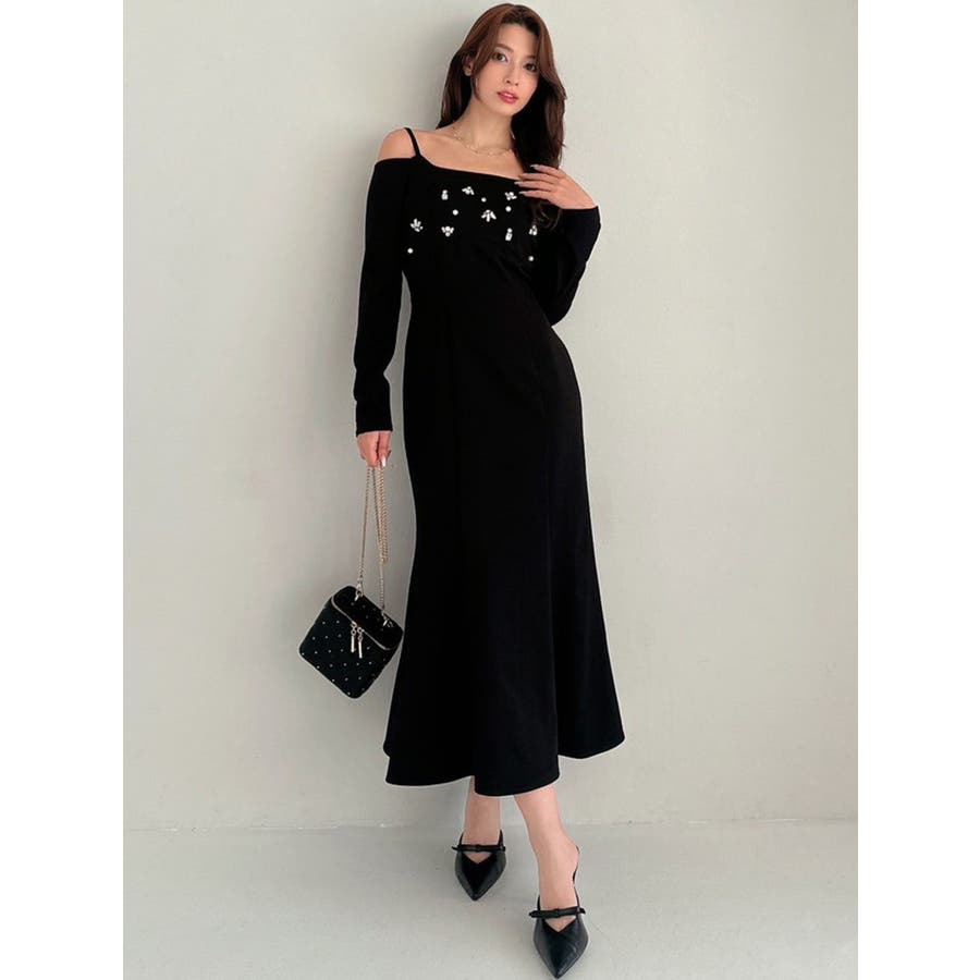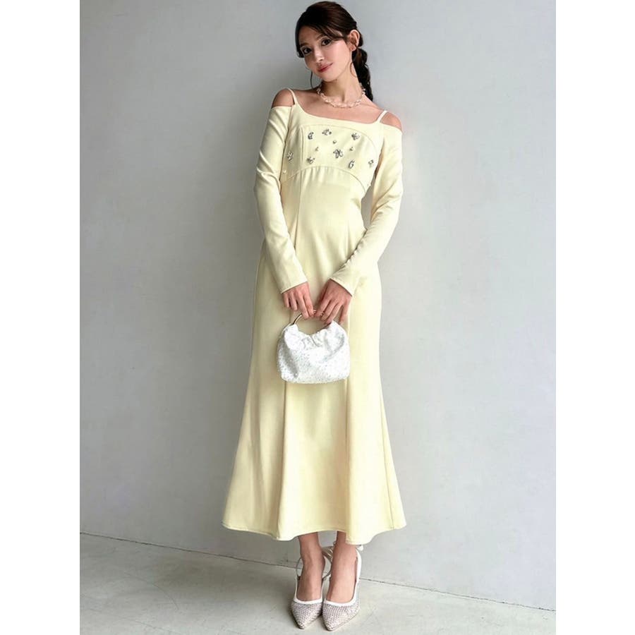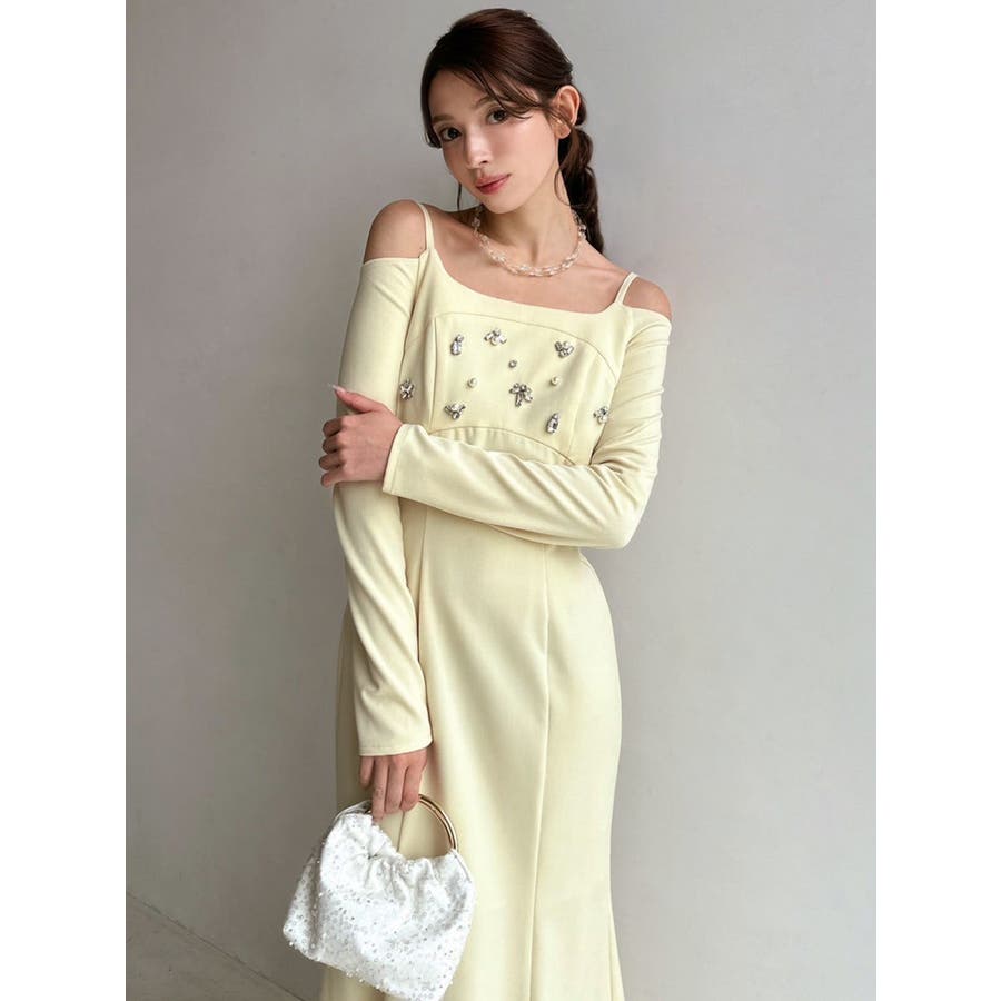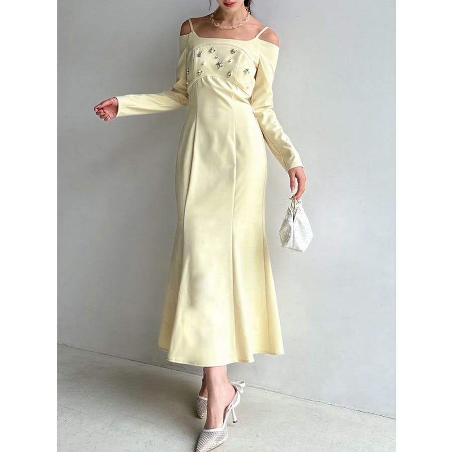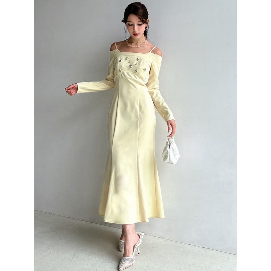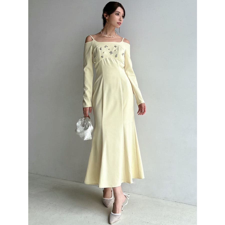 ビジューの煌めきがアクセントになるワンピース▽デザイン▽バスト周りの立体的に刺繍されたビジューが目を惹くマーメイドワンピース。デコルテと肩をスッキリと開け抜け感のあるフェミニンな仕上がりにしました。オフショルデザインがこれからの季節にピッタリ◎ハイウエストの切り替えとバックゴムの仕様で女性らしいシルエットに。表地の程よい光沢感が上品な雰囲気を演出してくれます。▽カラー▽黒・黄色・青の3色展開。▽スタイリング▽シンプルなデザインにビジューが映えるのでパーティーシーンにもオススメ!肌寒い時期はアウターを羽織ってもフロントのビジューがアクセントに◎シューズや小物もキレイめなアイテムでまとめるのがオススメです!※着用画像はフラッシュの加減で実際の製品と色味等が異なる場合がございますので、生地のズームアップ画像をご確認ください。※ご利用の端末画面の設定により実際の商品と色味が異なる場合がございます。【商品特徴】透け感:なし伸縮性:なし生地の厚さ:普通サイズ感:普通裏地:なしポケット:なしファスナー:あり(横)