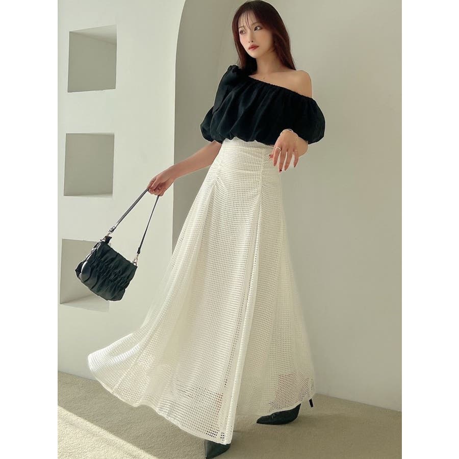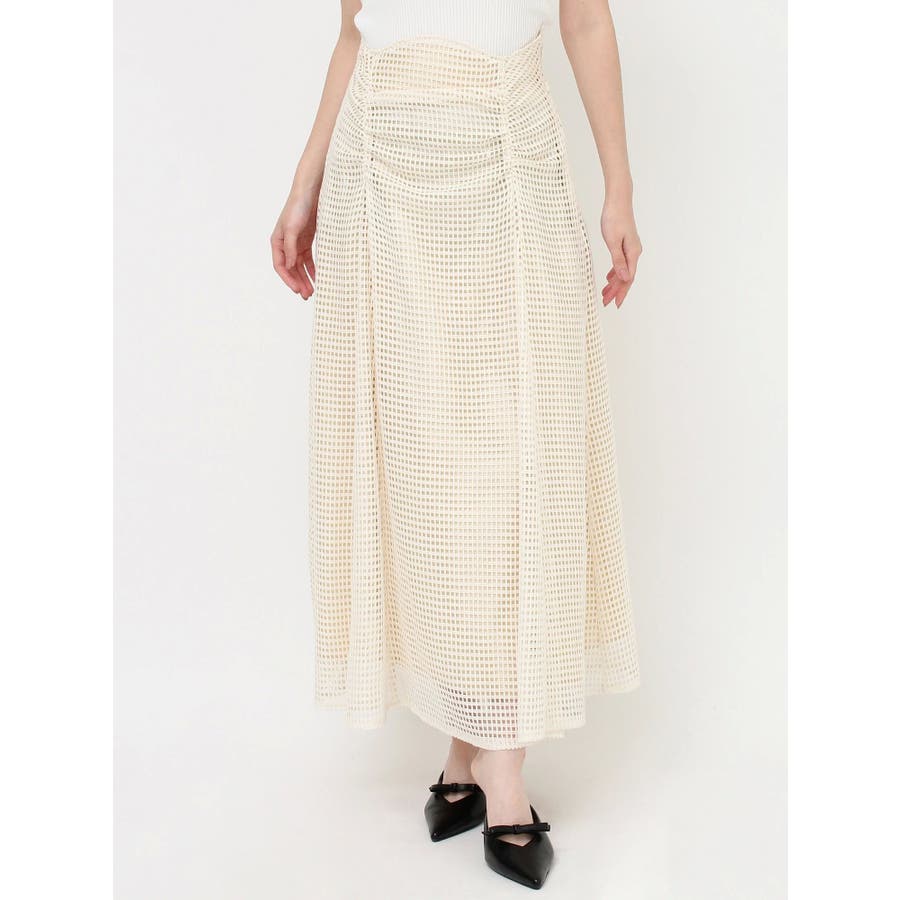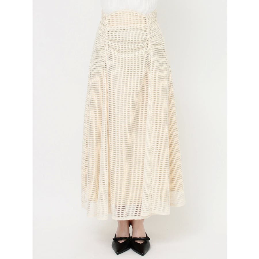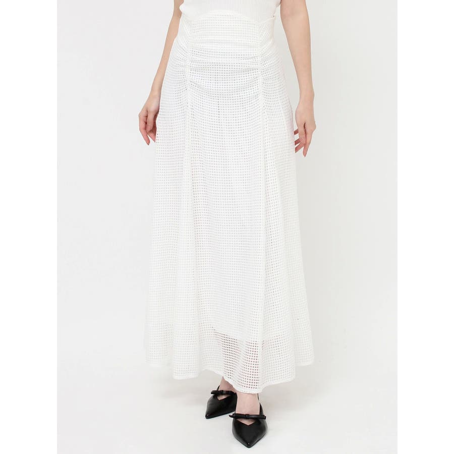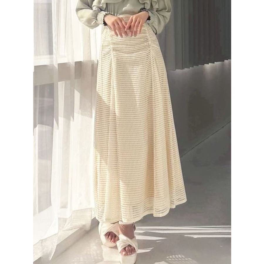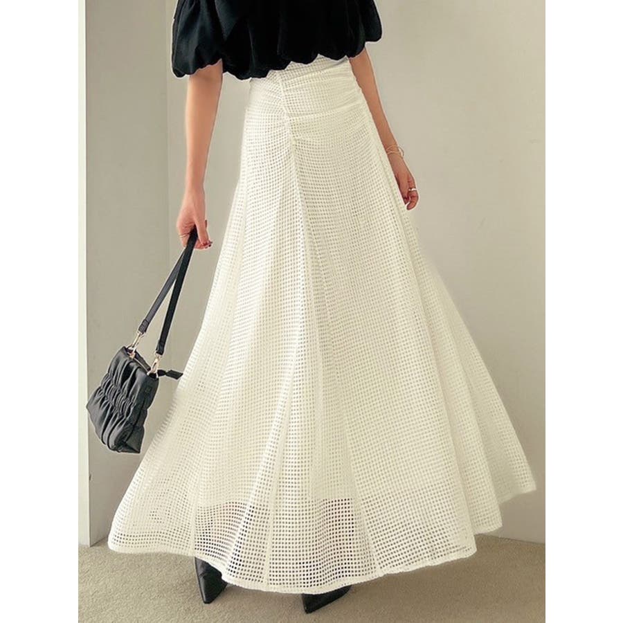 フレアシルエットとレースの透け感が春らしいスカート▽デザイン▽たっぷり寄せたフロントのギャザーがデザインポイント。メッシュ見えのようなレースを使用した軽やかな印象の春アイテム♪ハイウエストに設定してあるのでウエストのホールド感がありフレアスカートでもボディラインを綺麗に拾ってくれます。裾には透け感を出し重たくならないロングスカートです。▽カラー▽白・黒・黄色の3色展開。▽スタイリング▽細見えするウエストデザインなのでトップスをインしたスタイルやクロップド丈のトップス合わせがおすすめ!春から夏にかけて活躍する1枚です。※着用画像はフラッシュの加減で実際の製品と色味等が異なる場合がございますので、生地のズームアップ画像をご確認ください。※ご利用の端末画面の設定により実際の商品と色味が異なる場合がございます。【商品特徴】透け感:なし伸縮性:なし生地の厚さ:普通サイズ感:普通裏地:ありポケット:なし