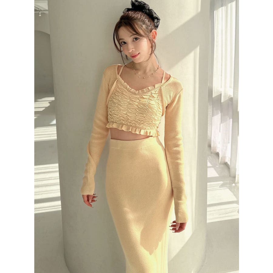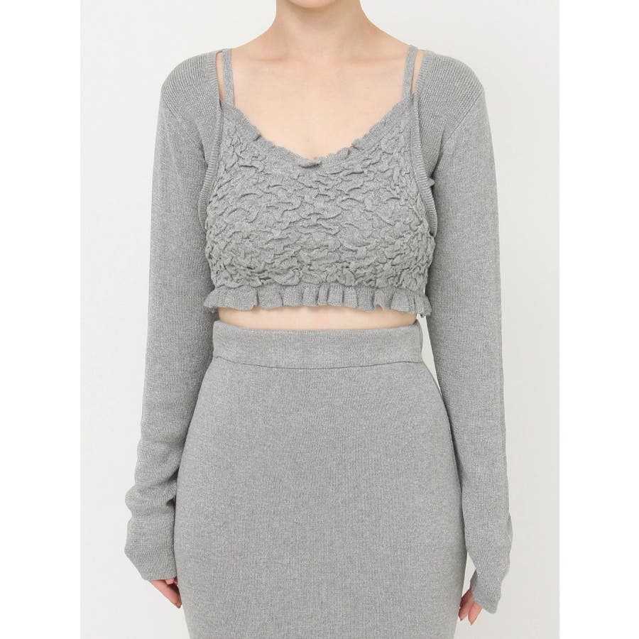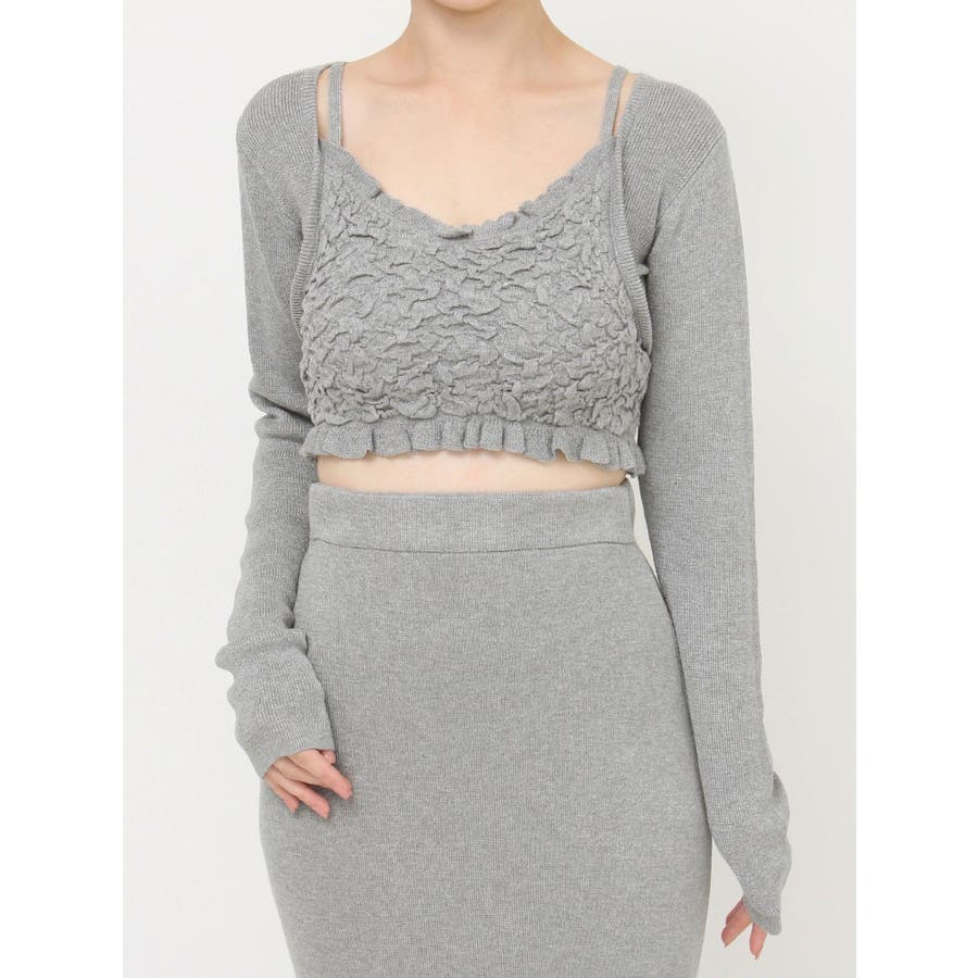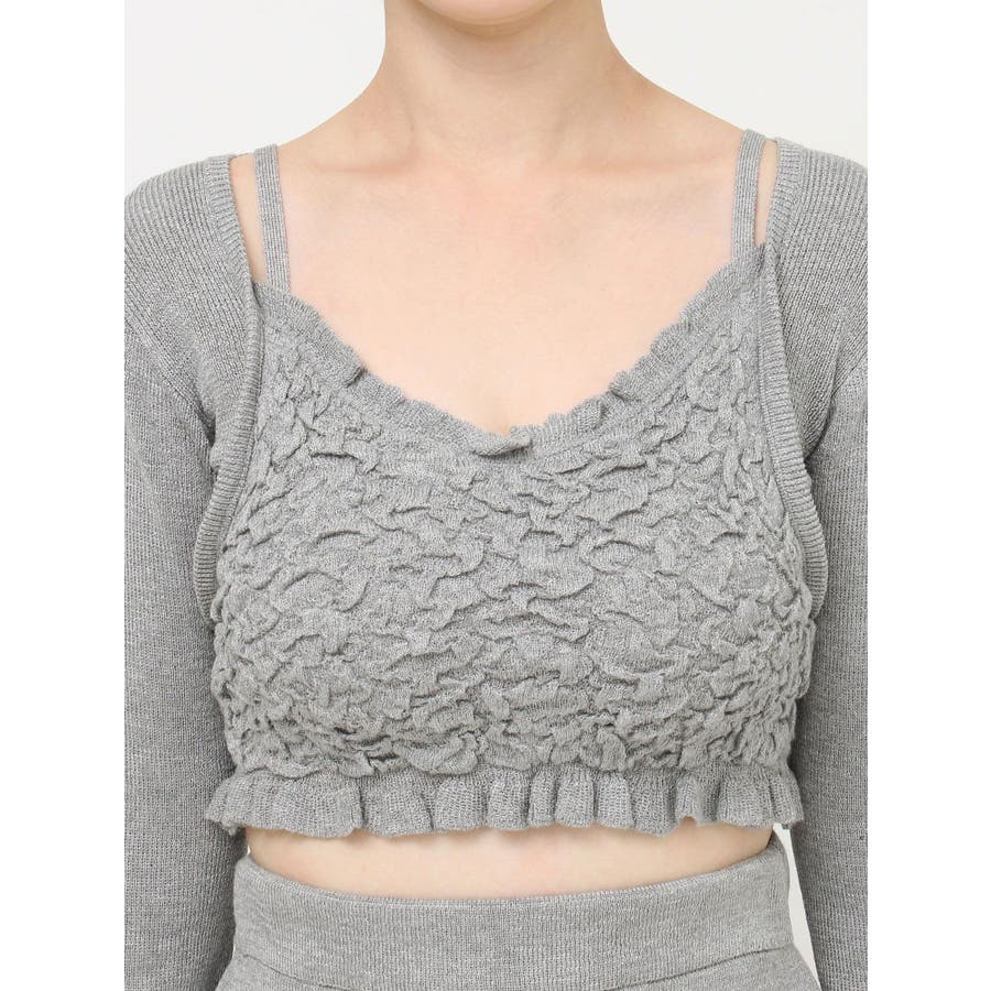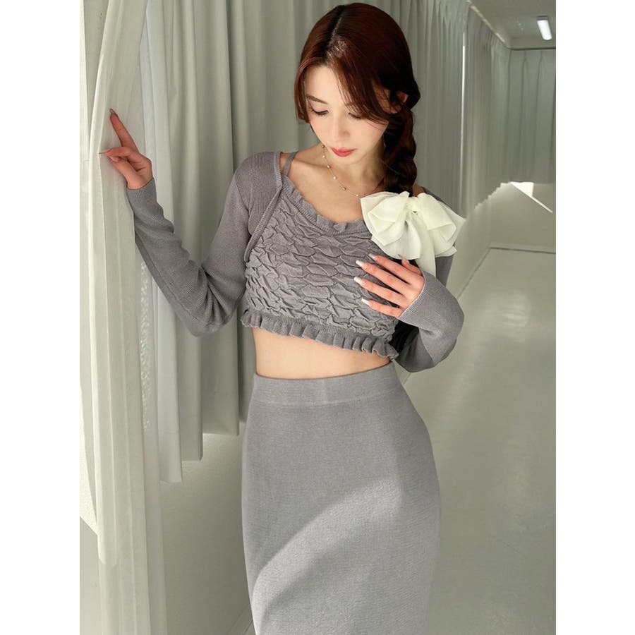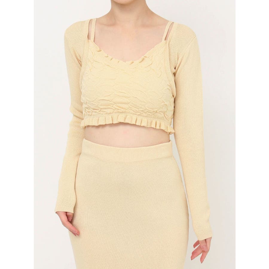 タイトなシルエットで女性らしさUPのニット▽デザイン▽凹凸感のあるデザインがポイントでオシャレ度の上がる1着。キャミとカーディガンのレイヤード見えデザインでこなれ感をプラス。Vネックで顔周りをスッキリ見せ、タイトでボディにフィットするので1枚で女性らしい雰囲気に仕上がります。▽カラー▽ライトグレー・黄色・ネイビーの3色展開。▽スタイリング▽同色のニットスカートと合わせたセットアップ着用が一気にレディなコーデに。クロップド丈なので上半身をコンパクトに見せ、スタイルアップが叶います。【セットアップアイテムはコチラ】152520809301:タイトロングスカート※着用画像はフラッシュの加減で実際の製品と色味等が異なる場合がございますので、生地のズームアップ画像をご確認ください。※ご利用の端末画面の設定により実際の商品と色味が異なる場合がございます。【商品特徴】透け感:なし伸縮性:あり生地の厚さ:普通サイズ感:細身裏地:なしポケット:なし