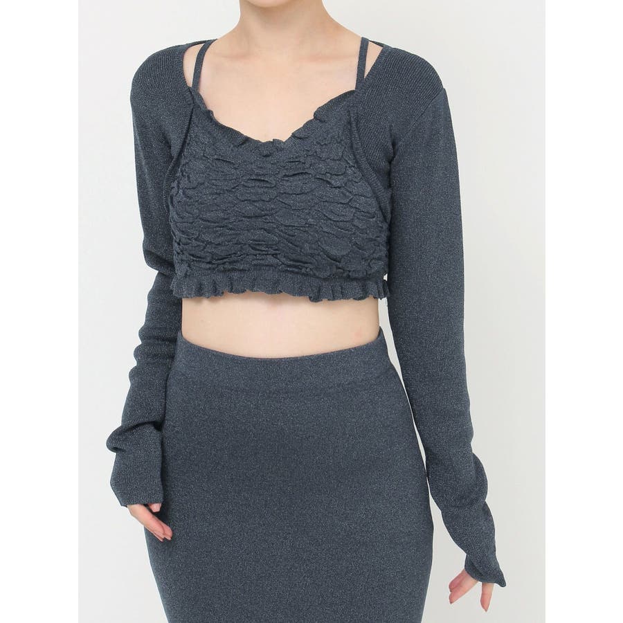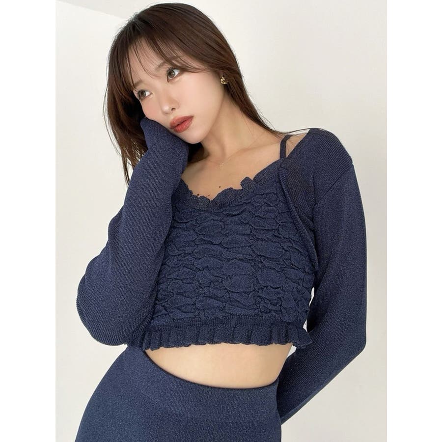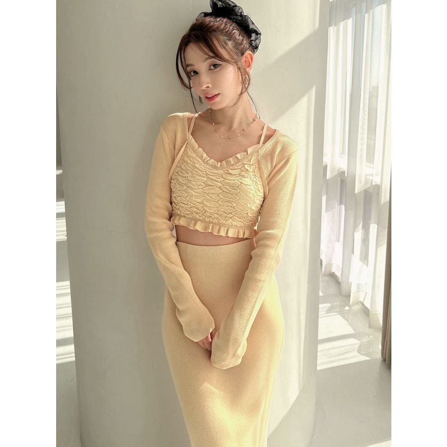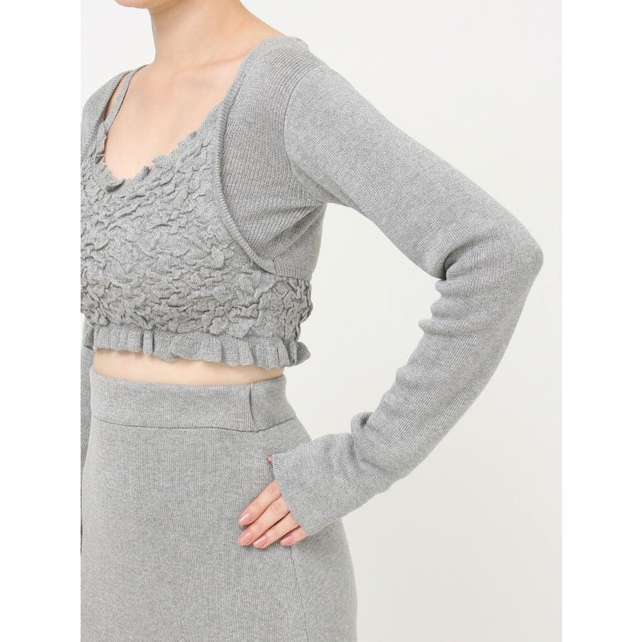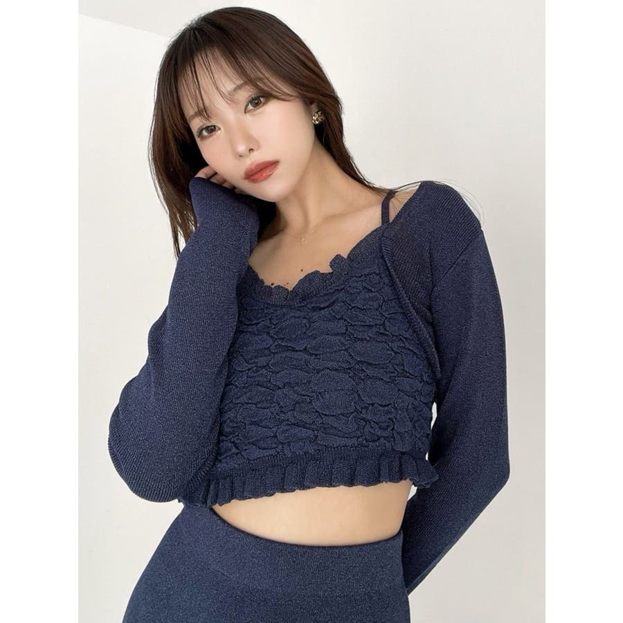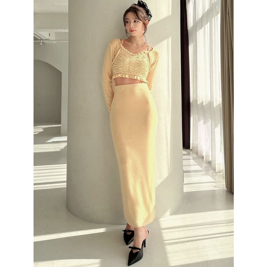 タイトなシルエットで女性らしさUPのニット▽デザイン▽凹凸感のあるデザインがポイントでオシャレ度の上がる1着。キャミとカーディガンのレイヤード見えデザインでこなれ感をプラス。Vネックで顔周りをスッキリ見せ、タイトでボディにフィットするので1枚で女性らしい雰囲気に仕上がります。▽カラー▽ライトグレー・黄色・ネイビーの3色展開。▽スタイリング▽同色のニットスカートと合わせたセットアップ着用が一気にレディなコーデに。クロップド丈なので上半身をコンパクトに見せ、スタイルアップが叶います。【セットアップアイテムはコチラ】152520809301:タイトロングスカート※着用画像はフラッシュの加減で実際の製品と色味等が異なる場合がございますので、生地のズームアップ画像をご確認ください。※ご利用の端末画面の設定により実際の商品と色味が異なる場合がございます。【商品特徴】透け感:なし伸縮性:あり生地の厚さ:普通サイズ感:細身裏地:なしポケット:なし
