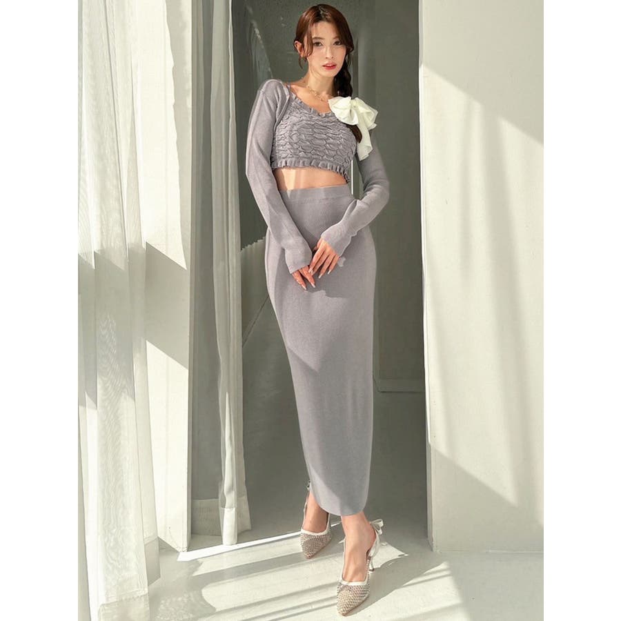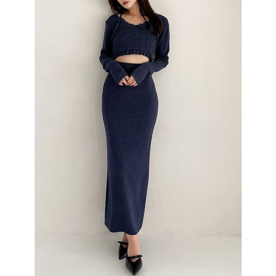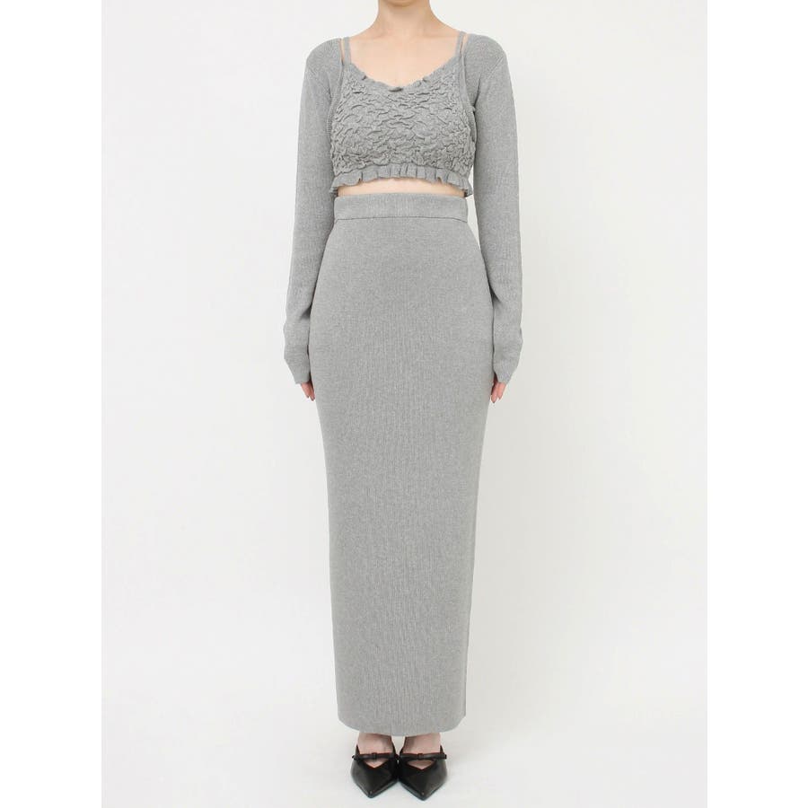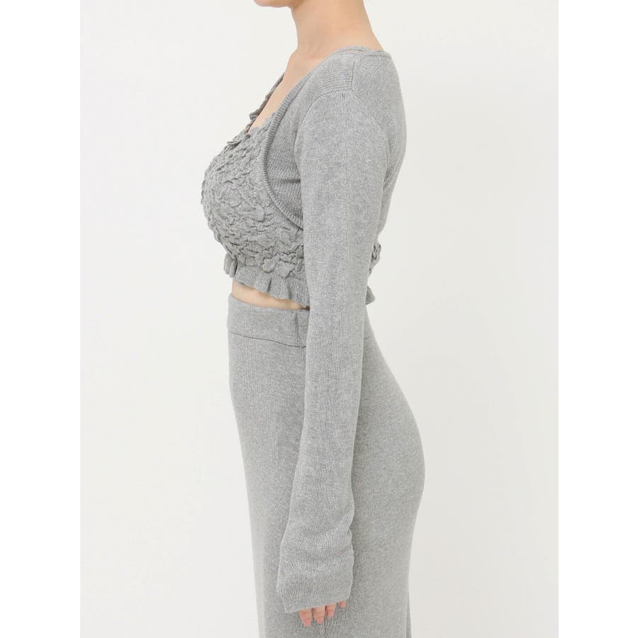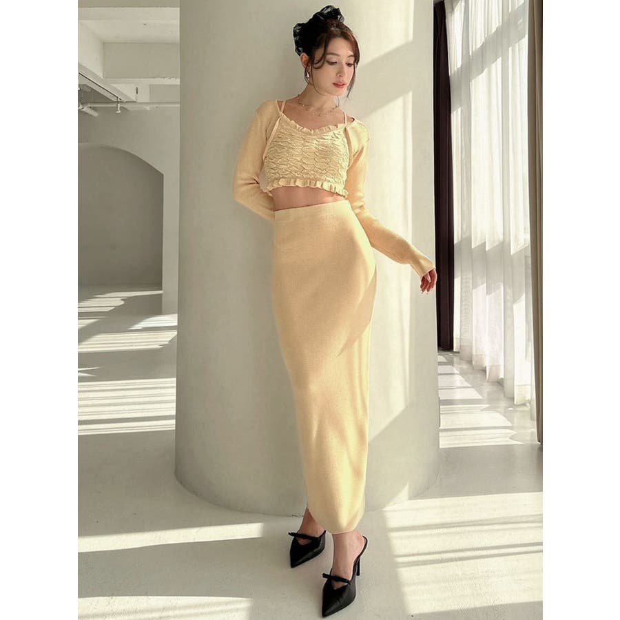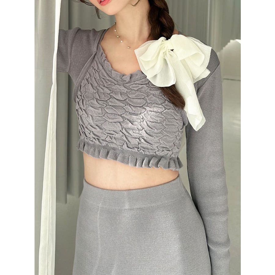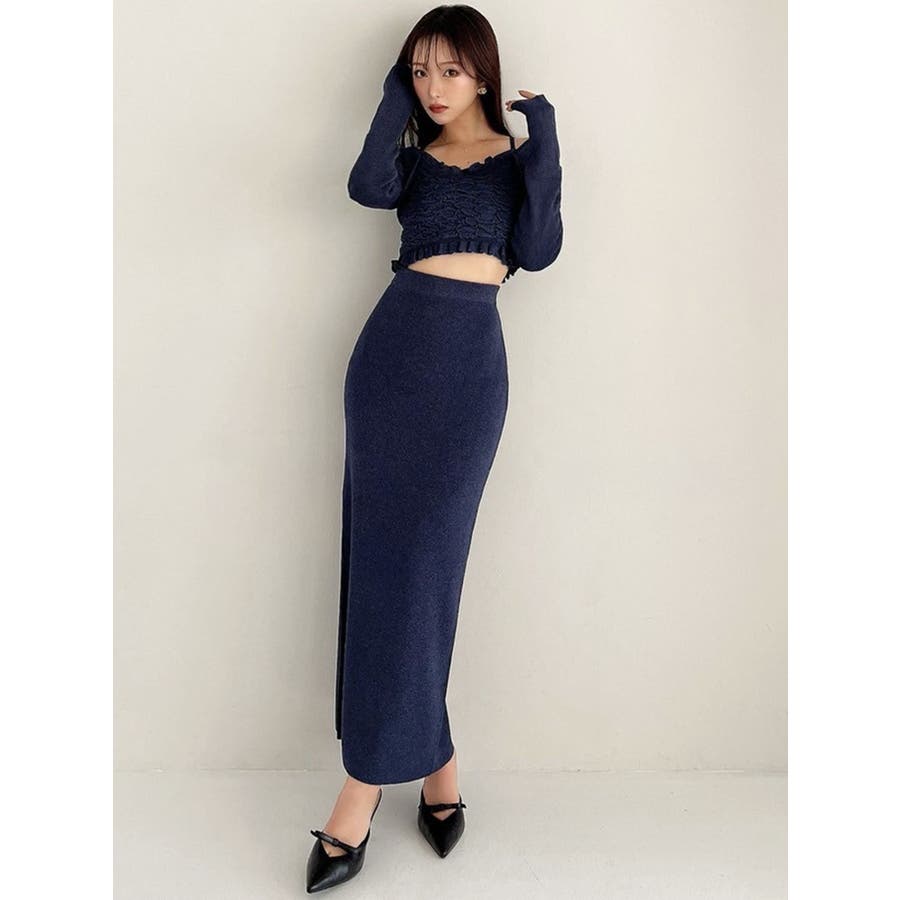 タイトなシルエットで女性らしさUPのニット▽デザイン▽凹凸感のあるデザインがポイントでオシャレ度の上がる1着。キャミとカーディガンのレイヤード見えデザインでこなれ感をプラス。Vネックで顔周りをスッキリ見せ、タイトでボディにフィットするので1枚で女性らしい雰囲気に仕上がります。▽カラー▽ライトグレー・黄色・ネイビーの3色展開。▽スタイリング▽同色のニットスカートと合わせたセットアップ着用が一気にレディなコーデに。クロップド丈なので上半身をコンパクトに見せ、スタイルアップが叶います。【セットアップアイテムはコチラ】152520809301:タイトロングスカート※着用画像はフラッシュの加減で実際の製品と色味等が異なる場合がございますので、生地のズームアップ画像をご確認ください。※ご利用の端末画面の設定により実際の商品と色味が異なる場合がございます。【商品特徴】透け感:なし伸縮性:あり生地の厚さ:普通サイズ感:細身裏地:なしポケット:なし