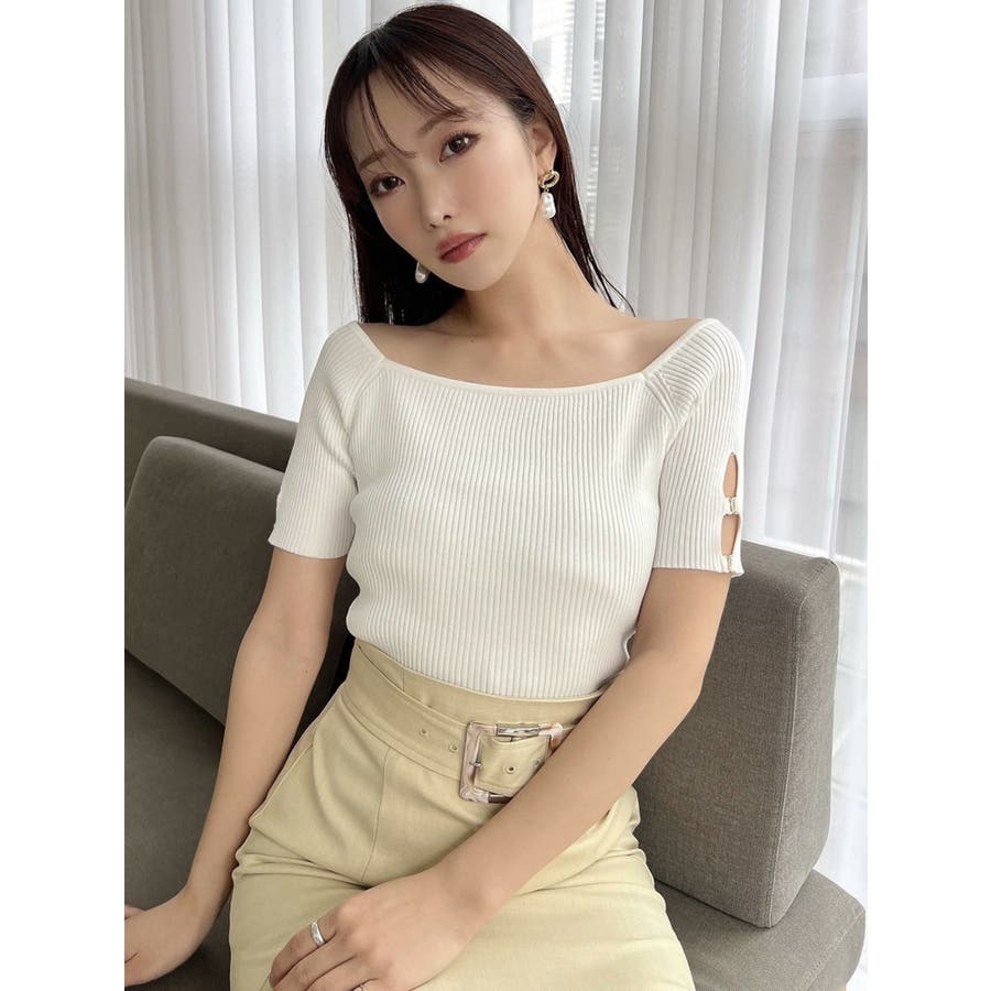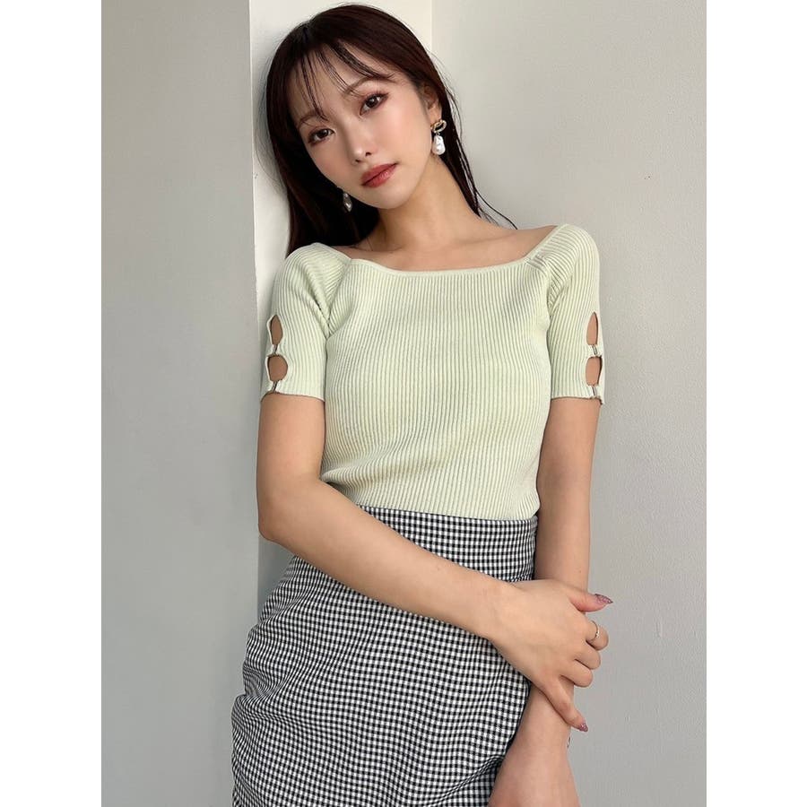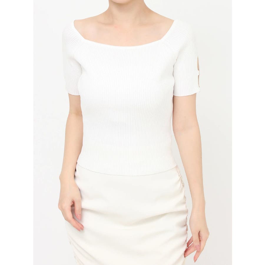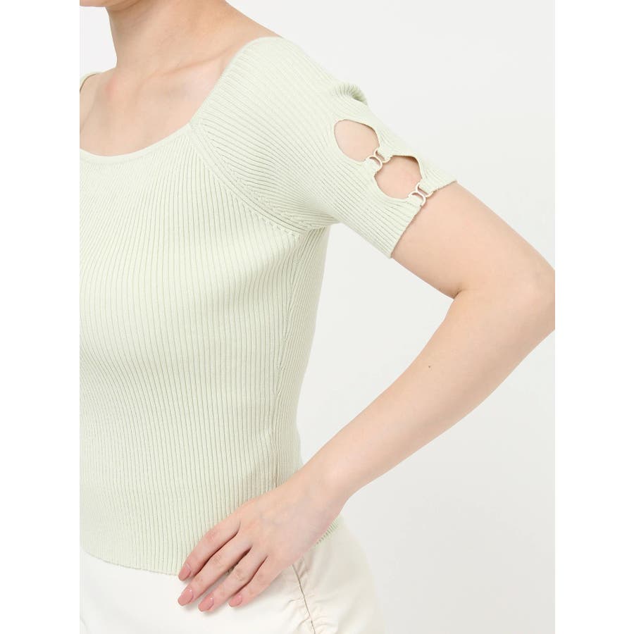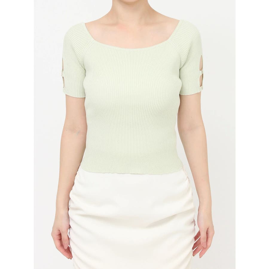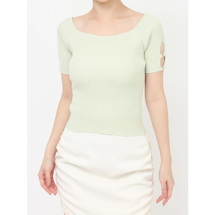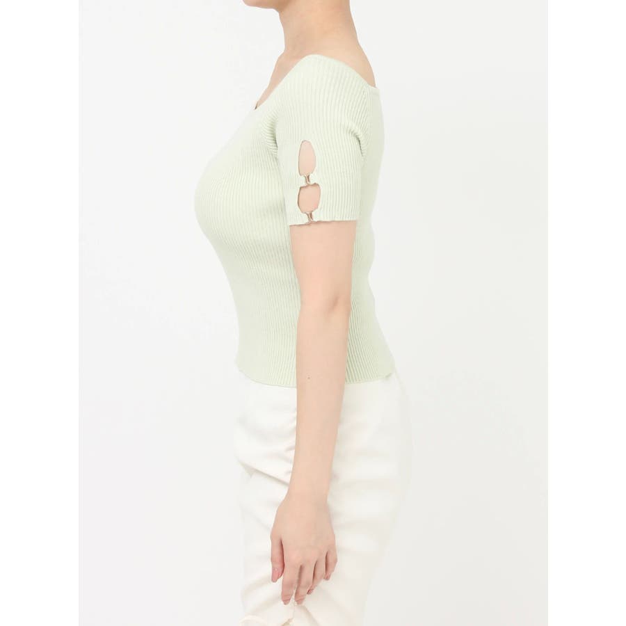 袖のデザインがコーデのアクセントになるベーシックニット▽デザイン▽ベーシックなスクエアネックのニット。袖口に部分にゴールドの金具を付け、さりげないワンポイントをプラス♪さりげない肌見せデザインがシーズンムードをプラスします。リブで編み立てたのでボディラインにフィットしタイトなシルエットに仕上がります。▽カラー▽白・黒・ミントの3色展開。▽スタイリング▽シンプルなデザインでスカートからパンツまでどんなスタイリングにもマッチする着回し力抜群のニット。タイトなサイズ感で薄手の春アウターにもマッチし、夏まで長くお使いいただけます◎※着用画像はフラッシュの加減で実際の製品と色味等が異なる場合がございますので、生地のズームアップ画像をご確認ください。※ご利用の端末画面の設定により実際の商品と色味が異なる場合がございます。【商品特徴】透け感:なし伸縮性:あり生地の厚さ:普通サイズ感:普通裏地:なしポケット:なし