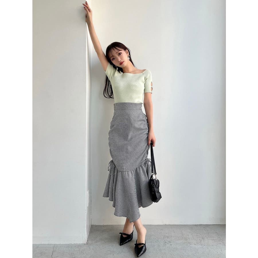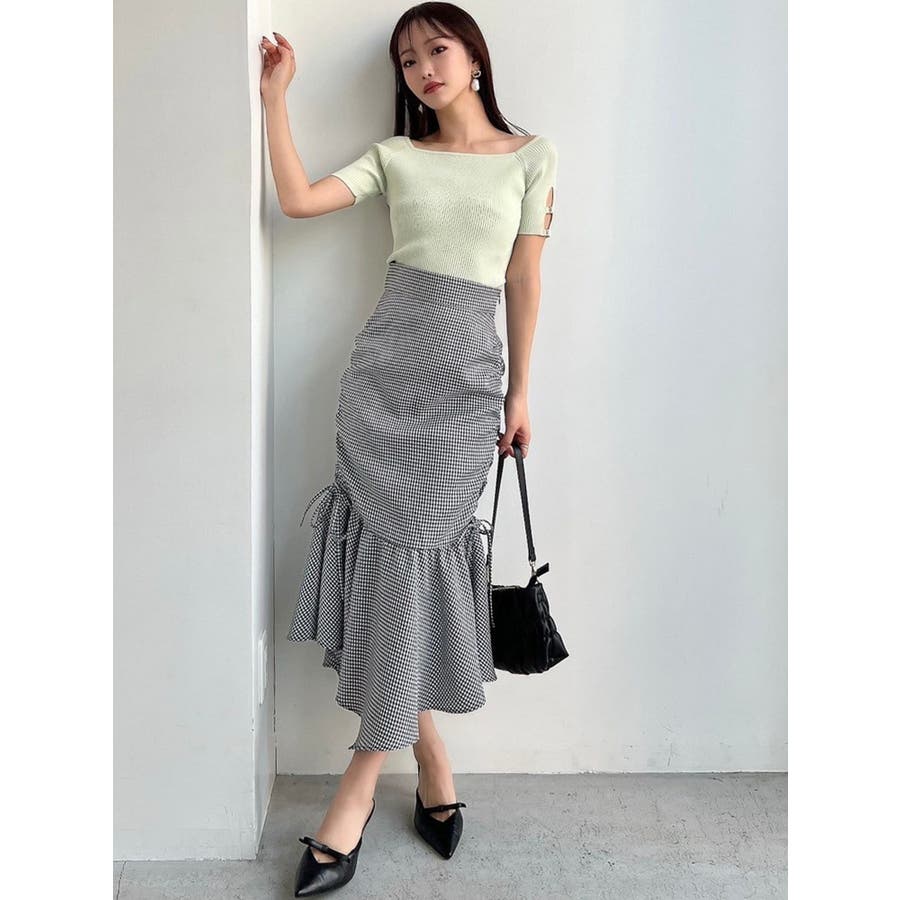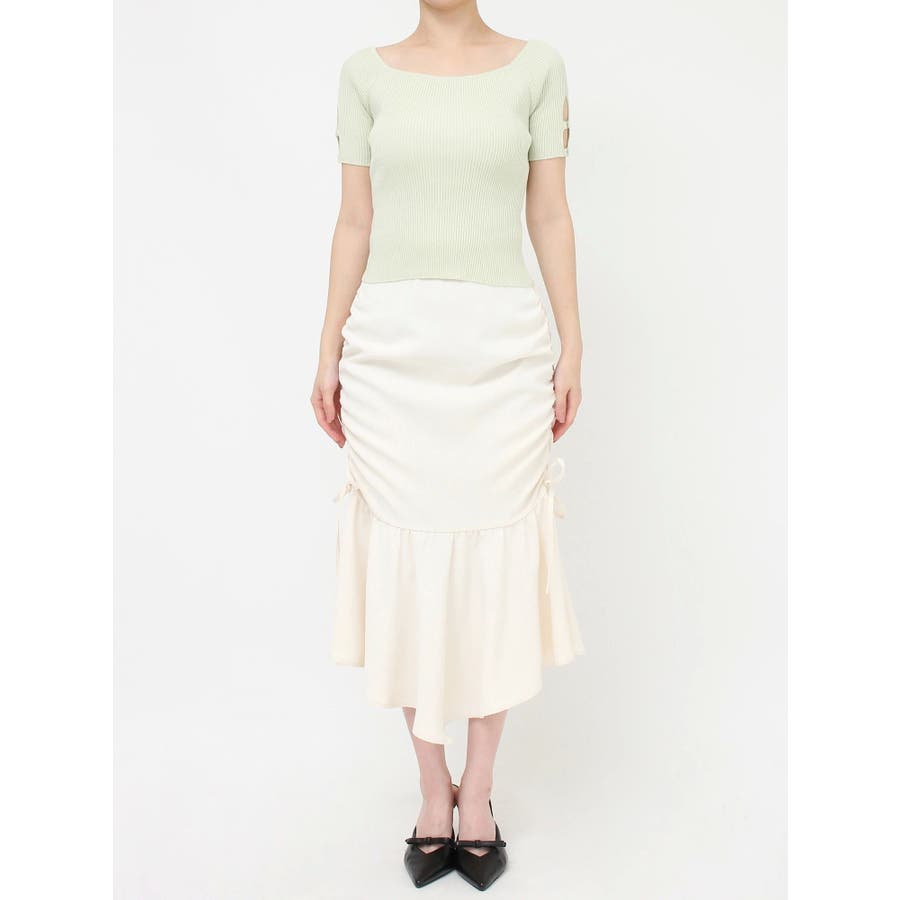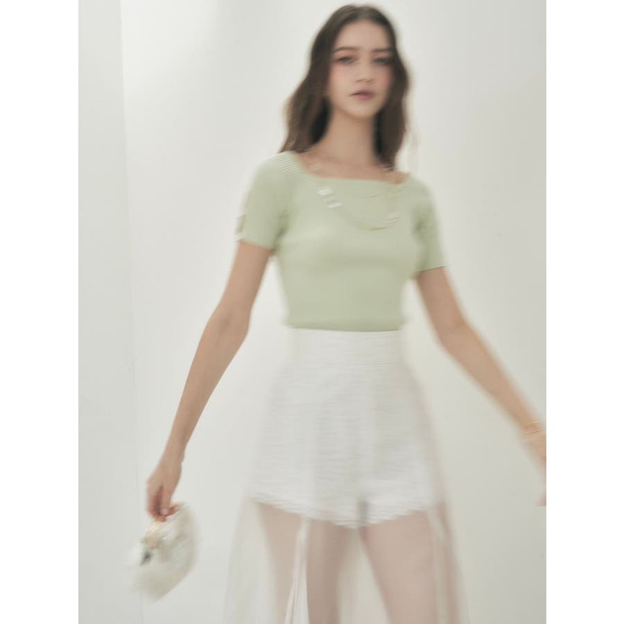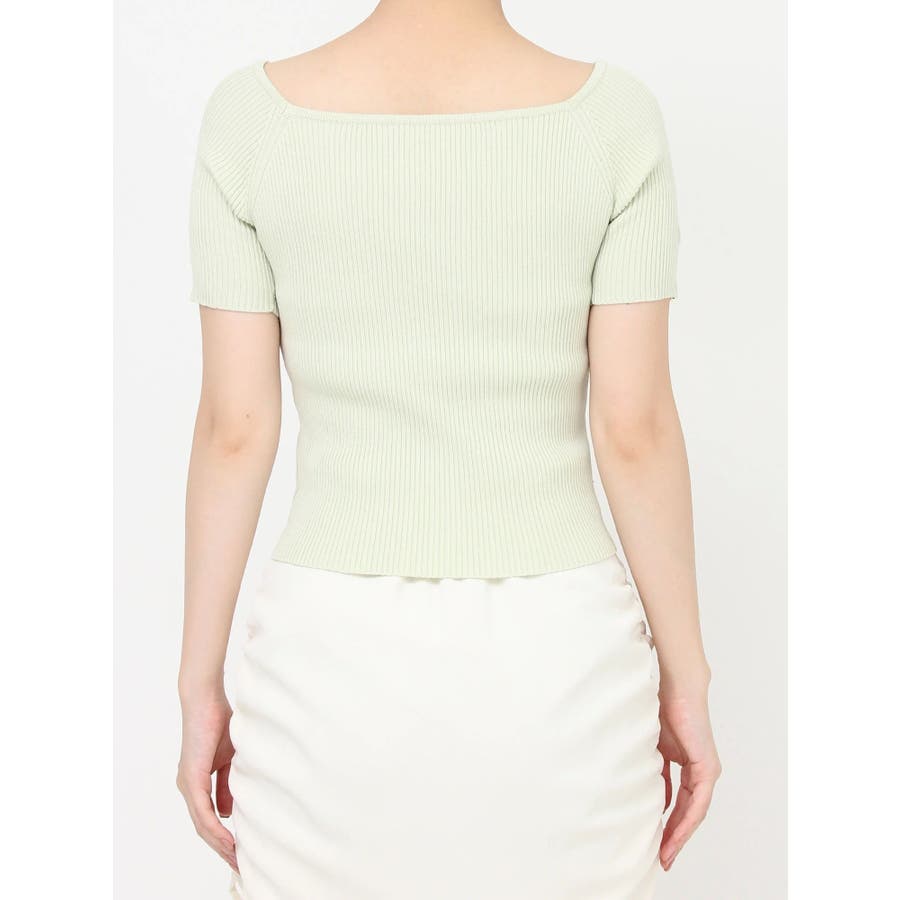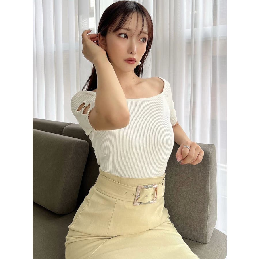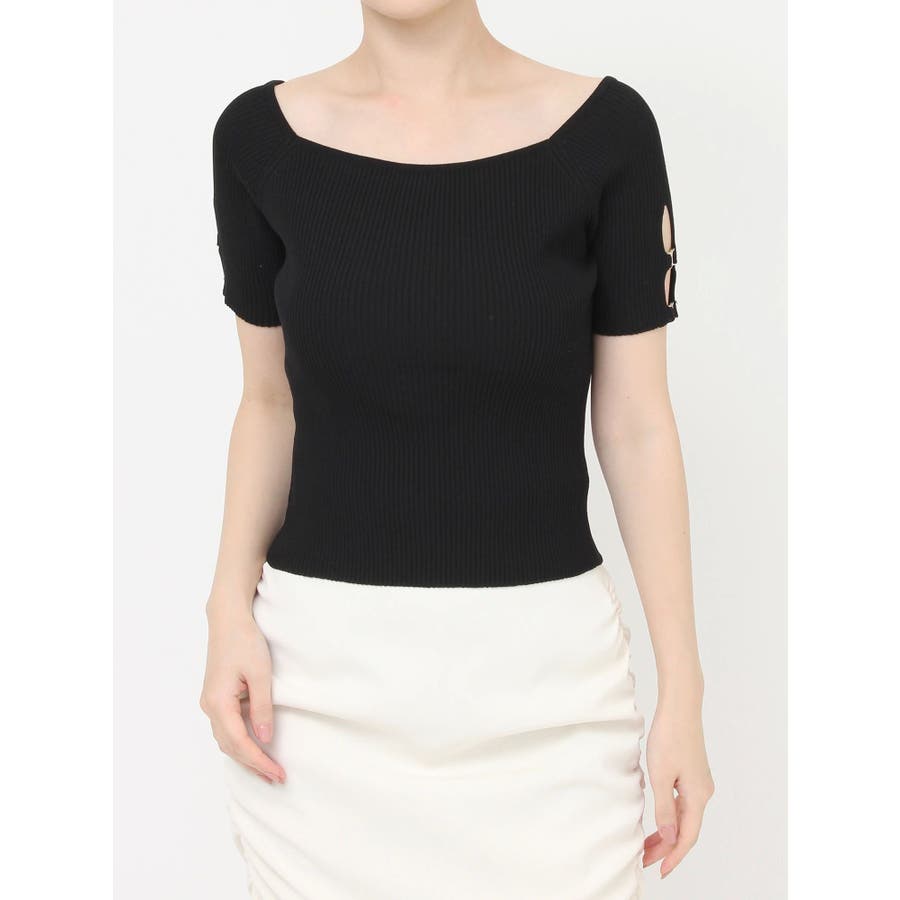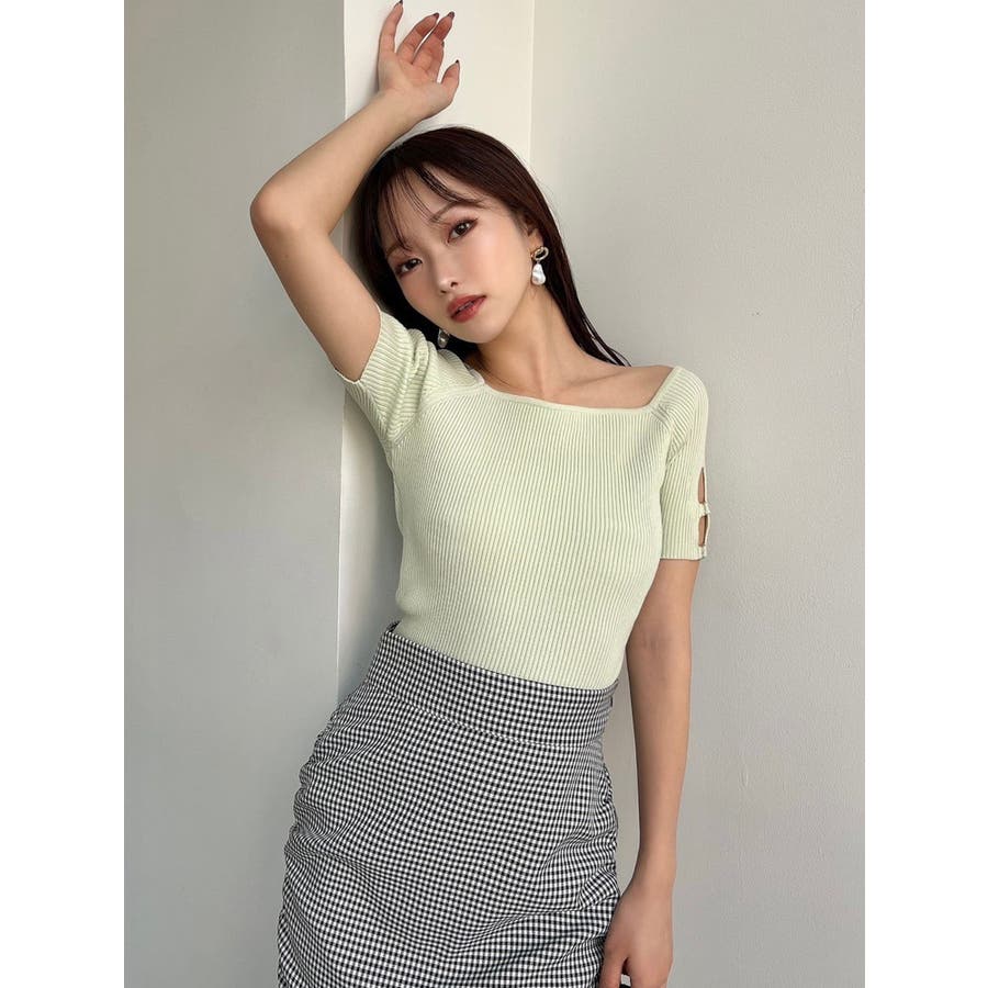 袖のデザインがコーデのアクセントになるベーシックニット▽デザイン▽ベーシックなスクエアネックのニット。袖口に部分にゴールドの金具を付け、さりげないワンポイントをプラス♪さりげない肌見せデザインがシーズンムードをプラスします。リブで編み立てたのでボディラインにフィットしタイトなシルエットに仕上がります。▽カラー▽白・黒・ミントの3色展開。▽スタイリング▽シンプルなデザインでスカートからパンツまでどんなスタイリングにもマッチする着回し力抜群のニット。タイトなサイズ感で薄手の春アウターにもマッチし、夏まで長くお使いいただけます◎※着用画像はフラッシュの加減で実際の製品と色味等が異なる場合がございますので、生地のズームアップ画像をご確認ください。※ご利用の端末画面の設定により実際の商品と色味が異なる場合がございます。【商品特徴】透け感:なし伸縮性:あり生地の厚さ:普通サイズ感:普通裏地:なしポケット:なし