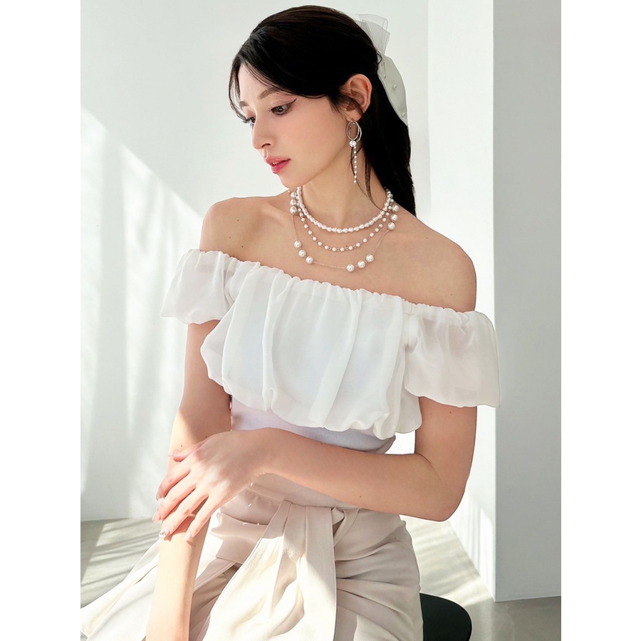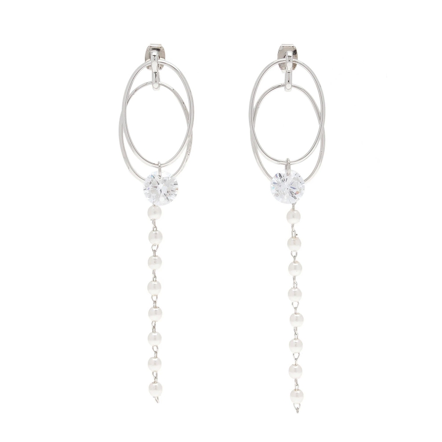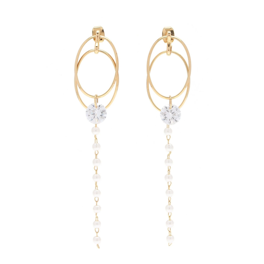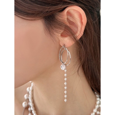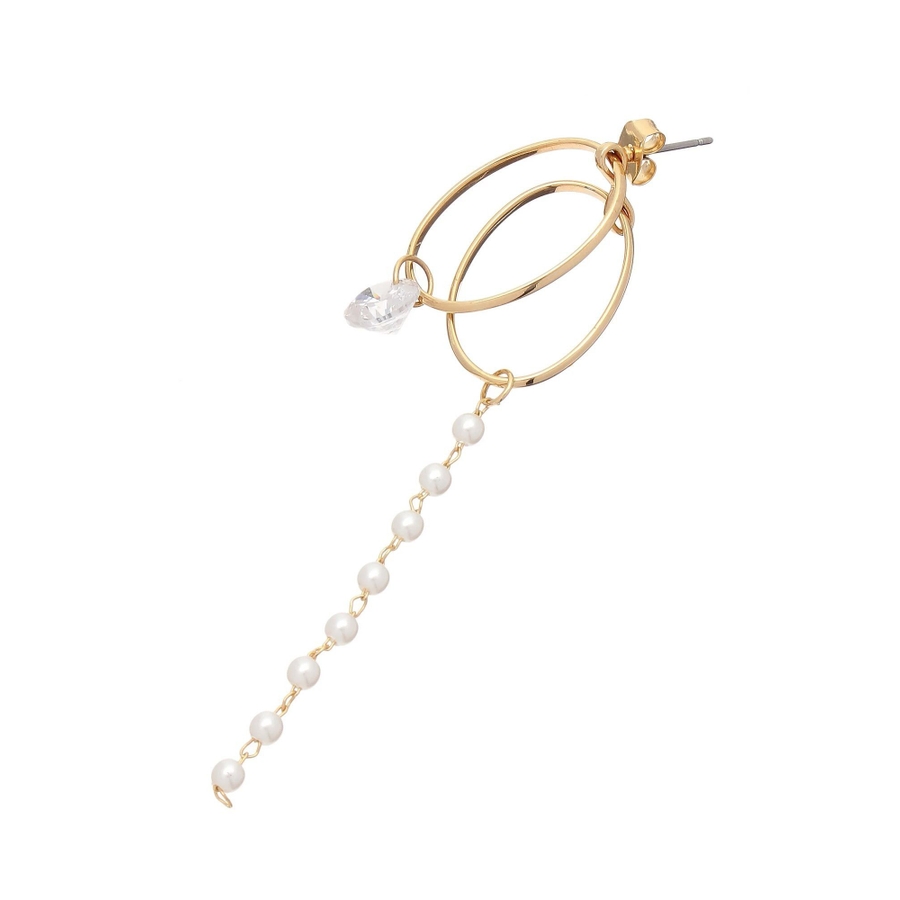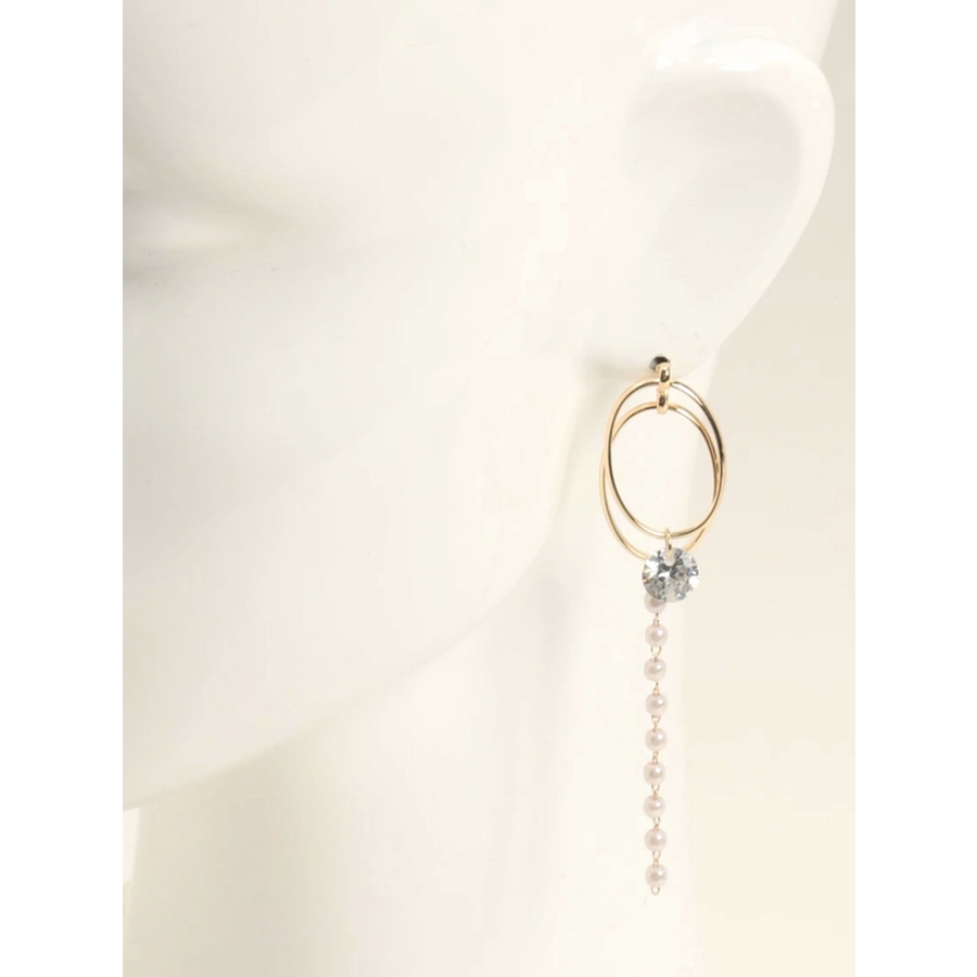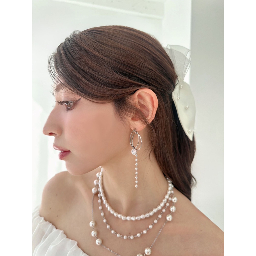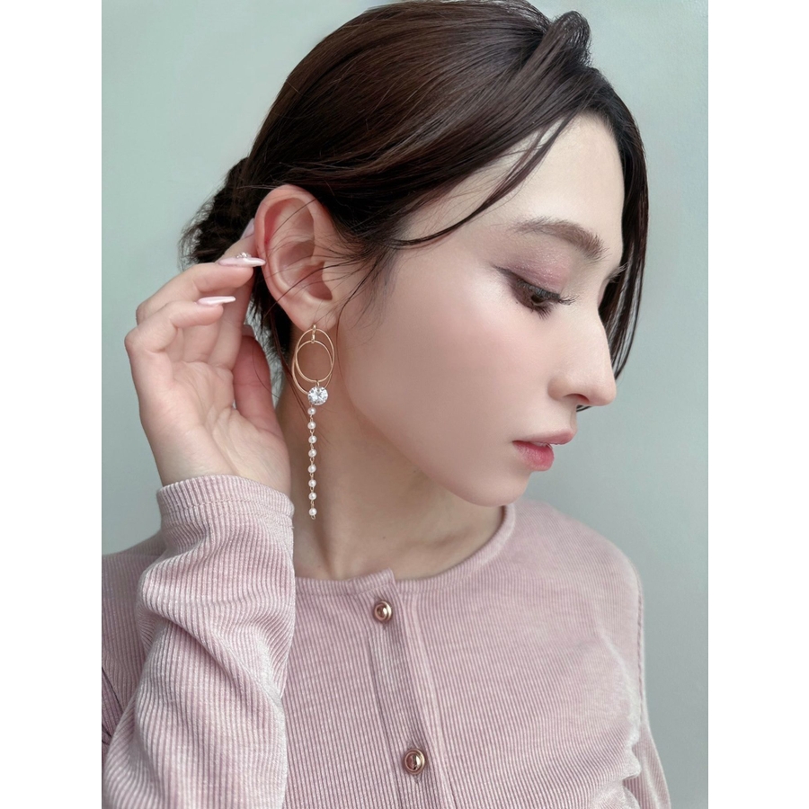 二つに重なったサークルモチーフの下から揺れるパールチェーンとストーンが上品ながらも華やかな印象を与えてくれるピアスです。シンプルなデザインでつけやすいサイズ感で、フェミニンやカジュアルスタイリングと様々なコーデと合わせやすいピアスです。