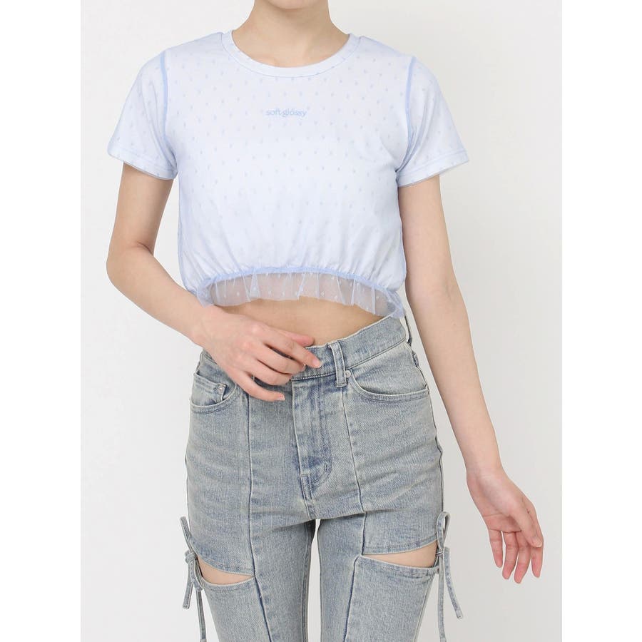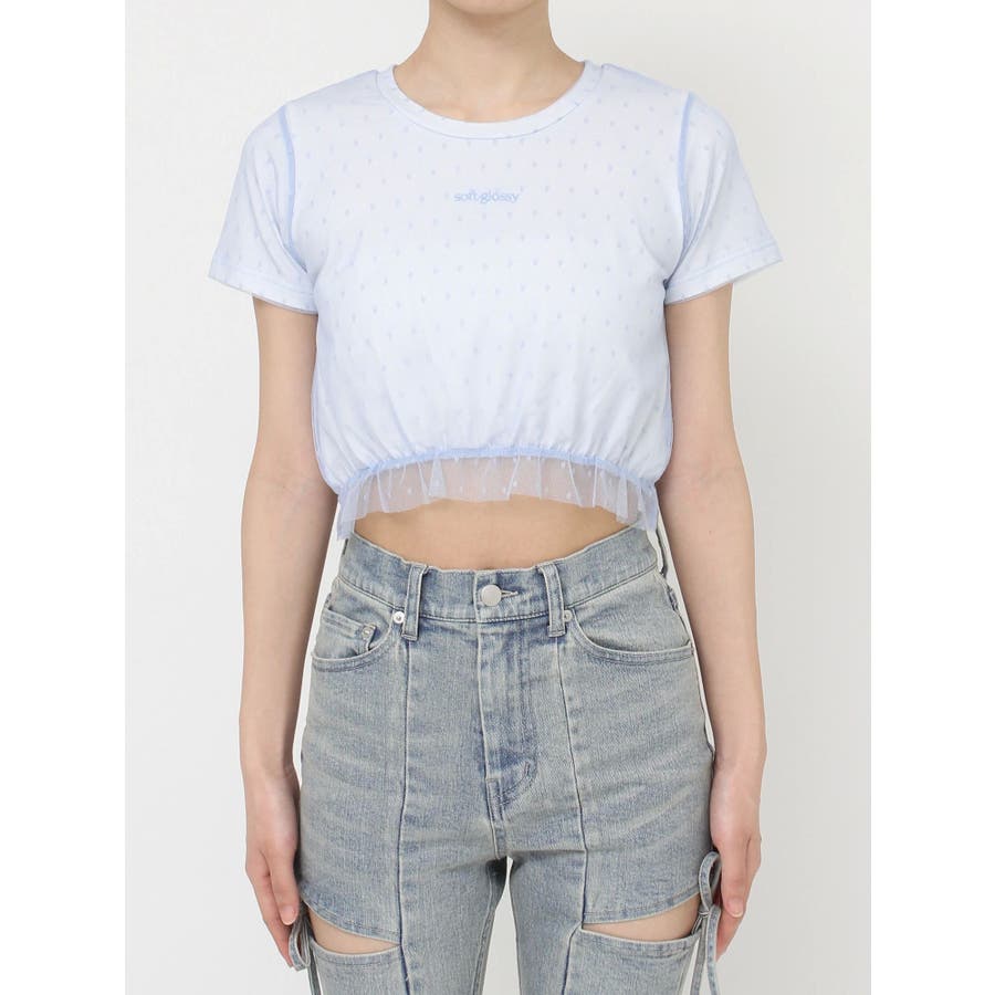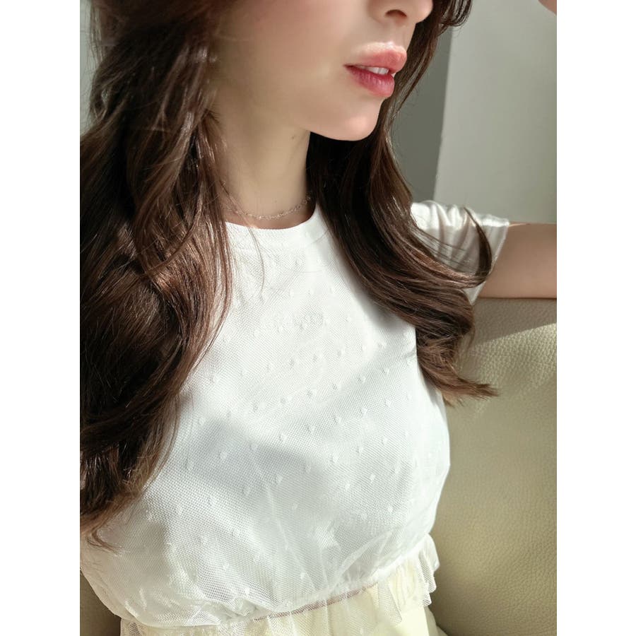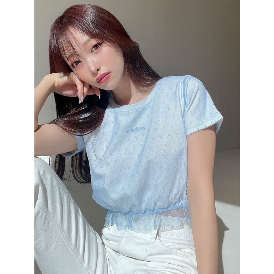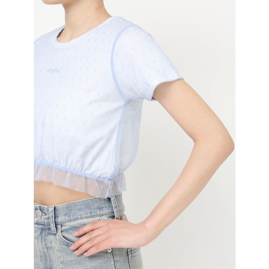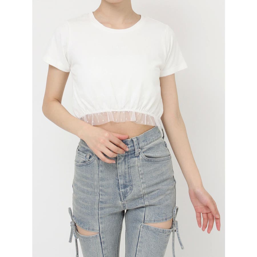 ドット柄のチュールを重ねたデザインTシャツ▽デザイン▽裾にはフリルを付け可愛いらしさをプラスし、カジュアルすぎず使いやすいコンパクトTシャツに。今季のシーズンコンセプトのロゴをさりげなく刺繍しワンポイントに。クロップド丈で裾は絞ったことでスタイルアップ効果抜群!▽カラー▽白・黒・青の3色展開。▽スタイリング▽ハイウエストボトム合わせがおすすめ!Tシャツだけどカジュアルすぎず、キレイ目なボトムにも合わせやすいアイテムです。※着用画像はフラッシュの加減で実際の製品と色味等が異なる場合がございますので、生地のズームアップ画像をご確認ください。※ご利用の端末画面の設定により実際の商品と色味が異なる場合がございます。【商品特徴】透け感:なし伸縮性:あり生地の厚さ:普通サイズ感:普通裏地:なしポケット:なし