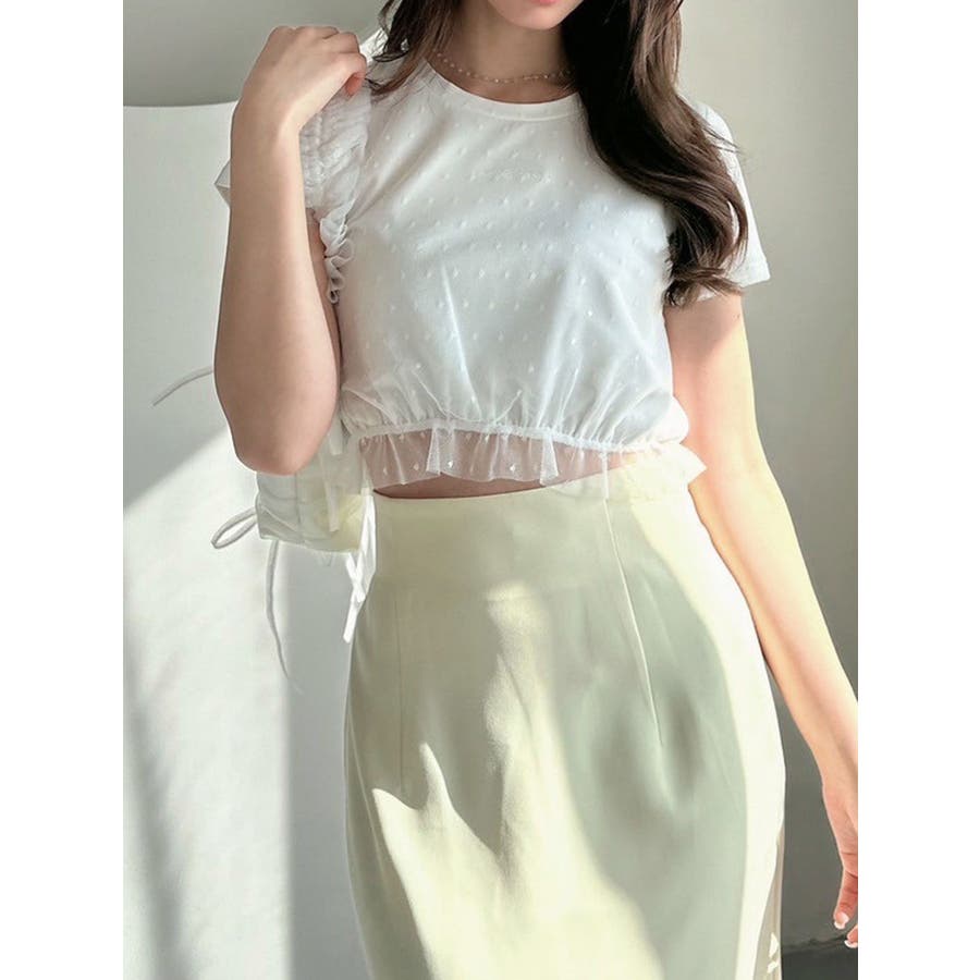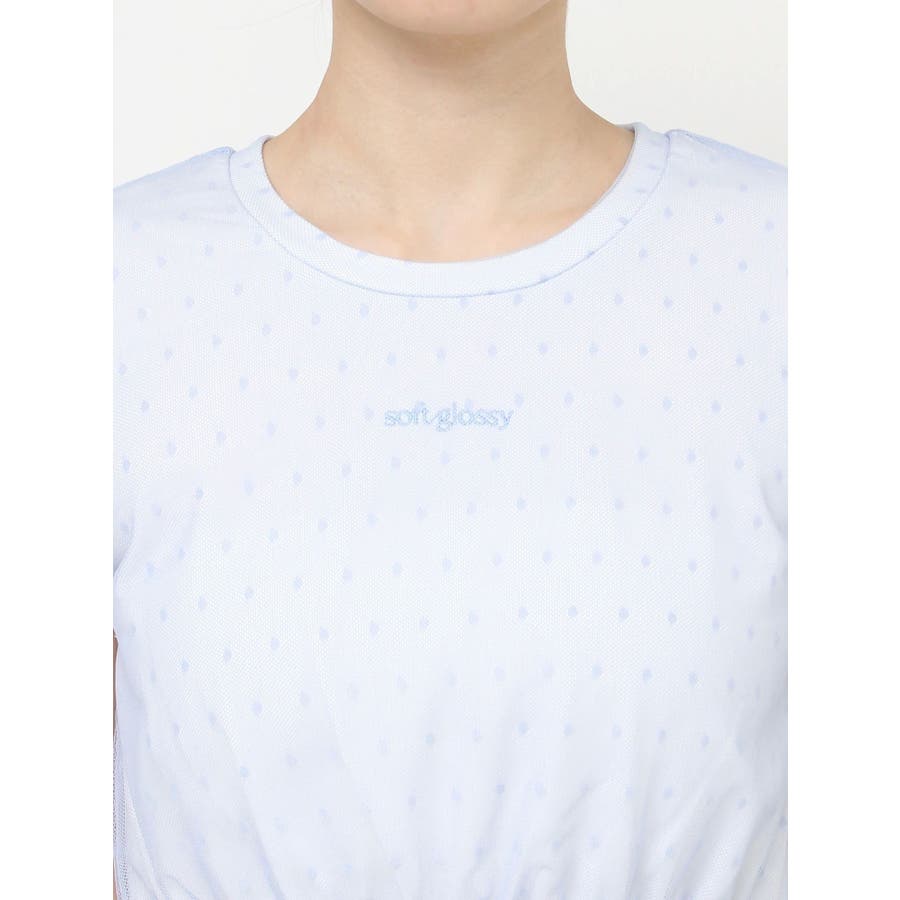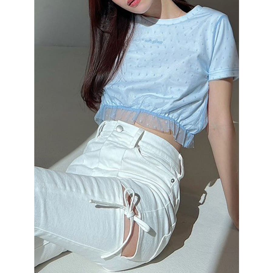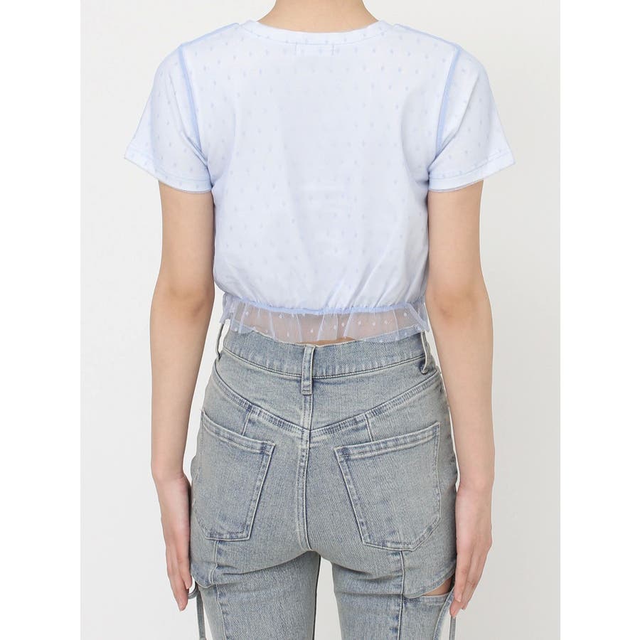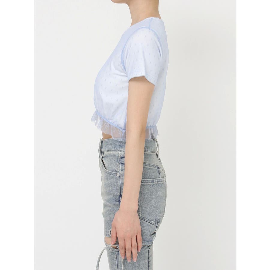 ドット柄のチュールを重ねたデザインTシャツ▽デザイン▽裾にはフリルを付け可愛いらしさをプラスし、カジュアルすぎず使いやすいコンパクトTシャツに。今季のシーズンコンセプトのロゴをさりげなく刺繍しワンポイントに。クロップド丈で裾は絞ったことでスタイルアップ効果抜群!▽カラー▽白・黒・青の3色展開。▽スタイリング▽ハイウエストボトム合わせがおすすめ!Tシャツだけどカジュアルすぎず、キレイ目なボトムにも合わせやすいアイテムです。※着用画像はフラッシュの加減で実際の製品と色味等が異なる場合がございますので、生地のズームアップ画像をご確認ください。※ご利用の端末画面の設定により実際の商品と色味が異なる場合がございます。【商品特徴】透け感:なし伸縮性:あり生地の厚さ:普通サイズ感:普通裏地:なしポケット:なし
